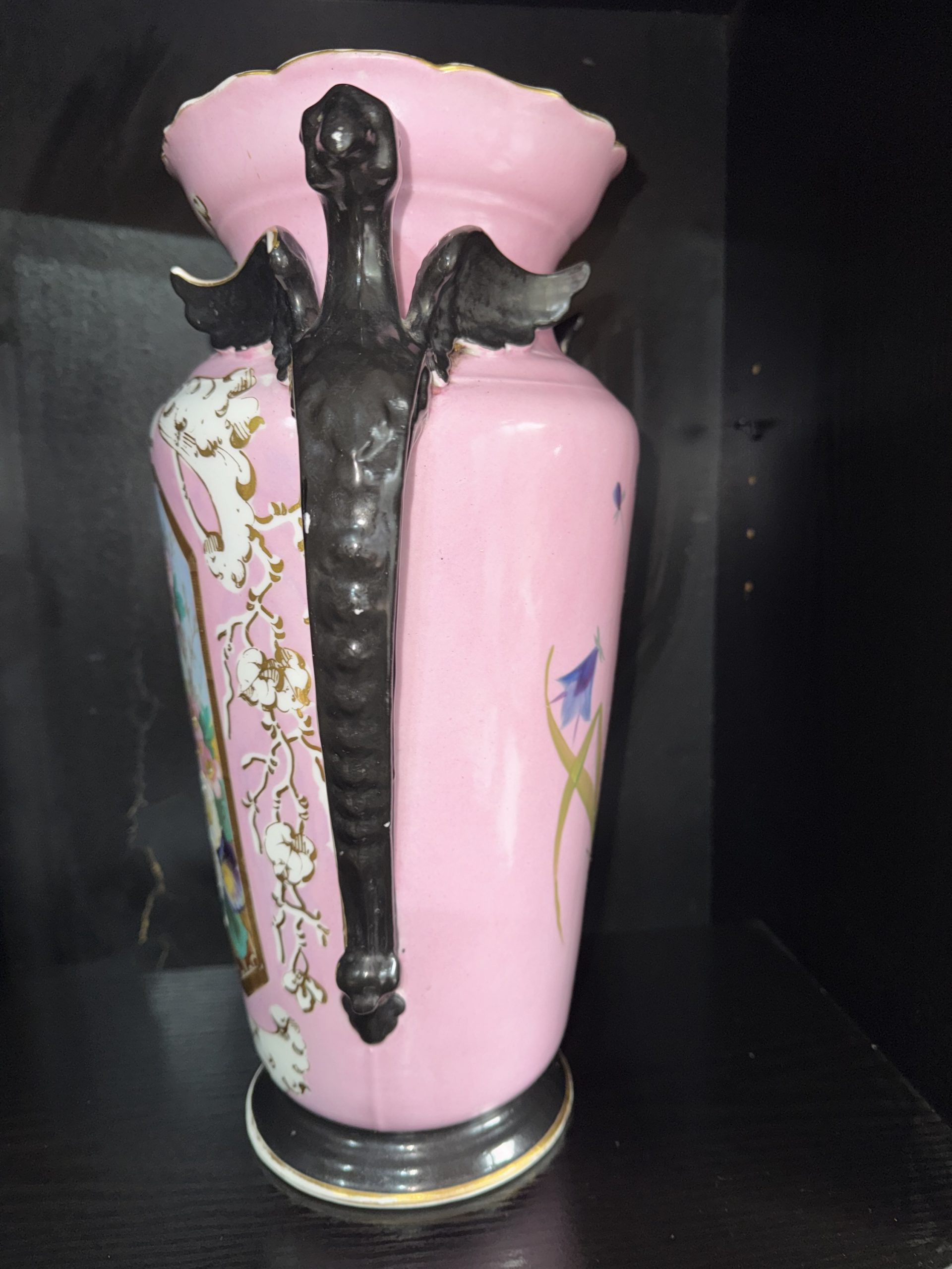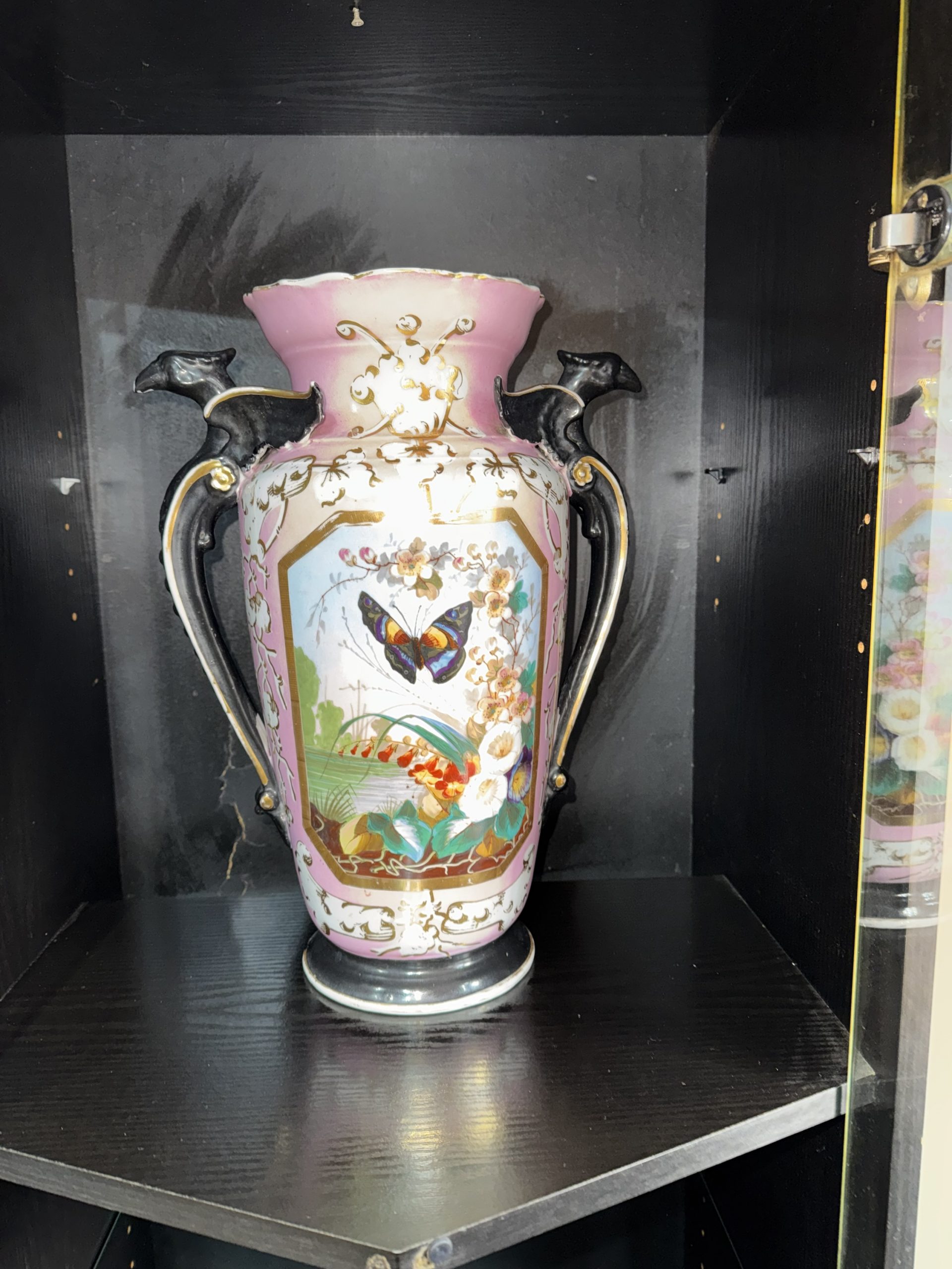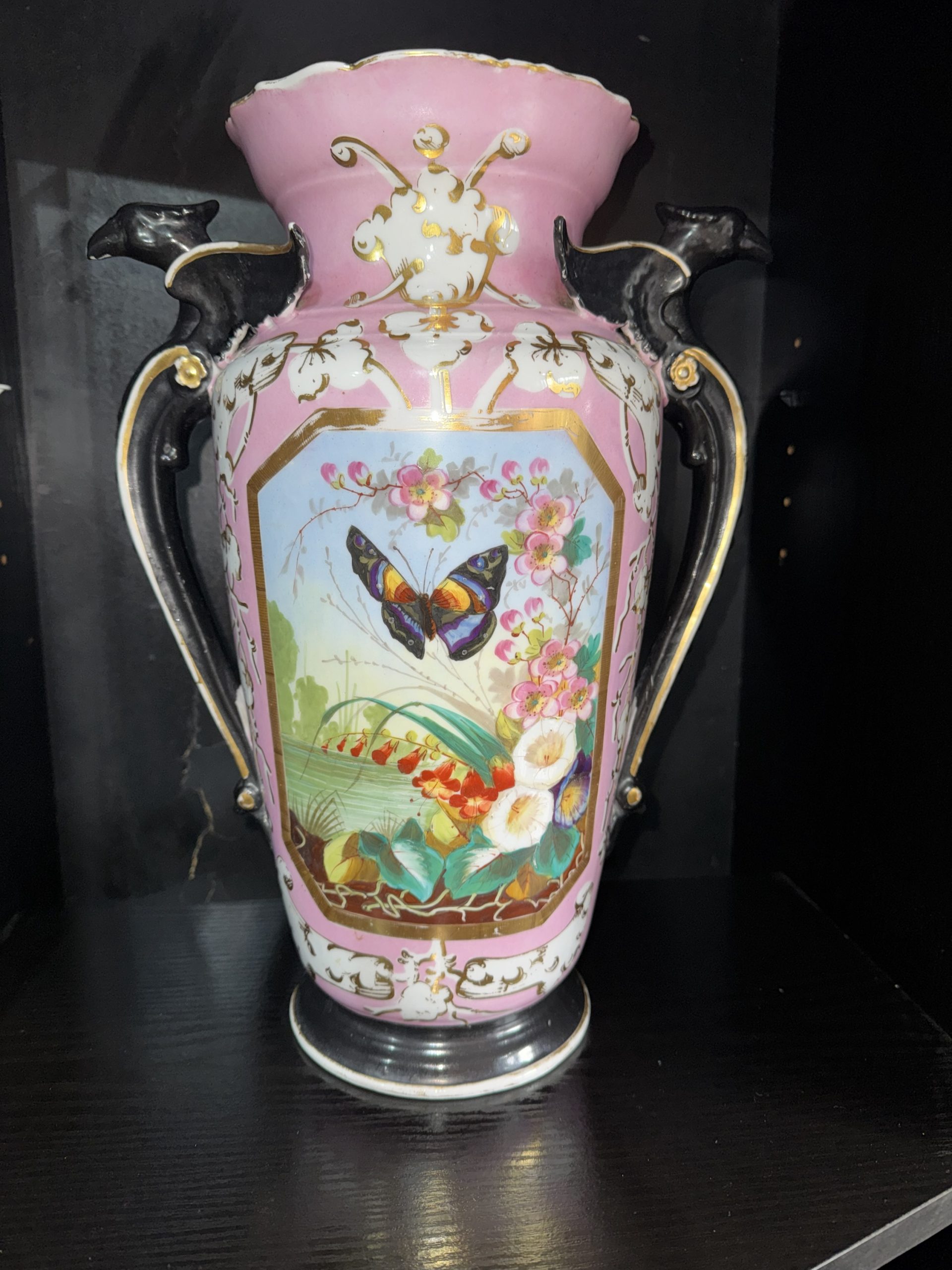 Antique French Paris porcelain vase with dragon handles and butterfly motif exudes charm with its pink colours and intricate design