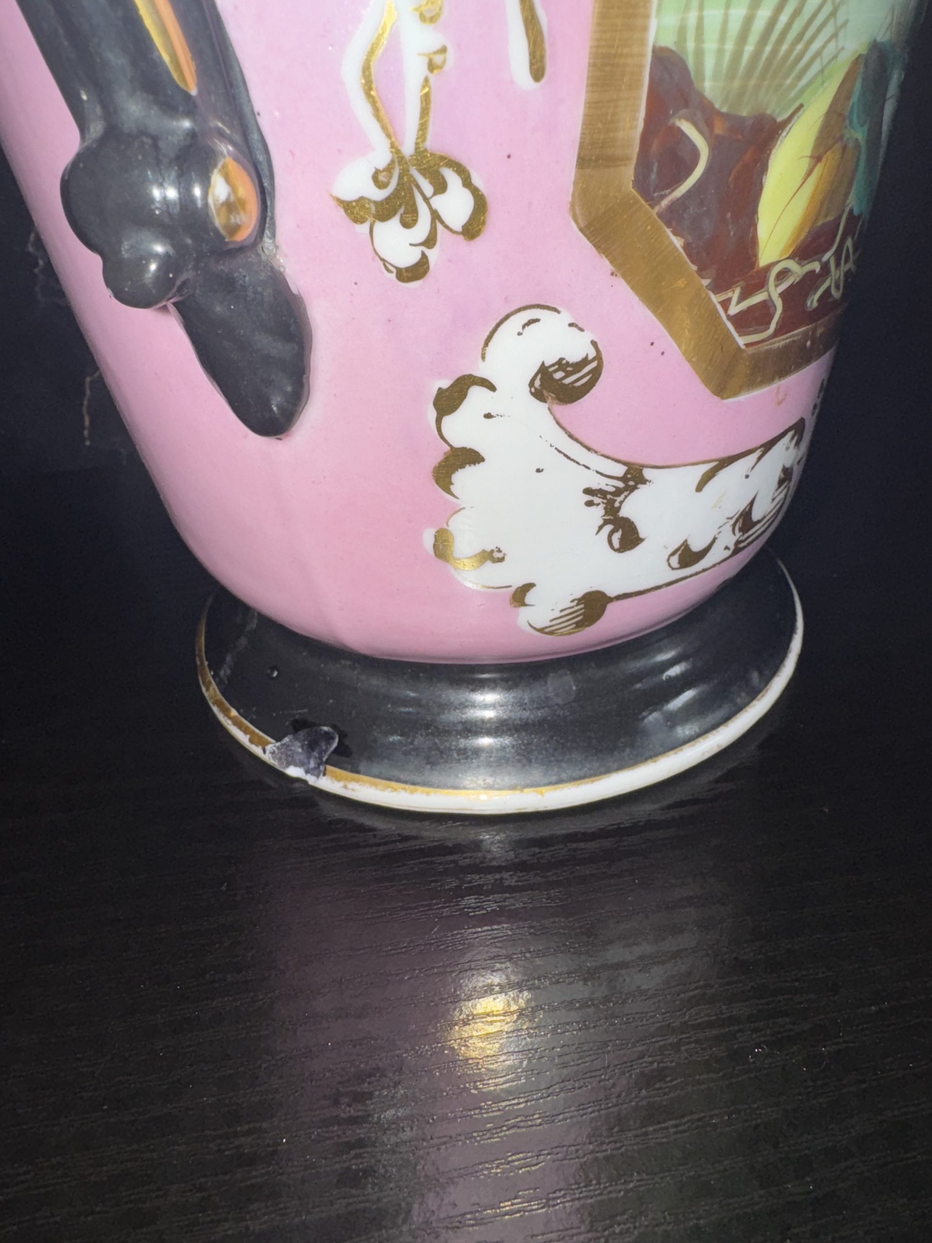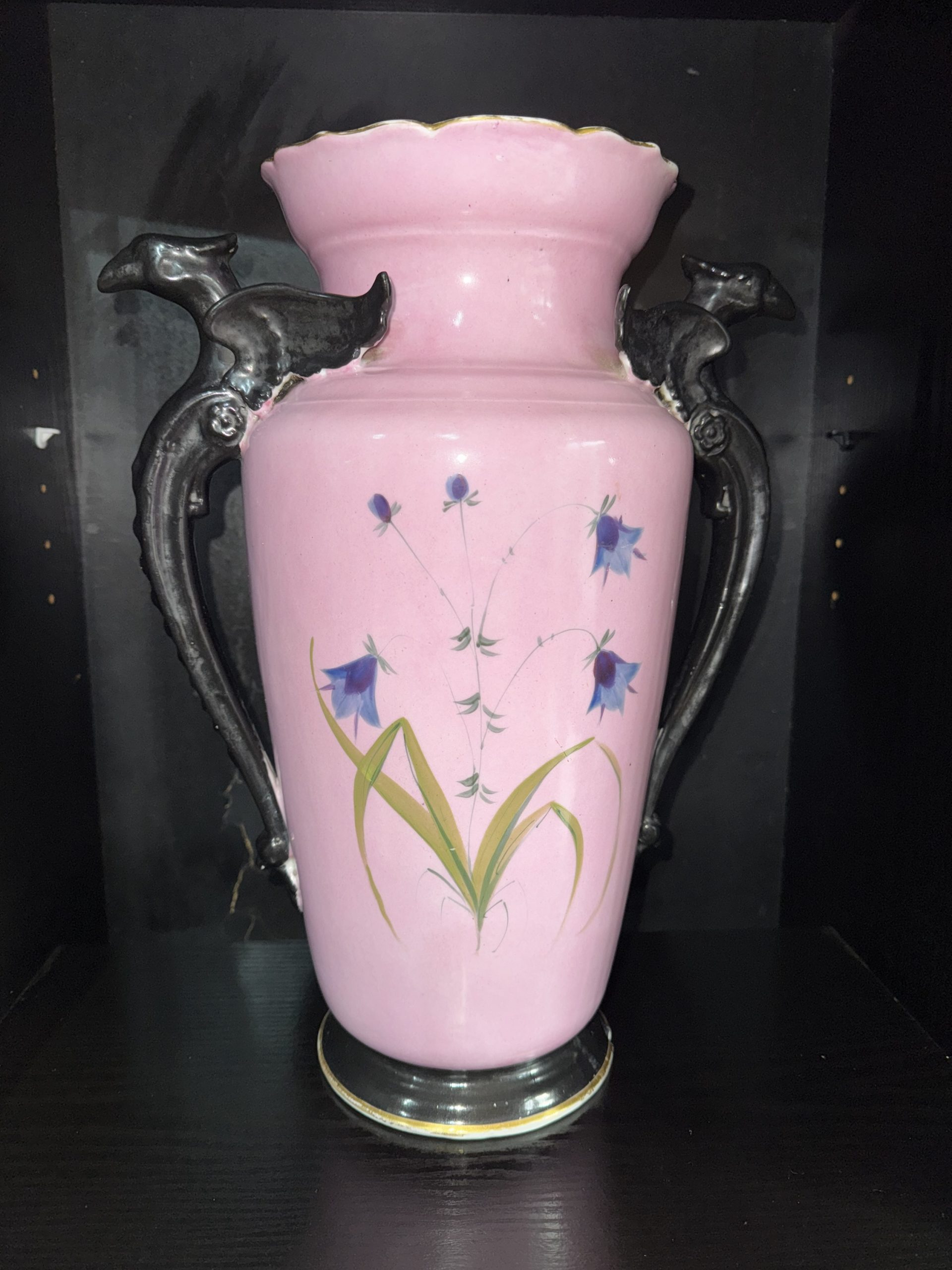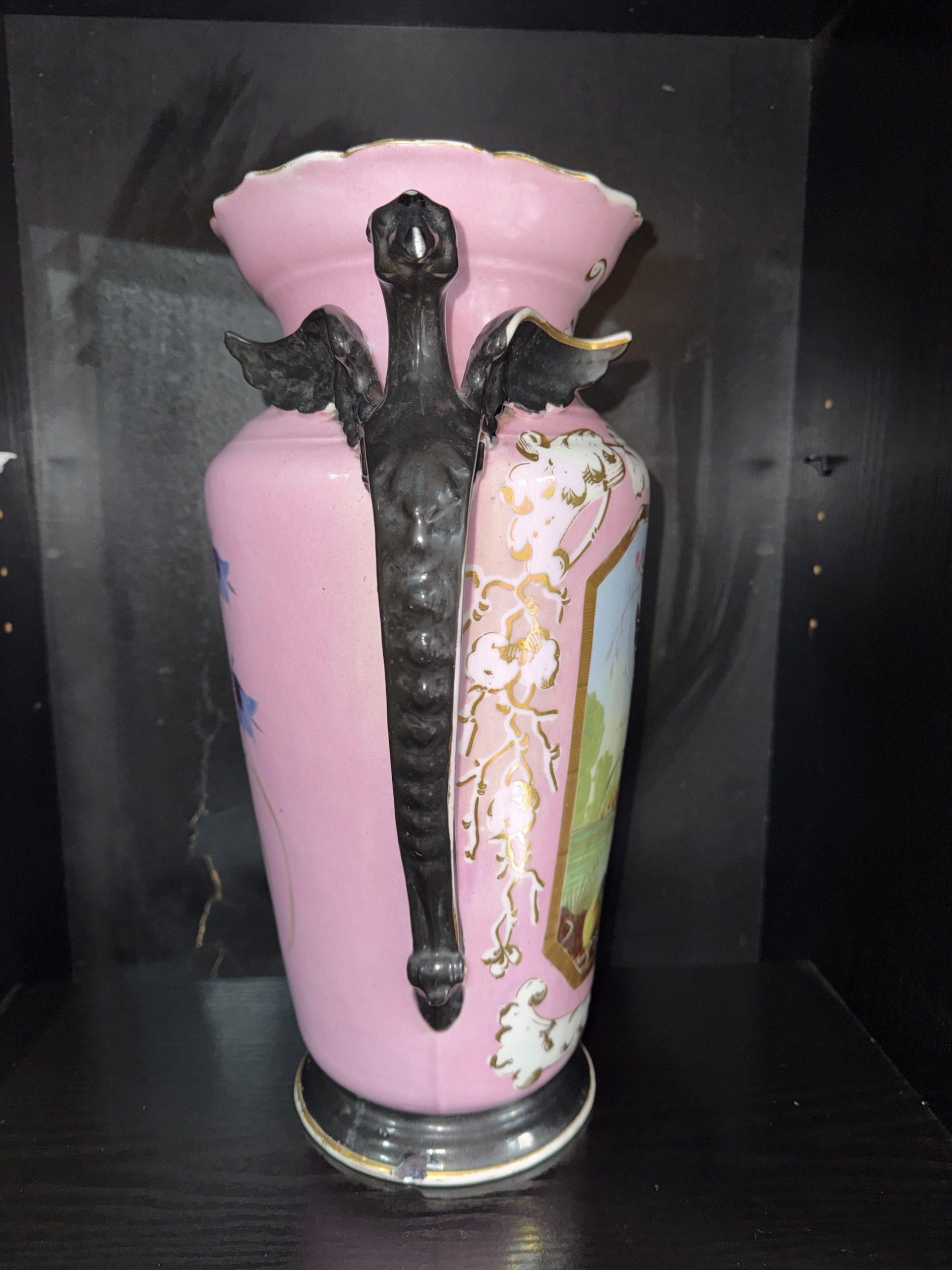 Antique French Paris porcelain vase with dragon handles and butterfly motif exudes charm with its pink colours and intricate design
