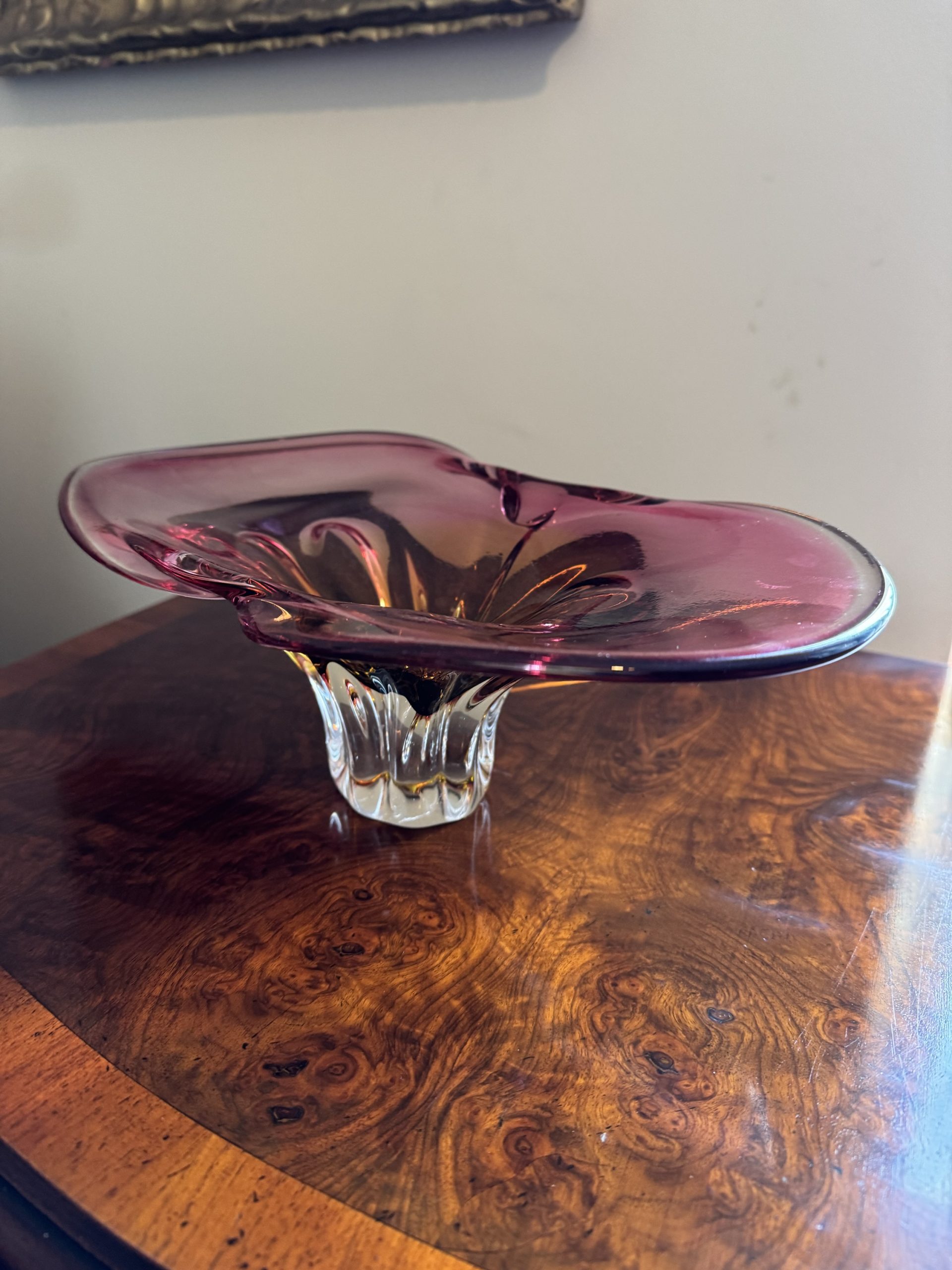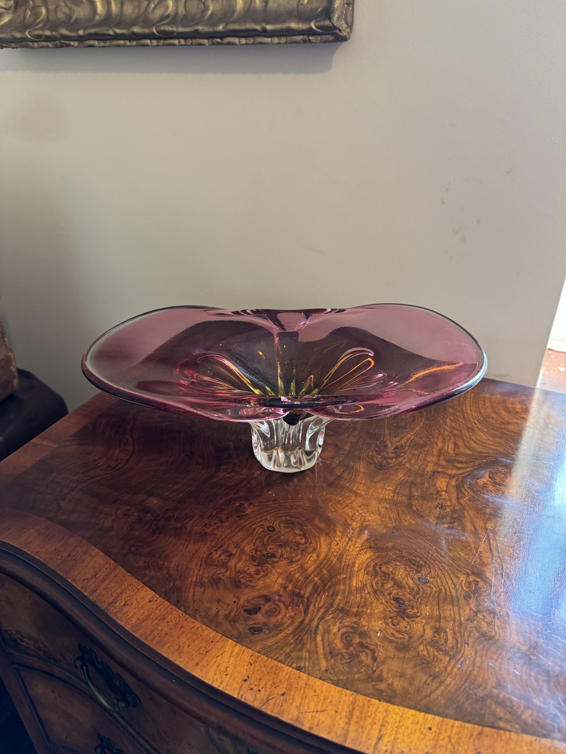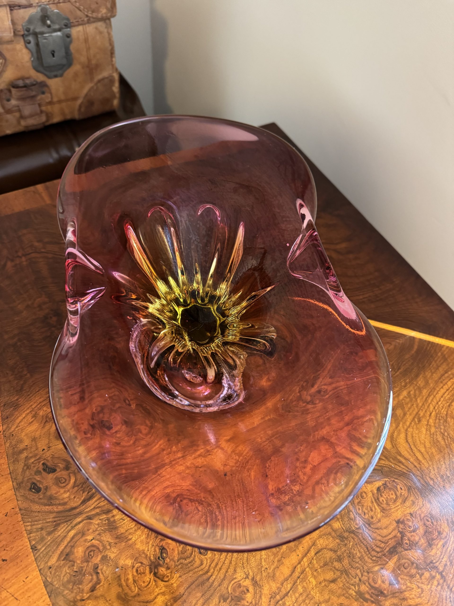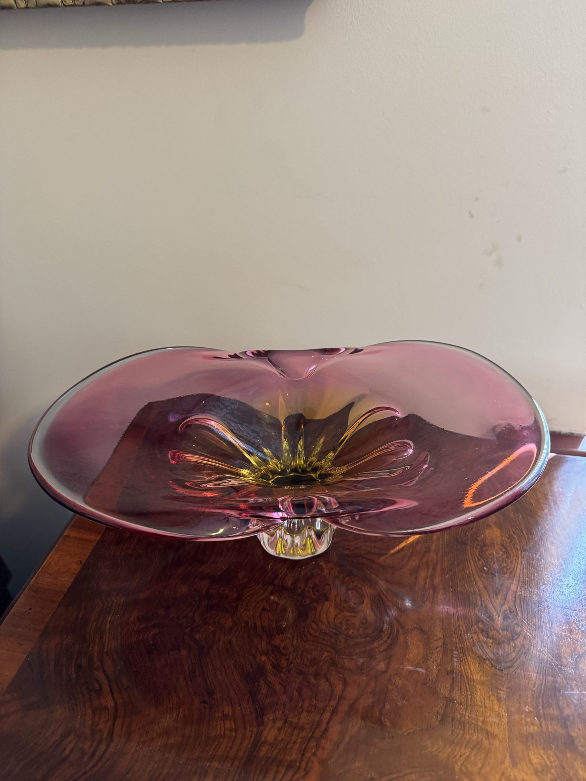 Josef Hospodka hand blown organic cranberry pink sculpture with a yellow amber core a beautiful eye catching peace of art and collectors item.