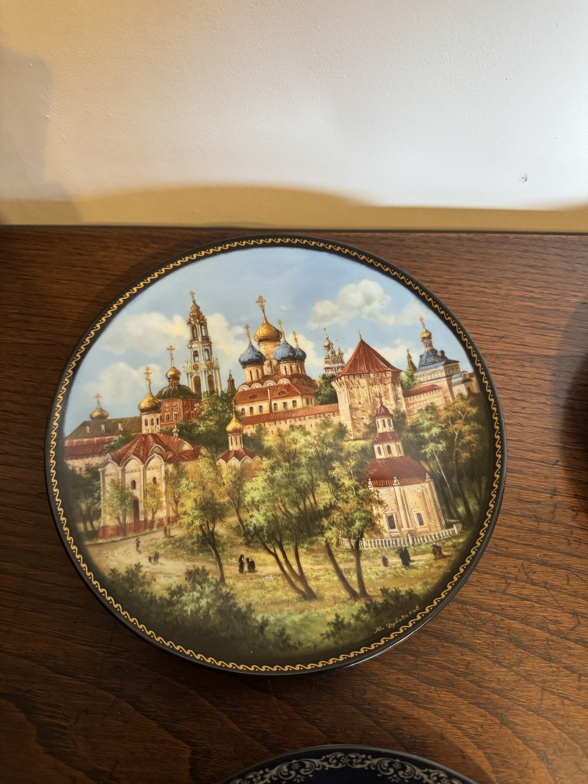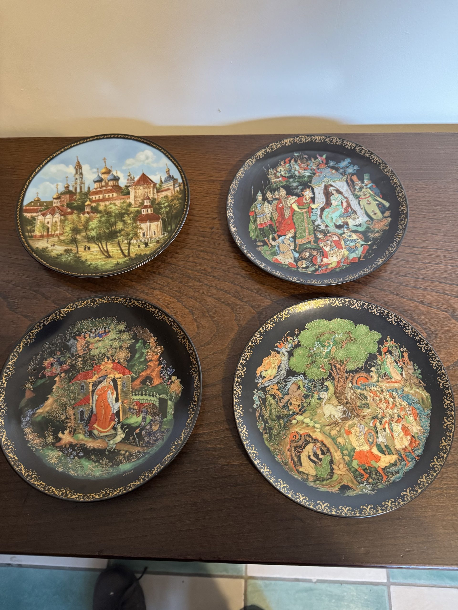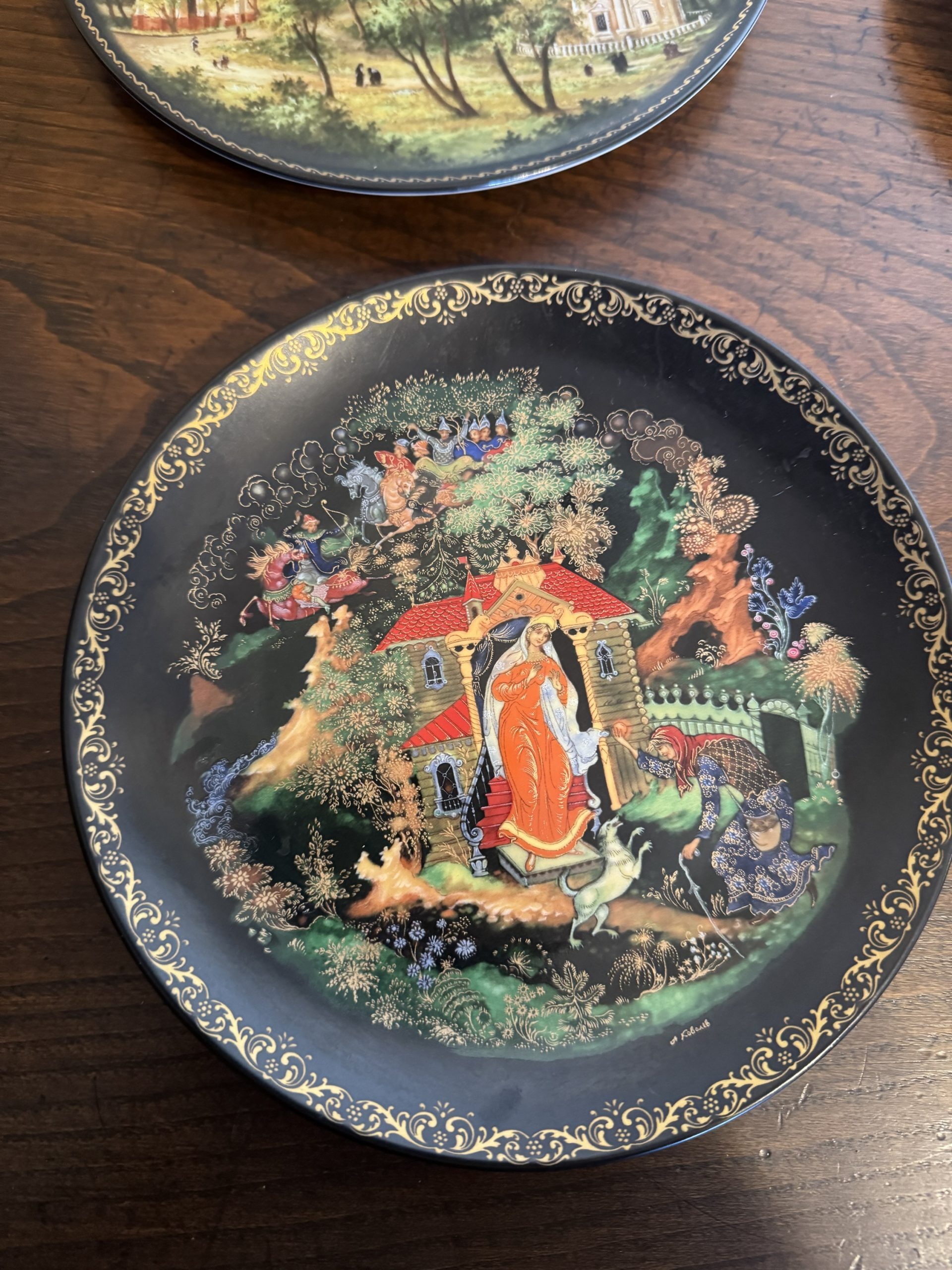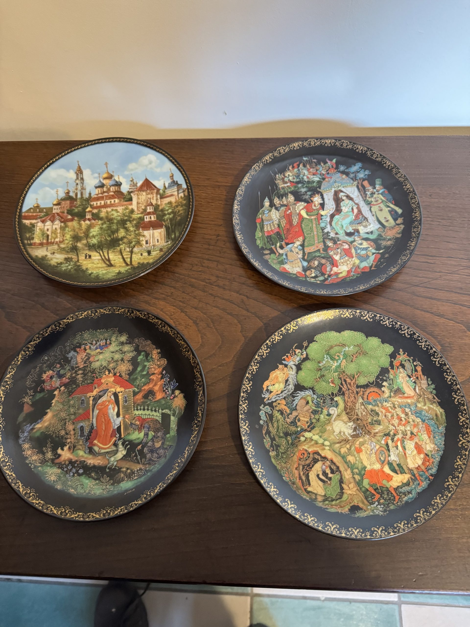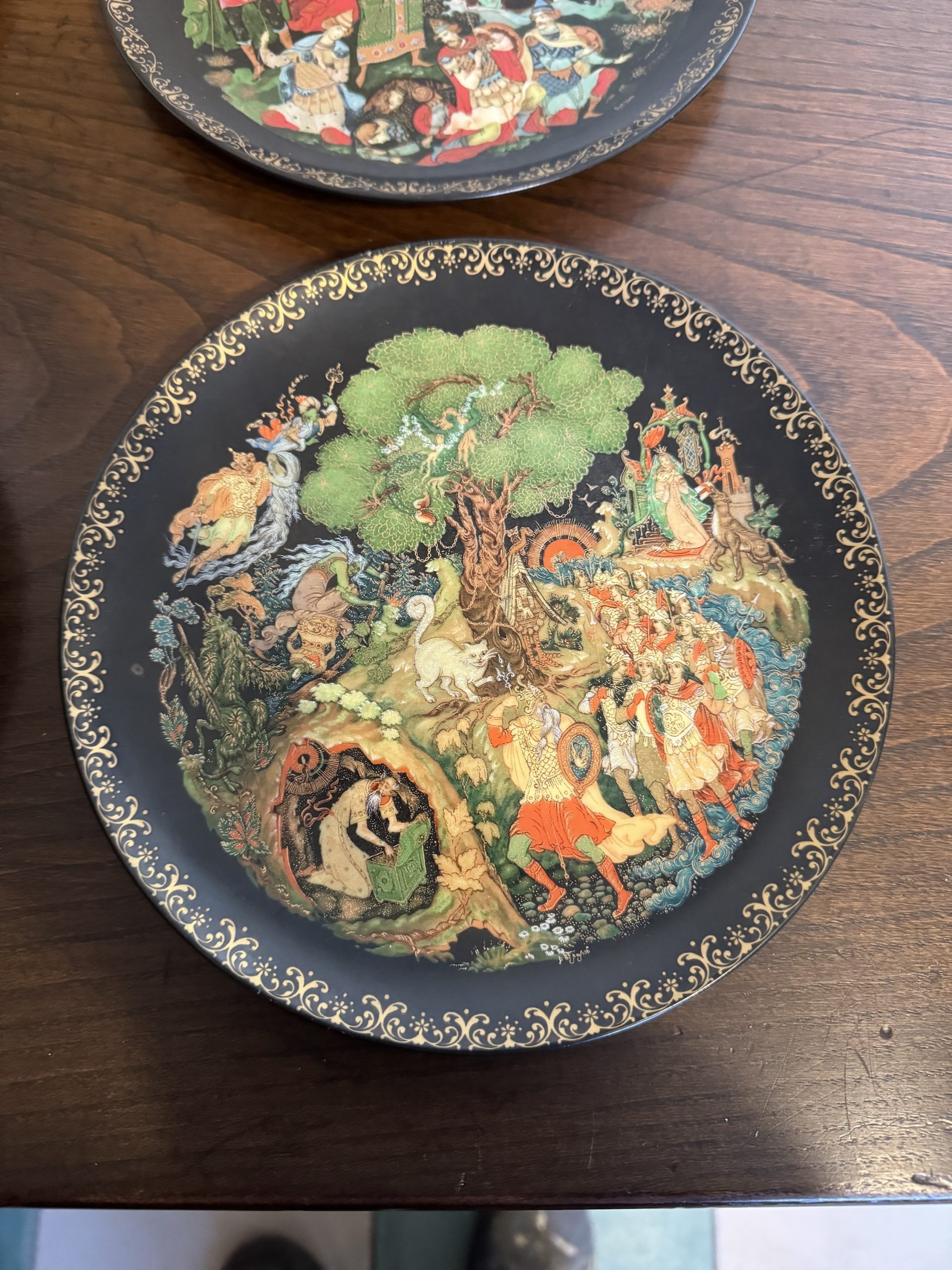 Set of five vintage Russian Palekh plates depicting scenes from Russian fairytales