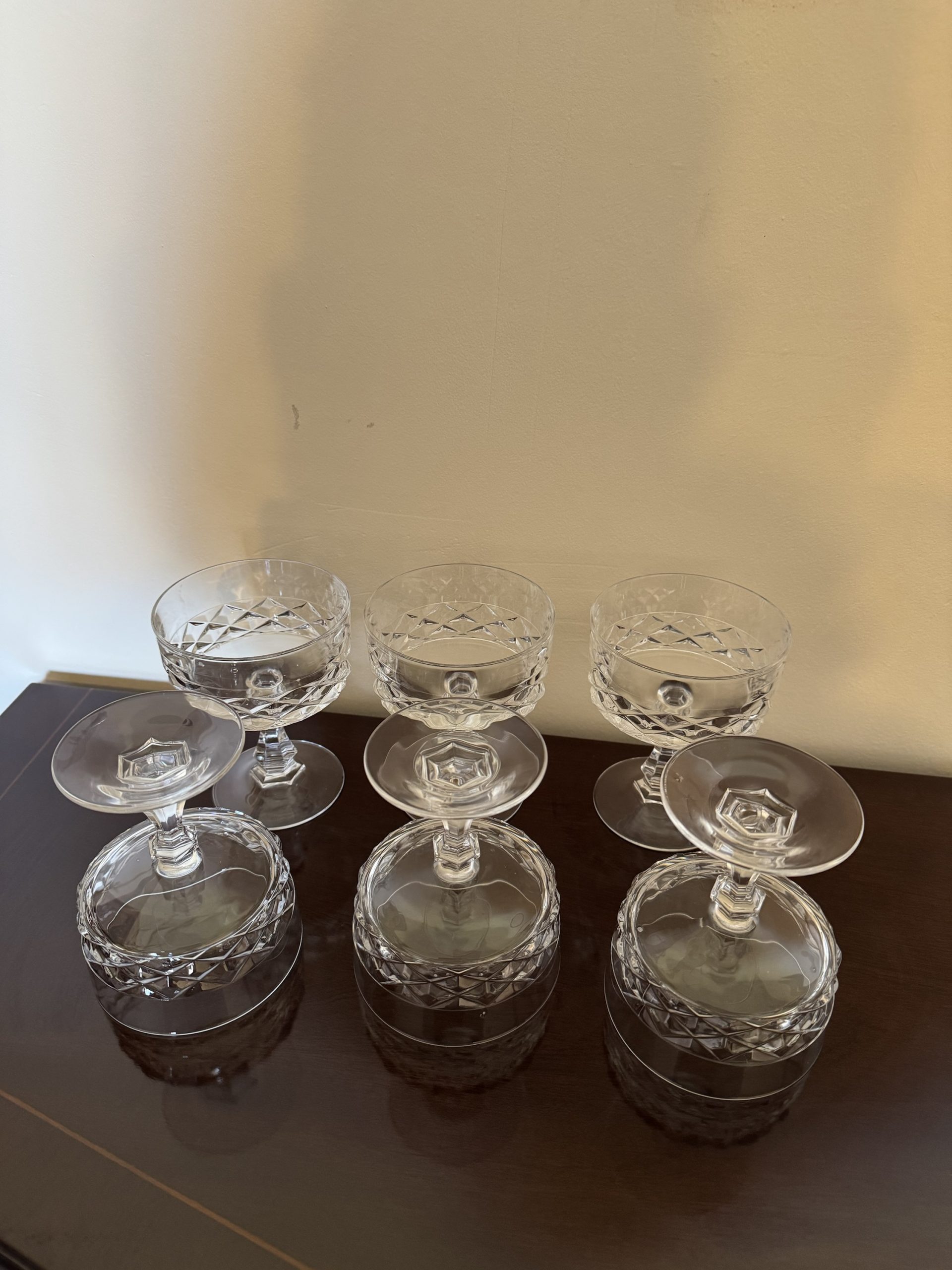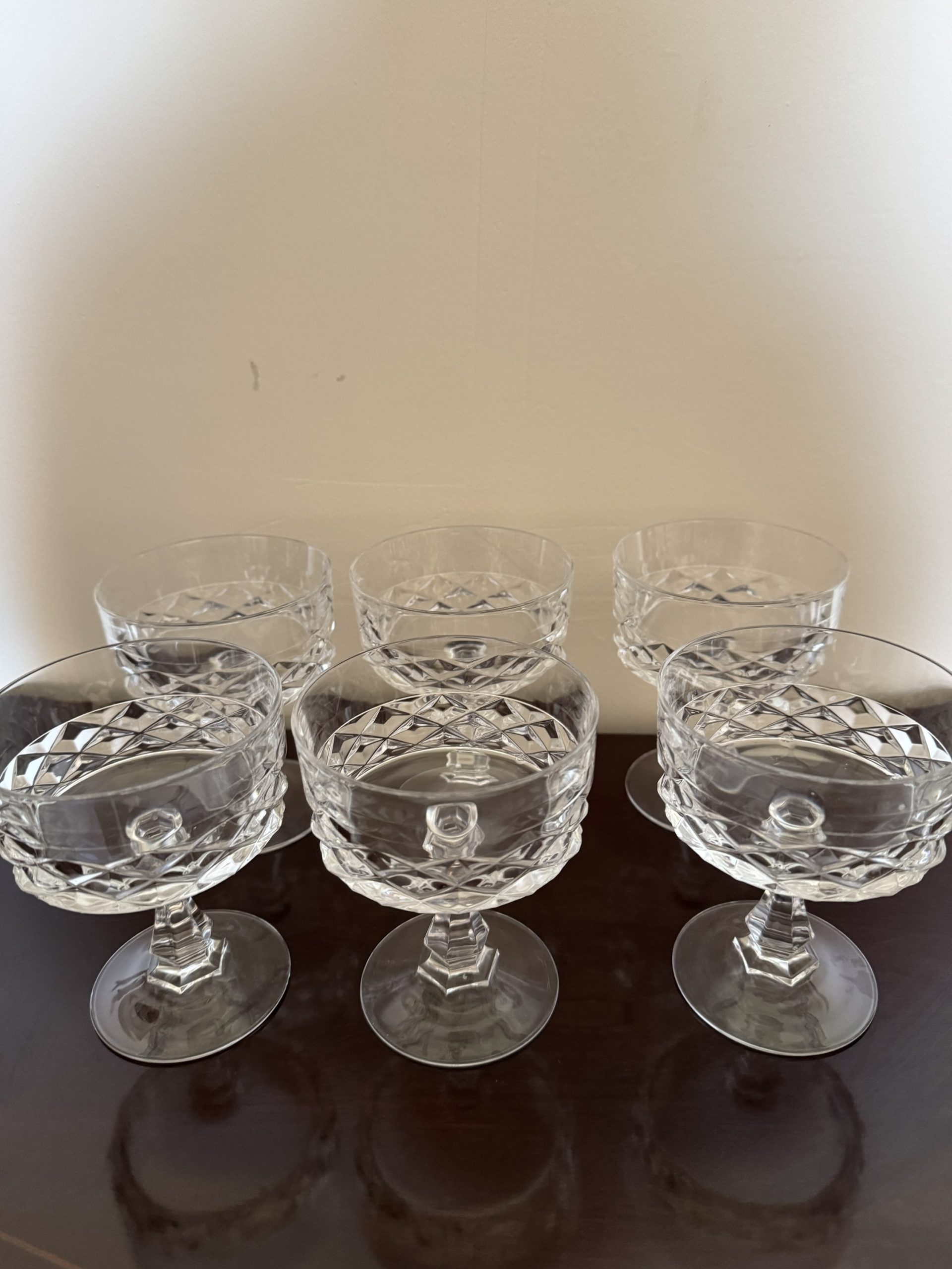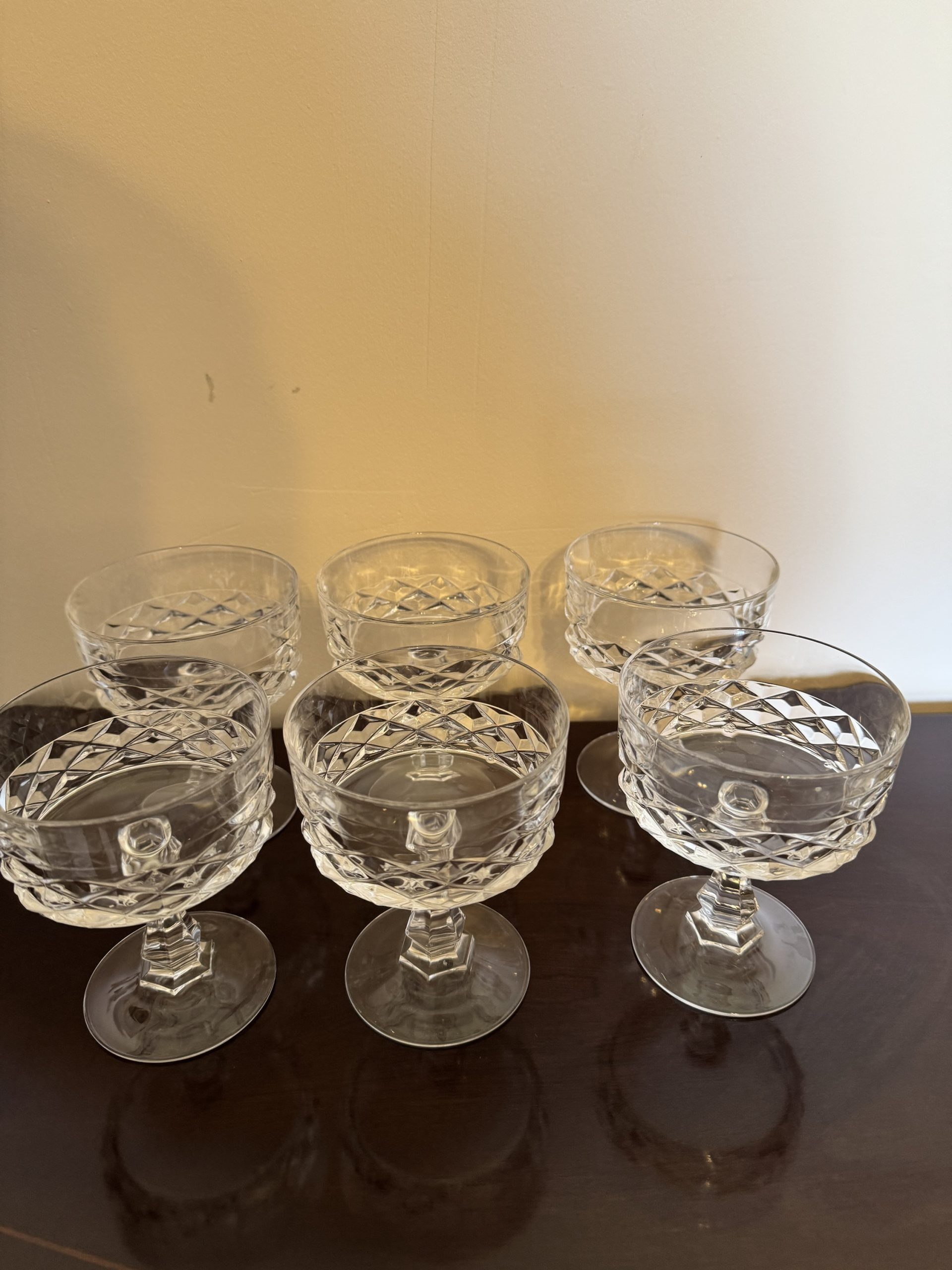 Set of 6 Mid 20th century crystal steamed dishes or champagne glasses with a diamond design