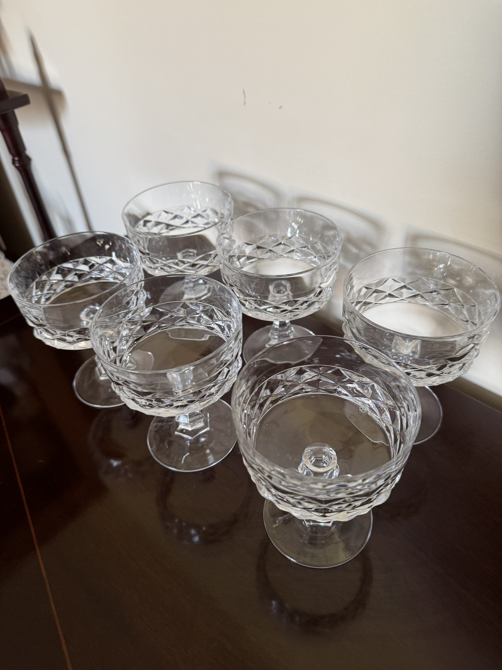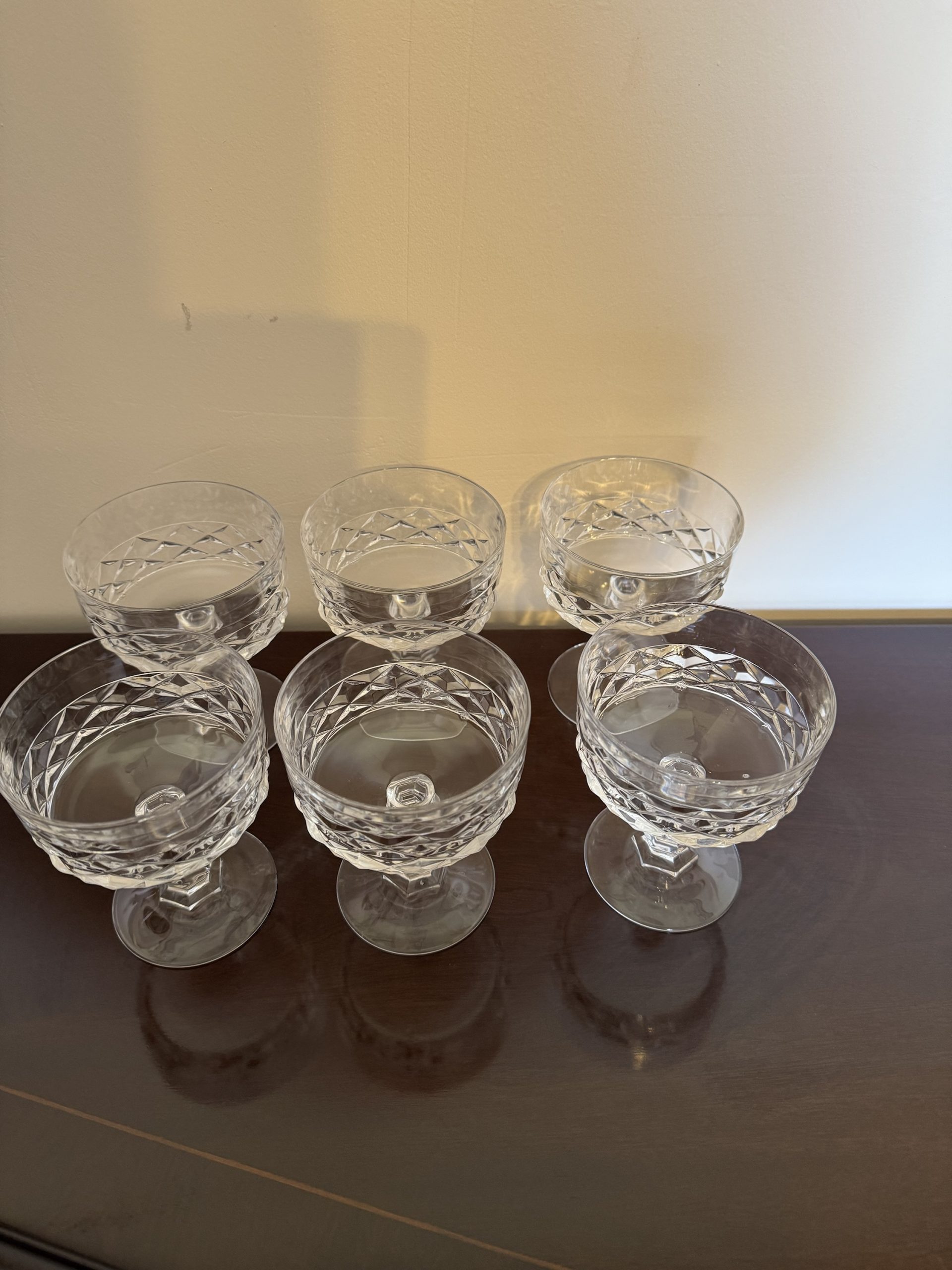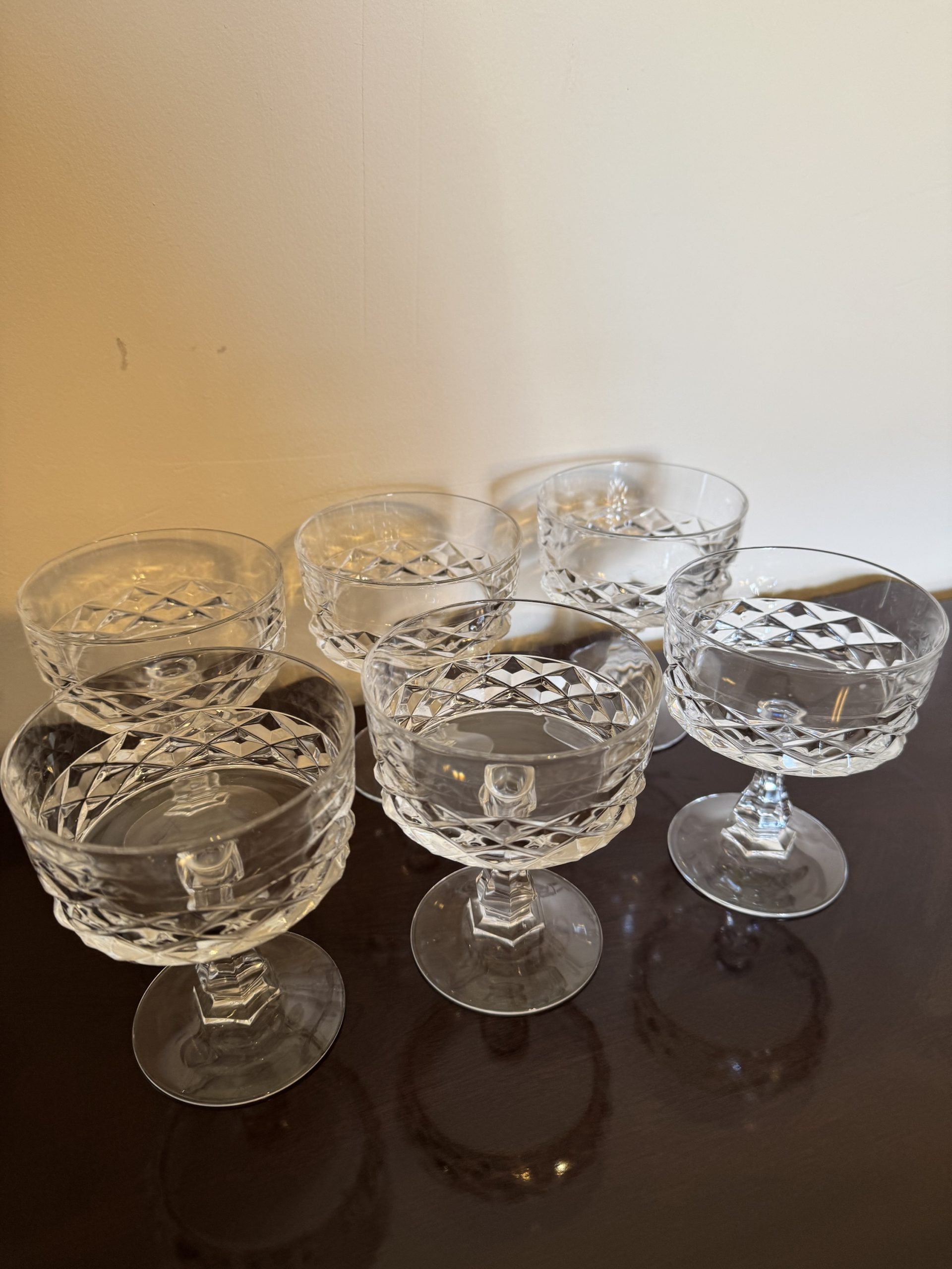 Set of 6 Mid 20th century crystal steamed dishes or champagne glasses with a diamond design