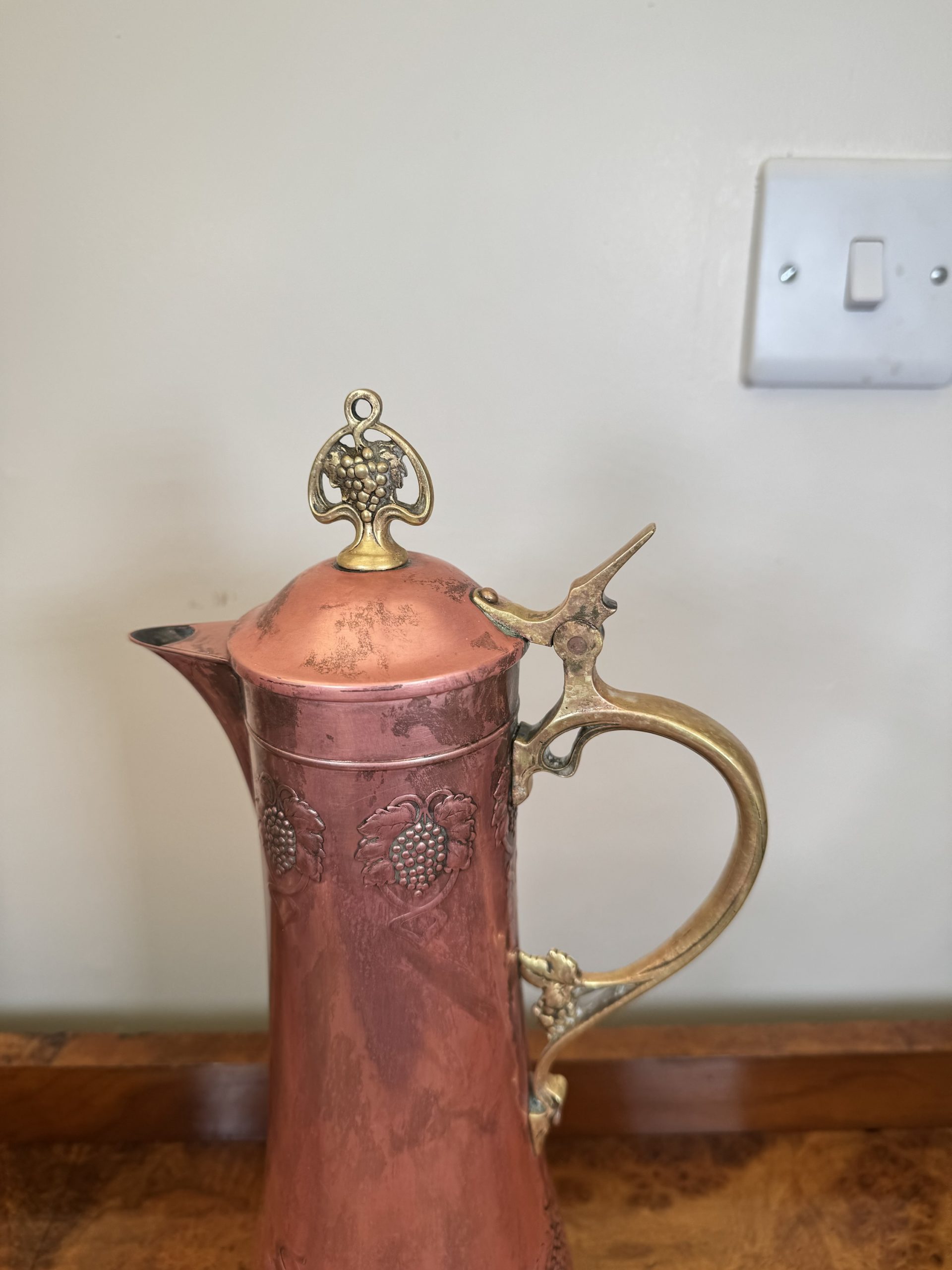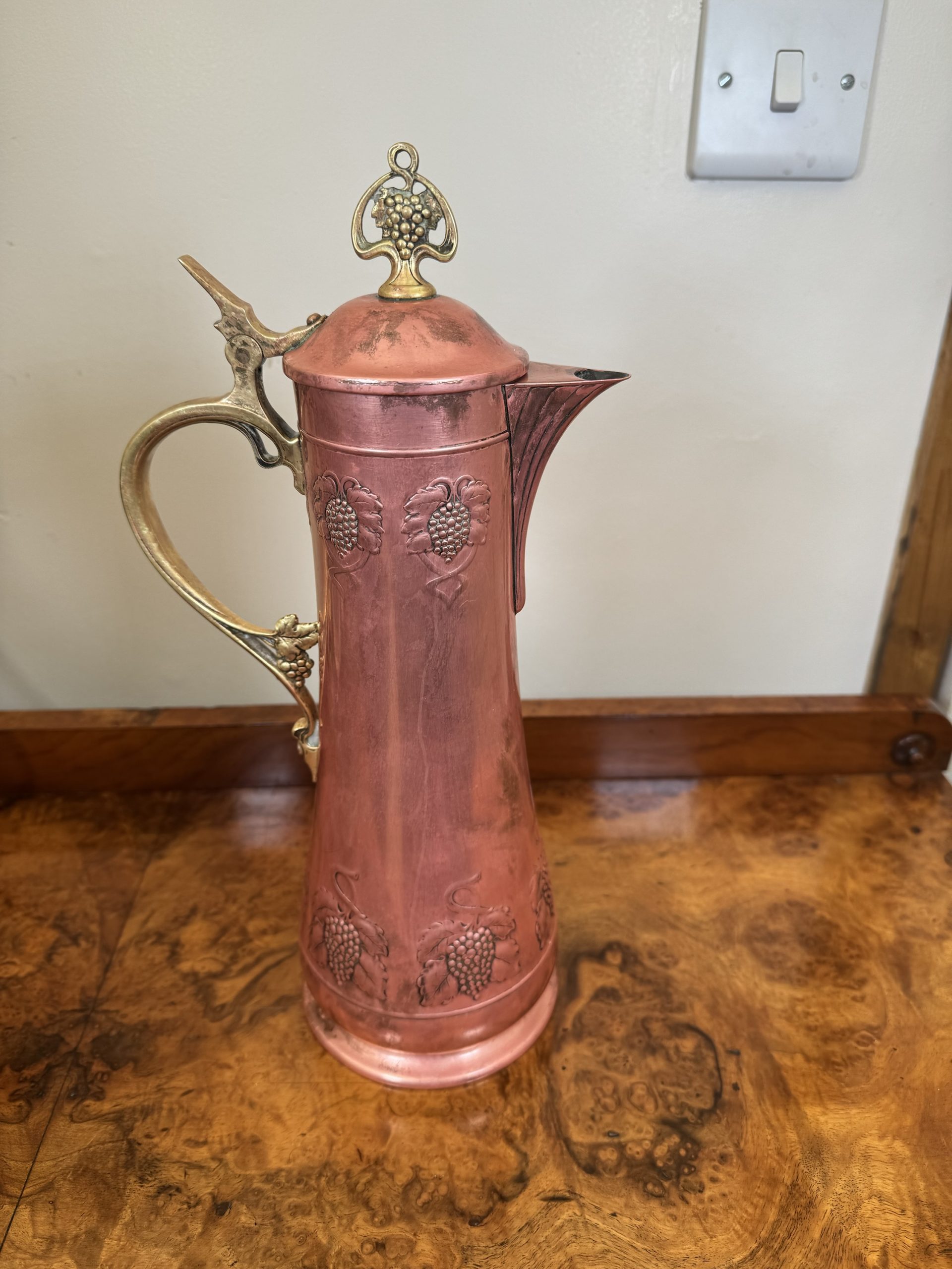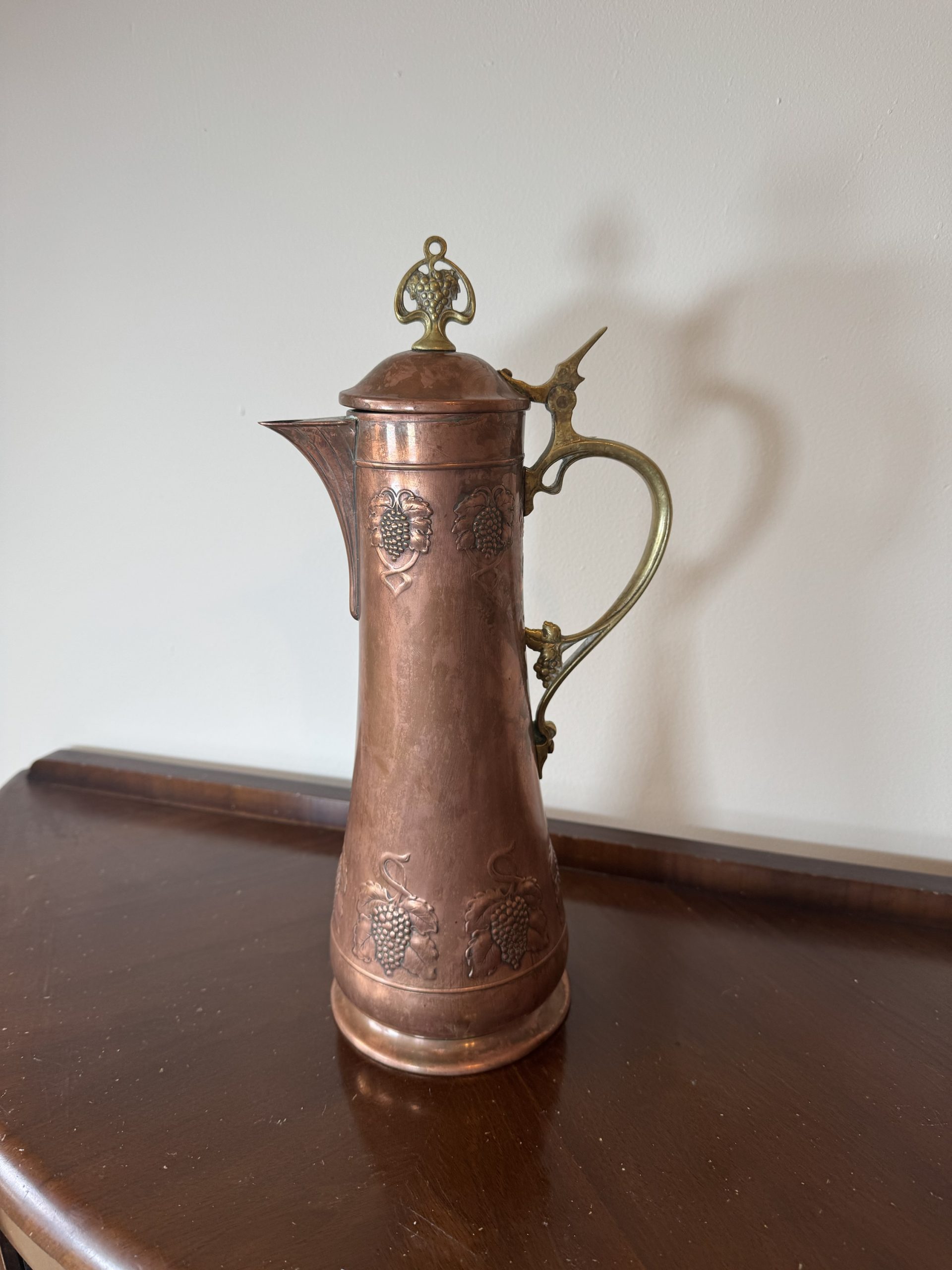 1900-1940 Antique Claret jug with Brass and Bronze intricate metal workings.