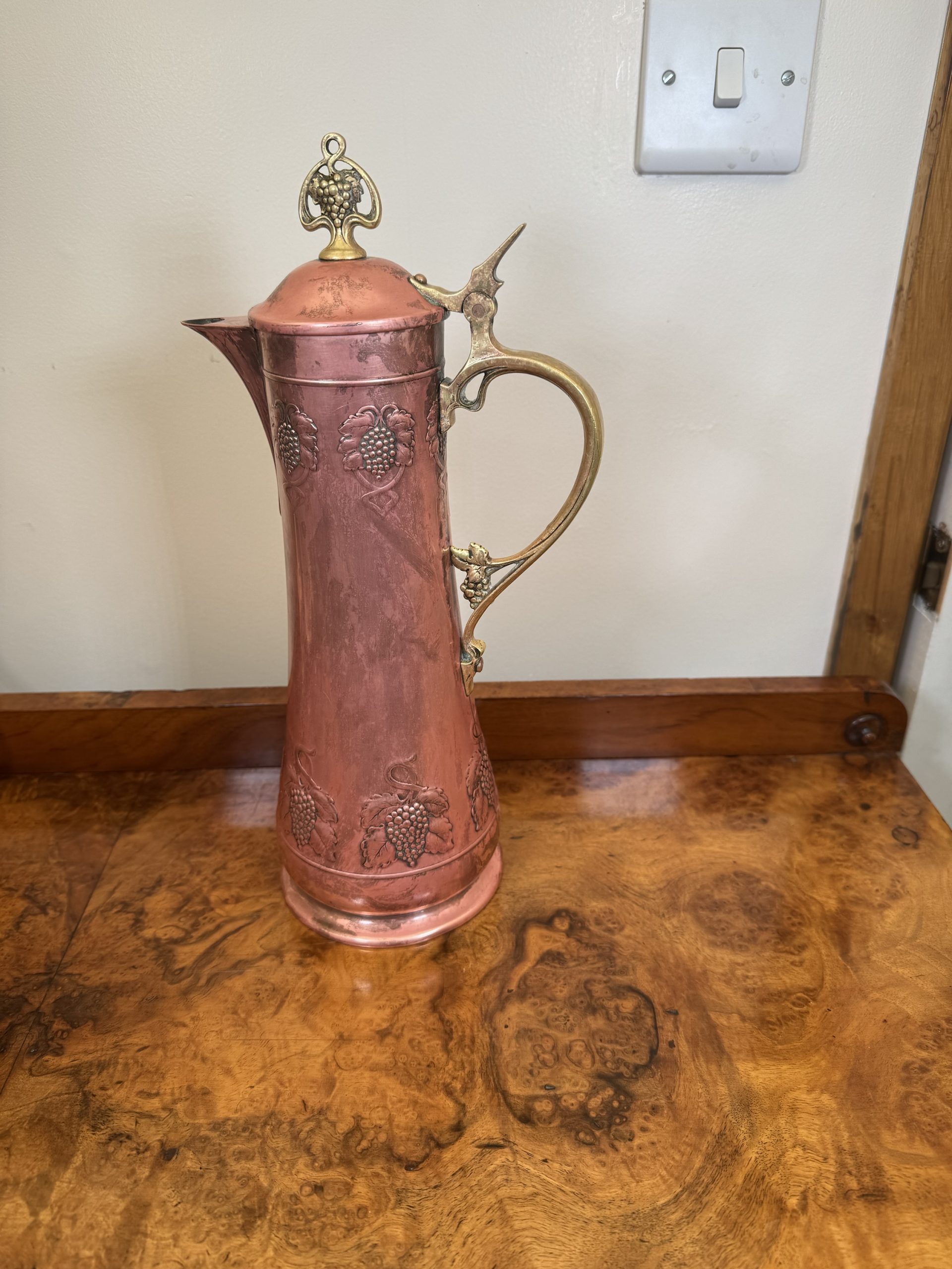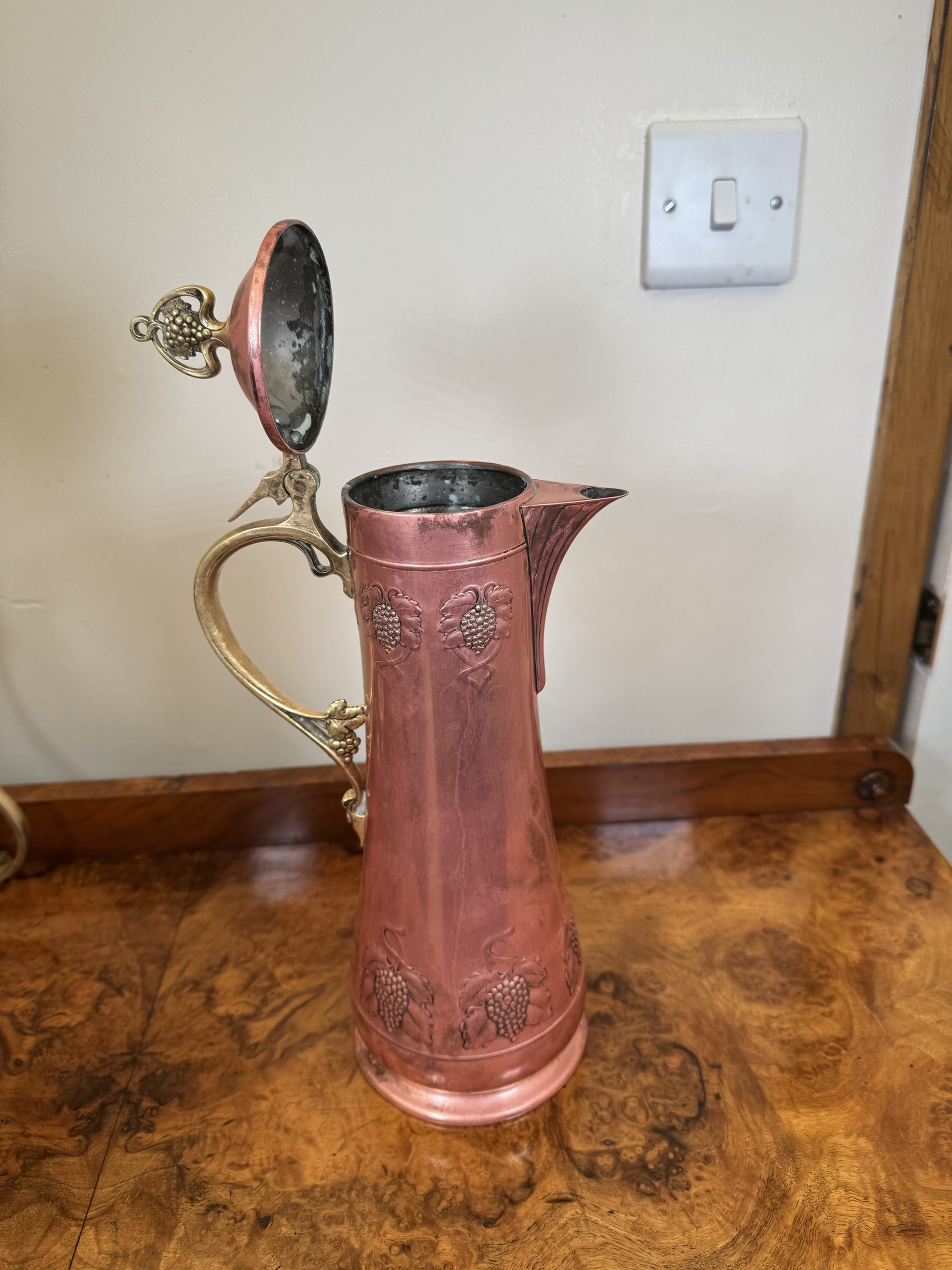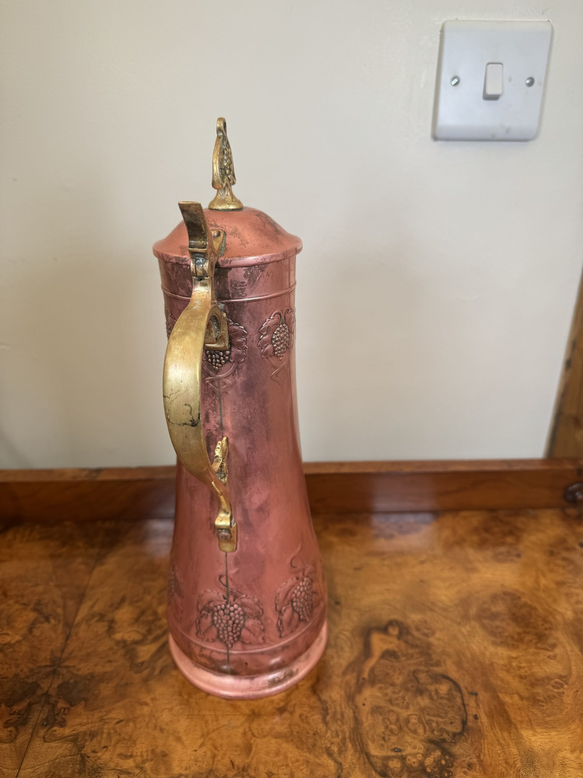 1900-1940 Antique Claret jug with Brass and Bronze intricate metal workings.