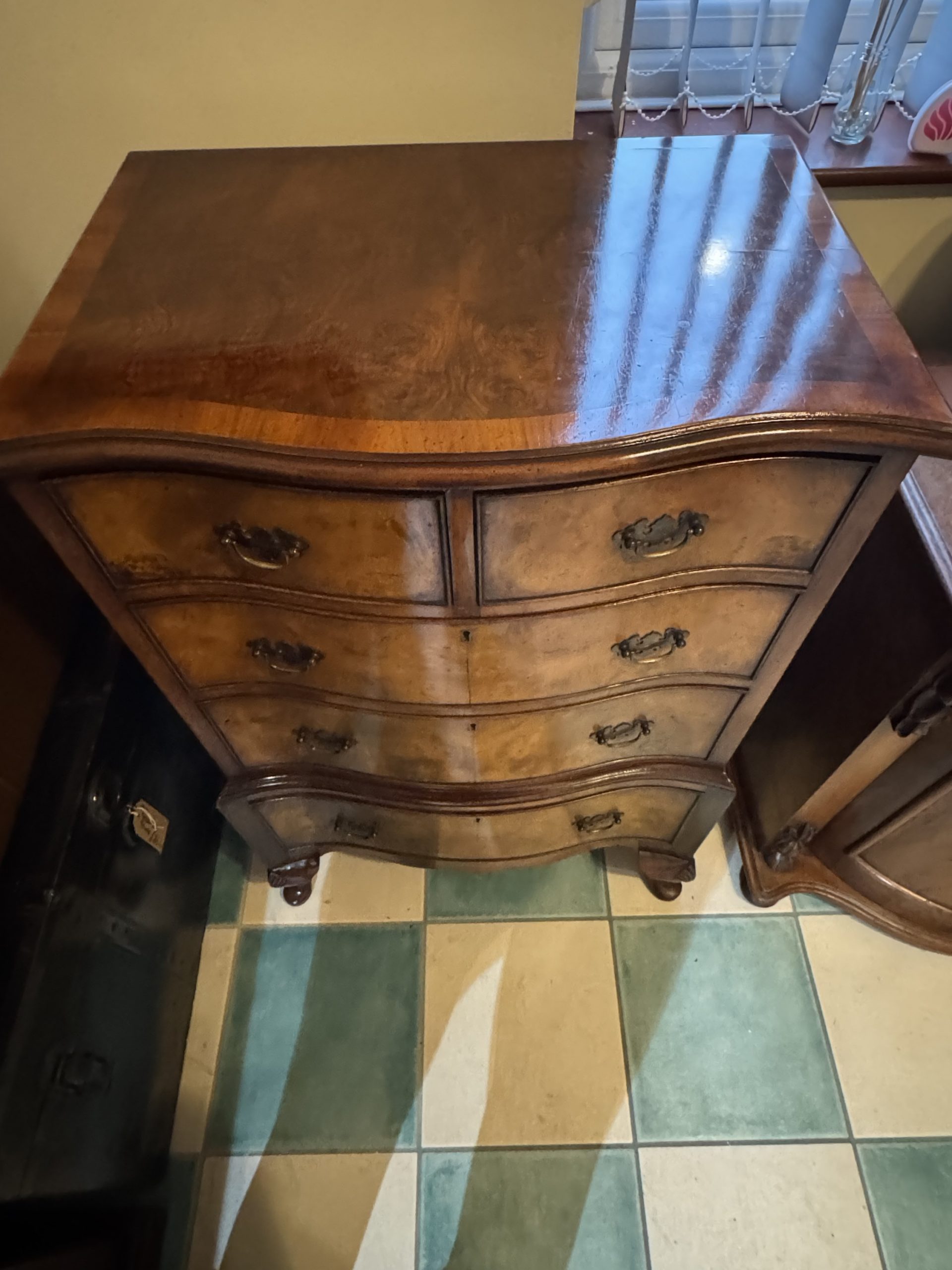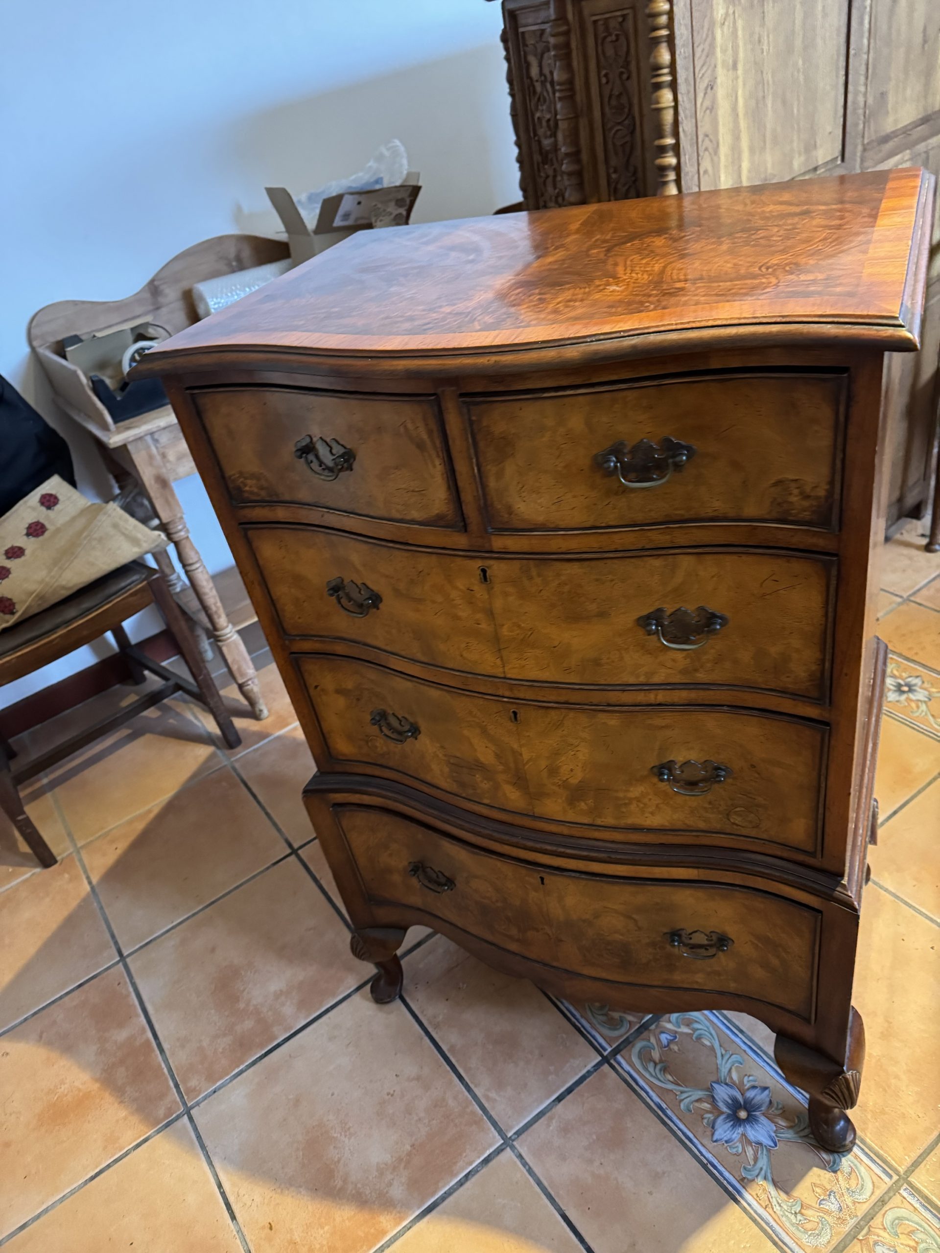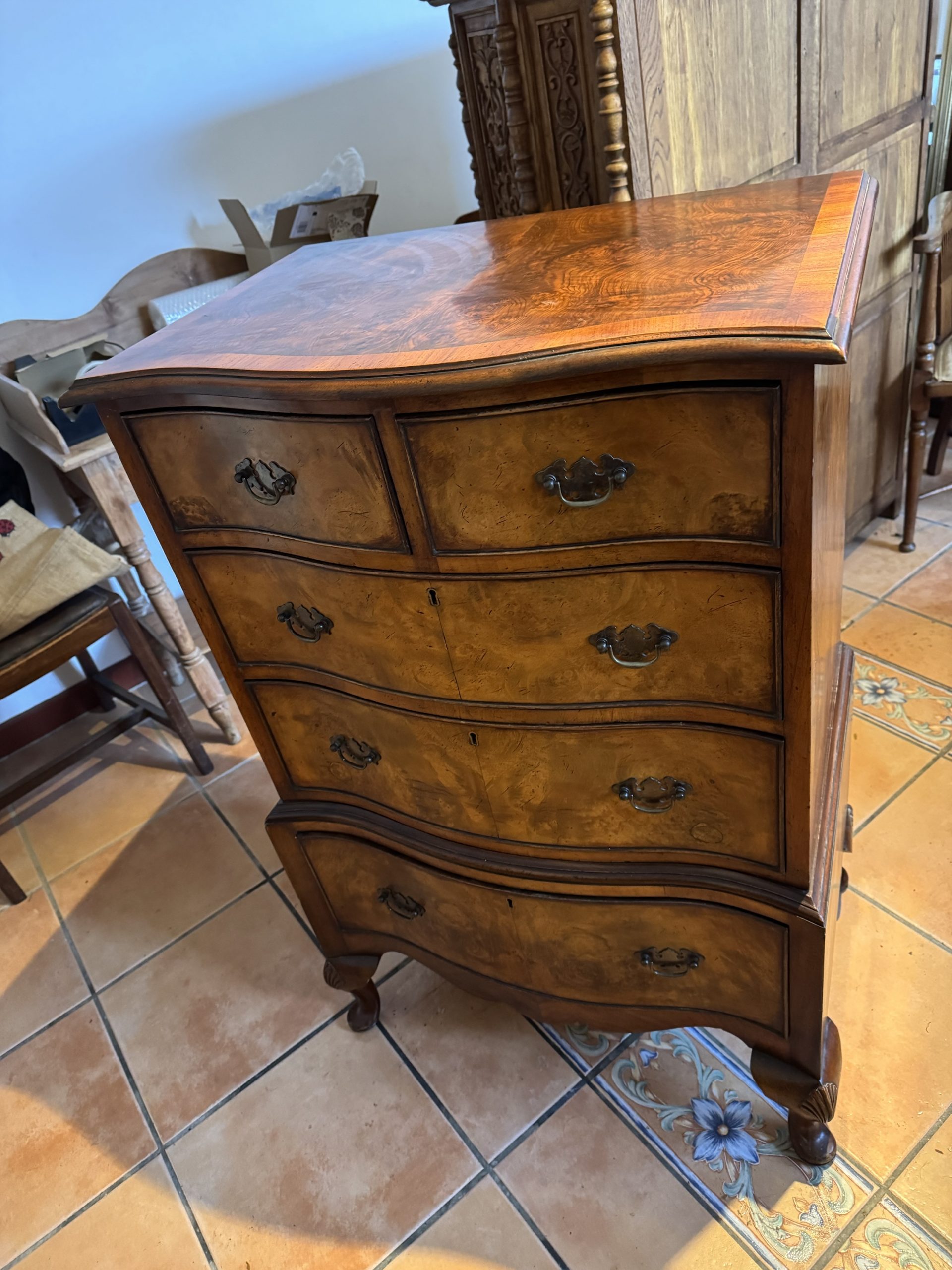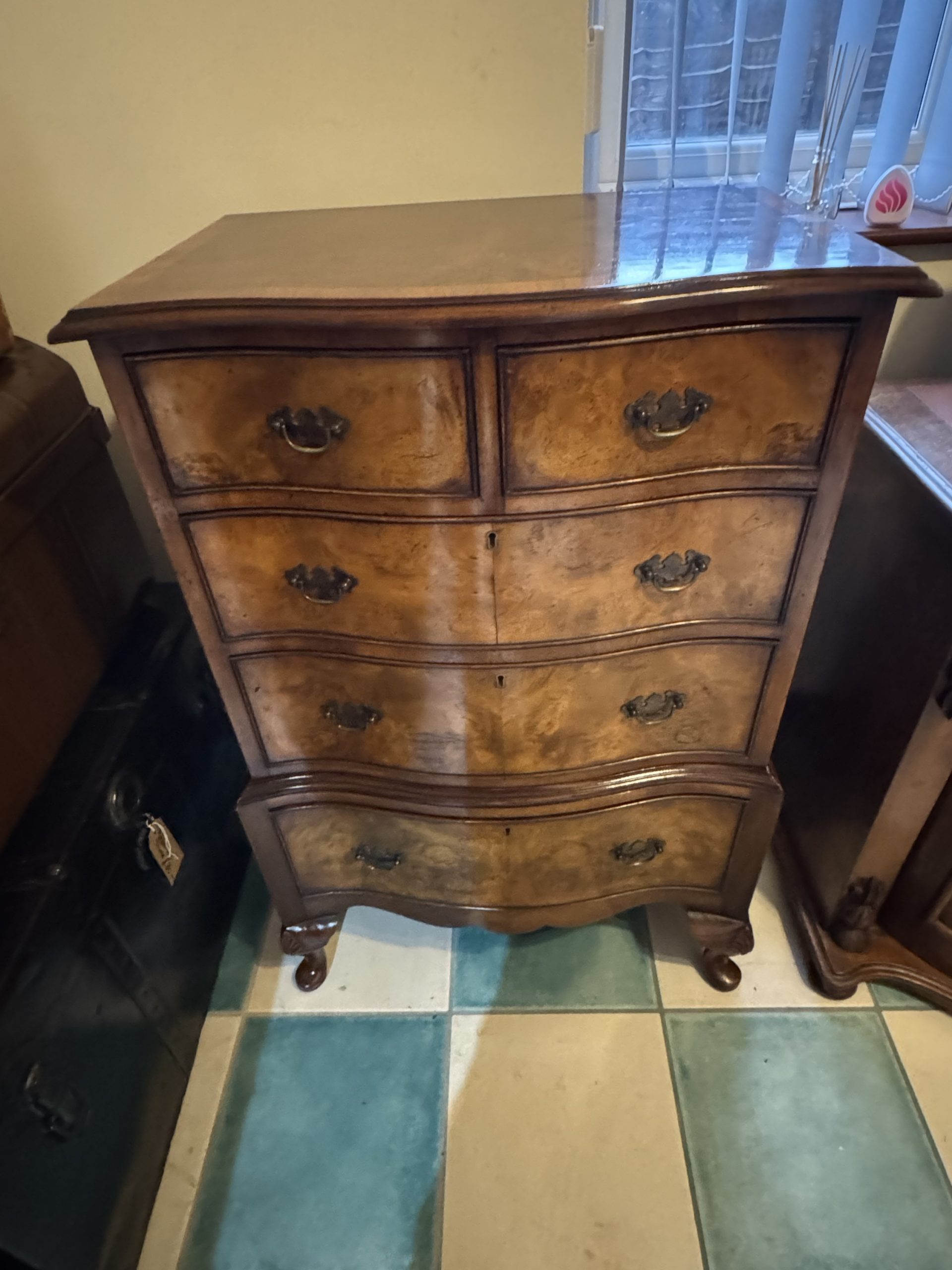 Antique Burl wood serpentine front chest of draws on cabriole legs with brass details