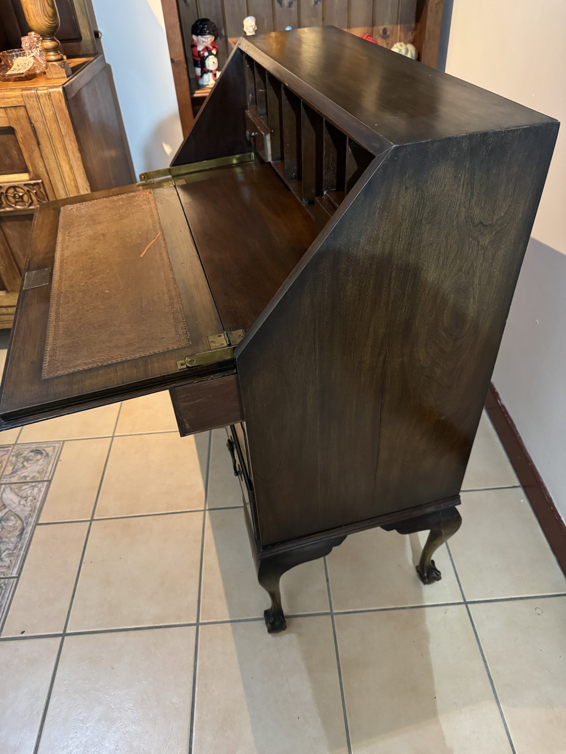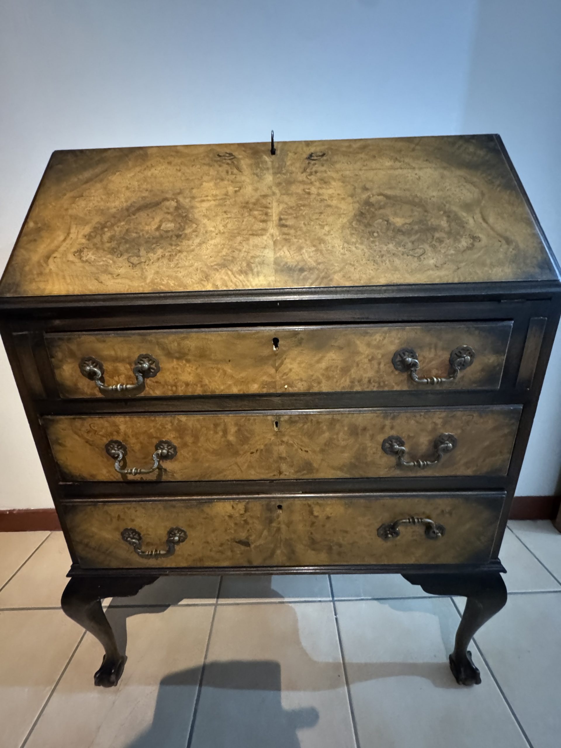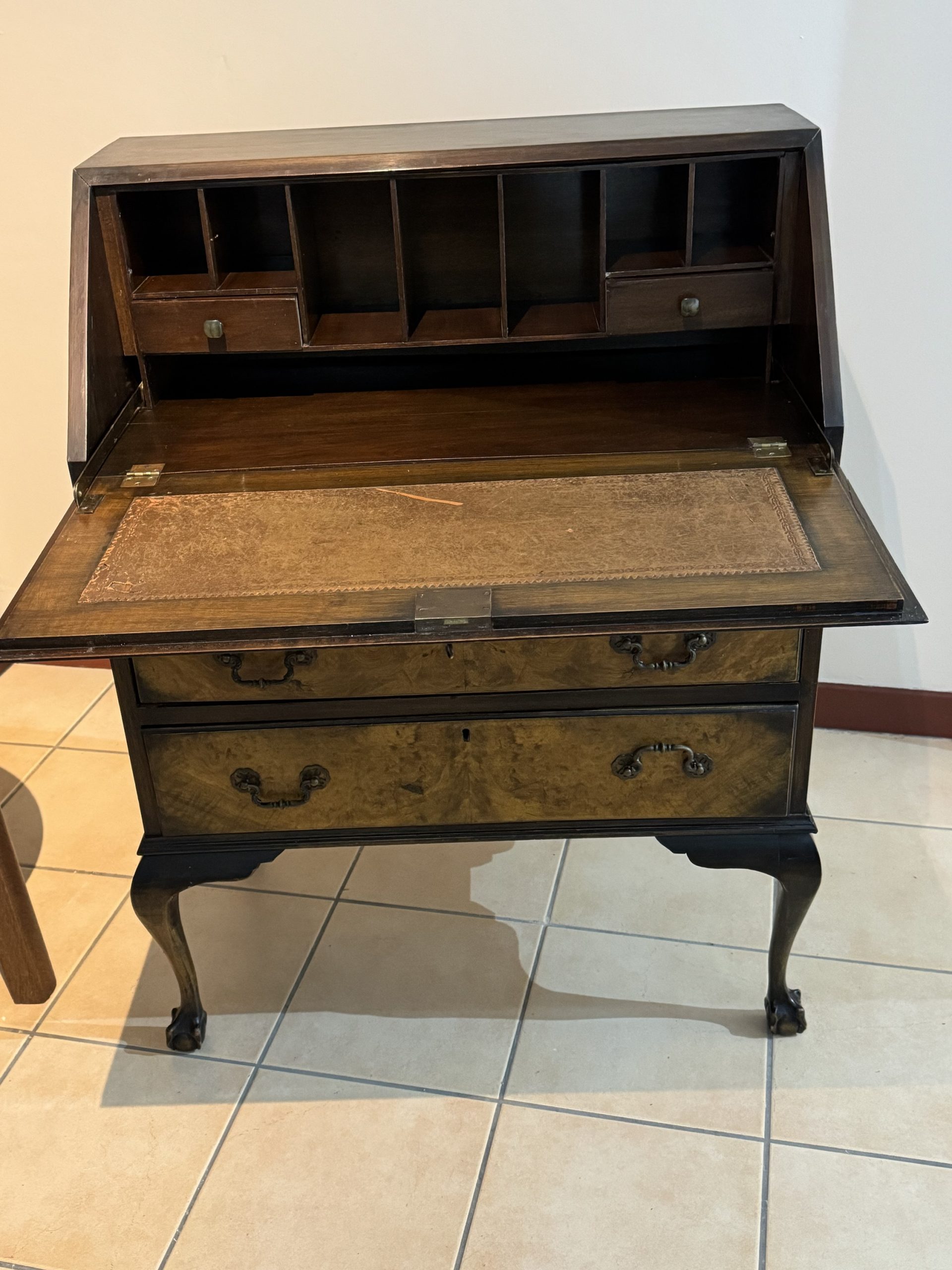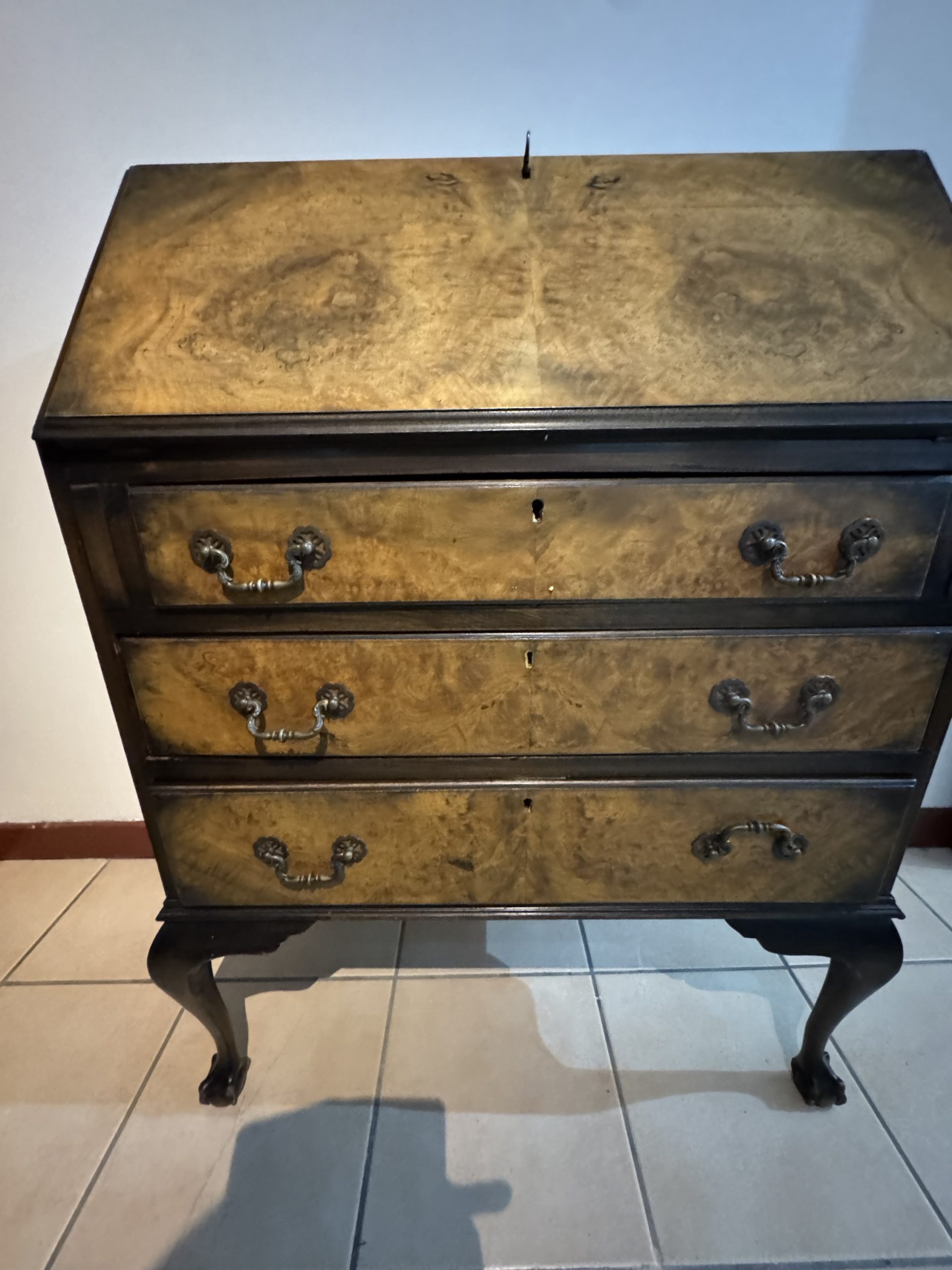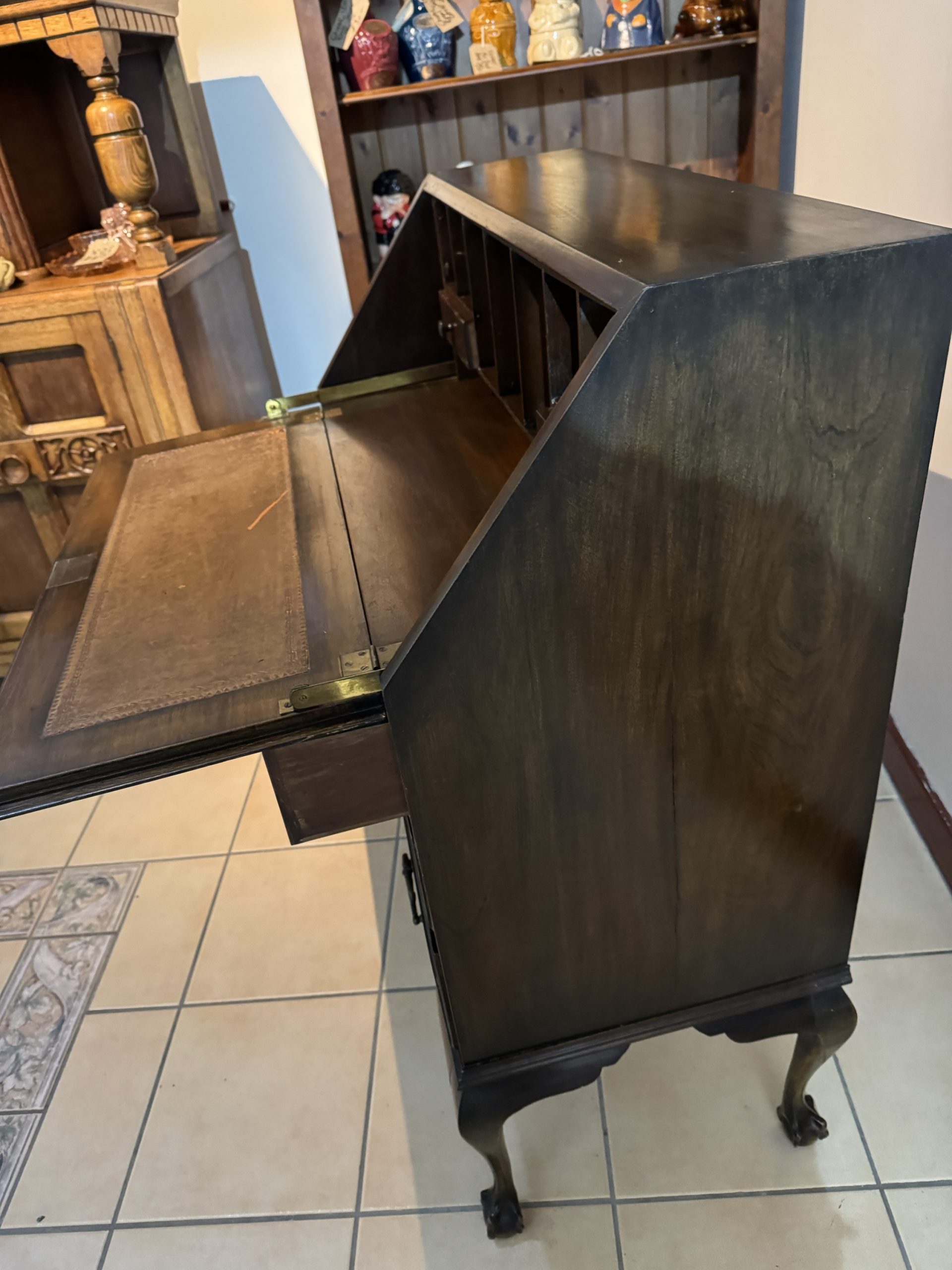 1900’s Edwardian burl walnut secretary desk on cabriole legs sitting on carved Claw and Ball feet. a drop front sits to form writing desk and internal pigeon holes
