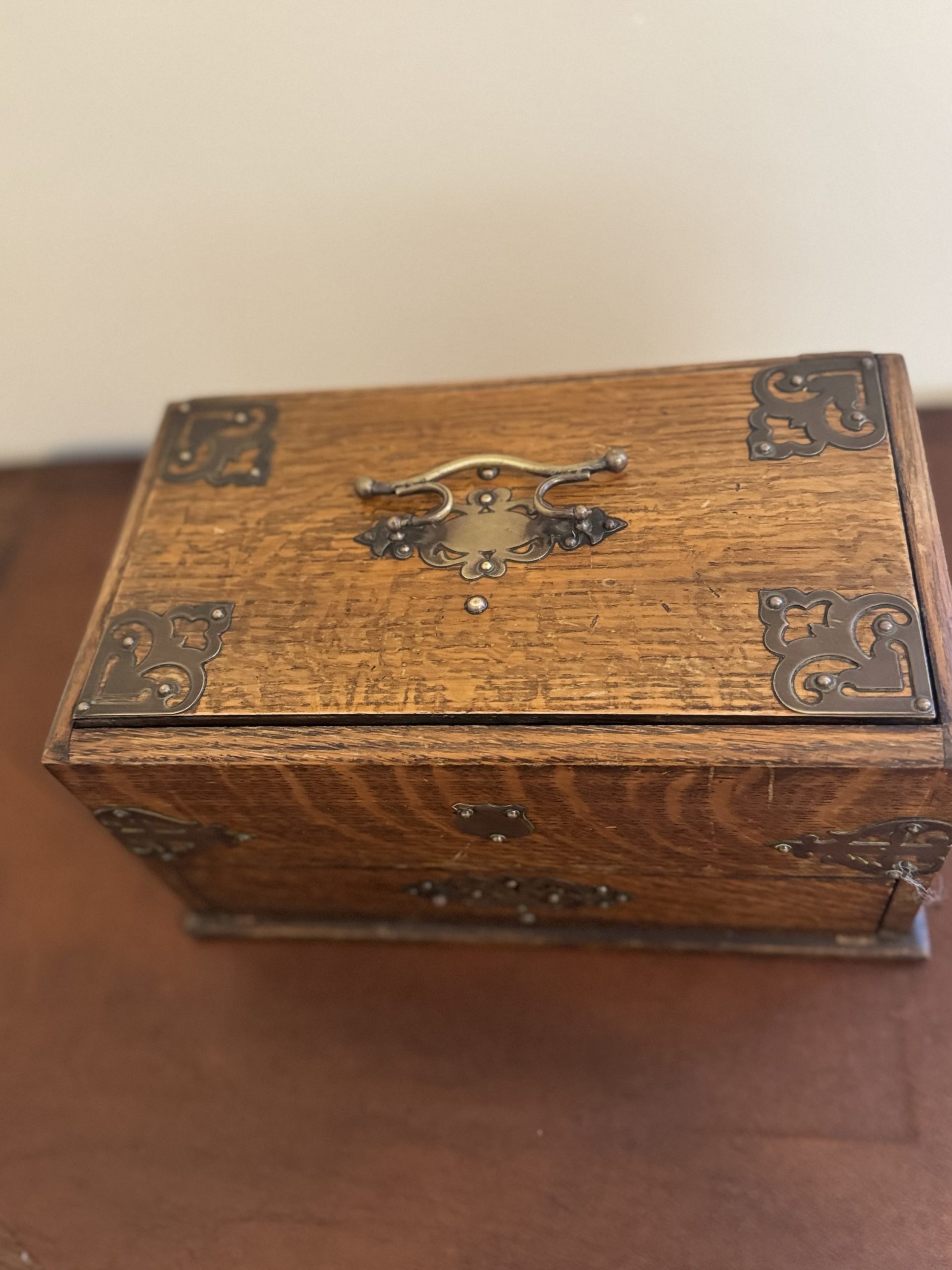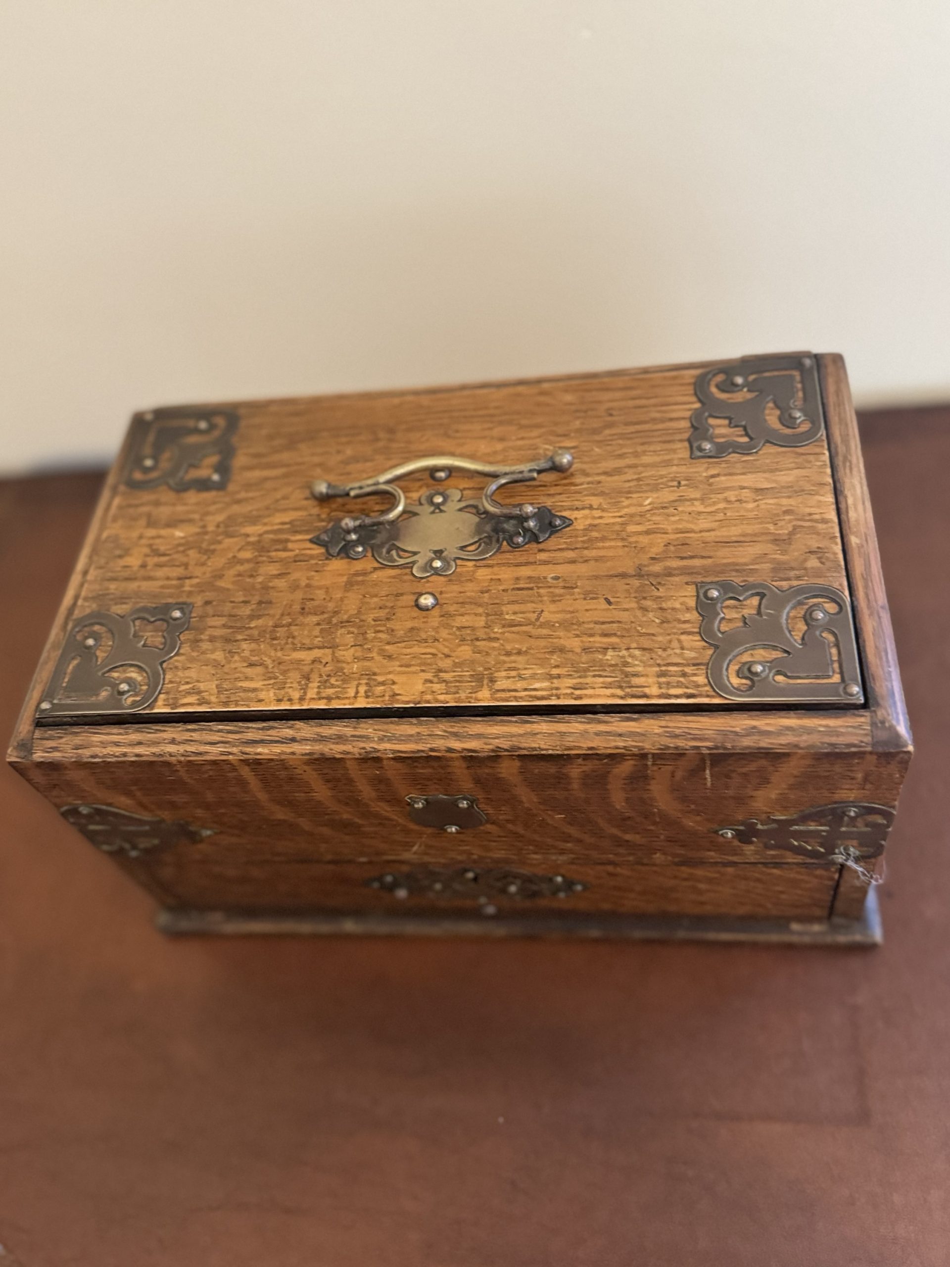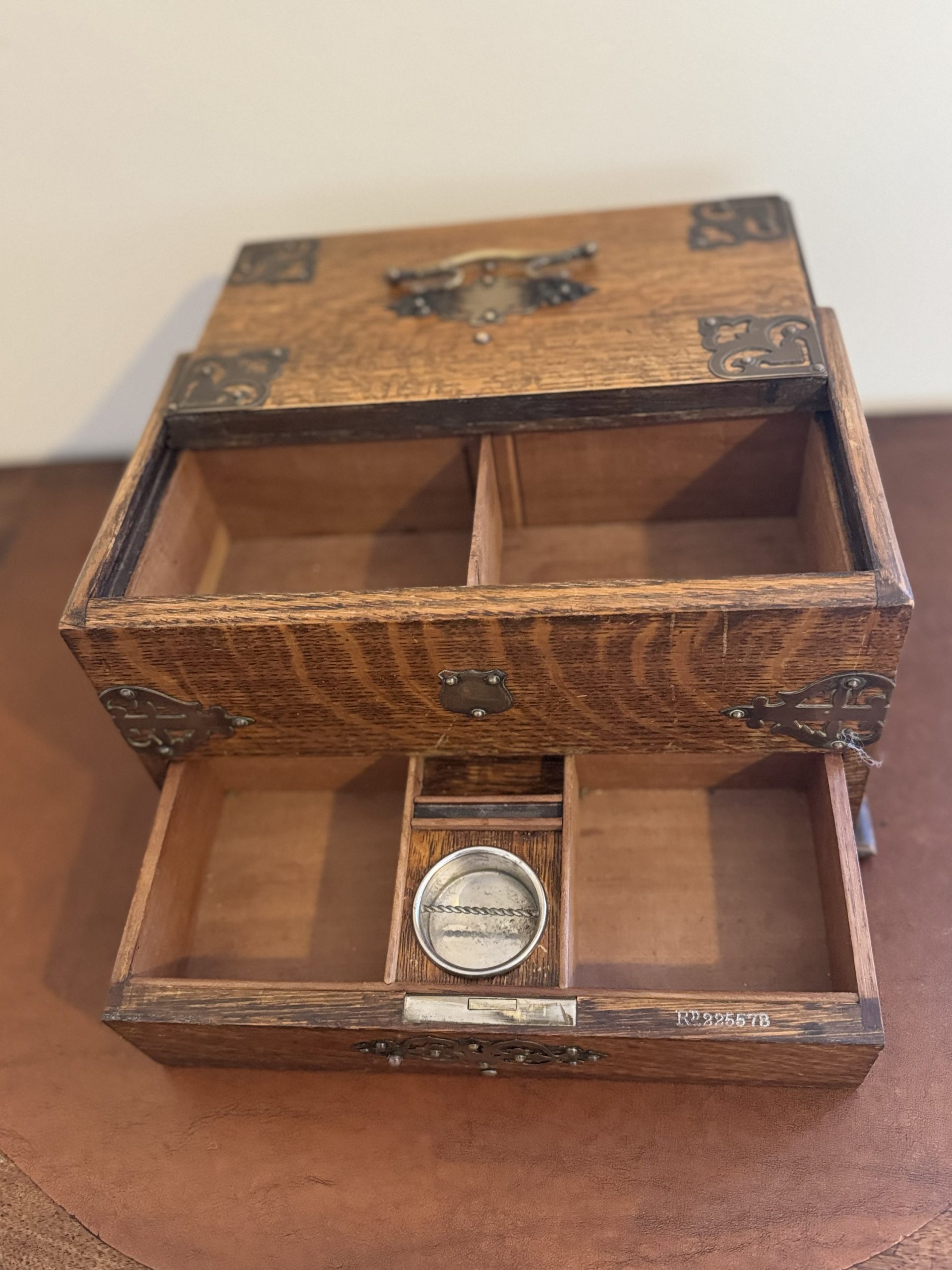 Early 1900’s unique oak Cigar box with sliding lid mechanism original silver ashtray. A lovely decorative item.
