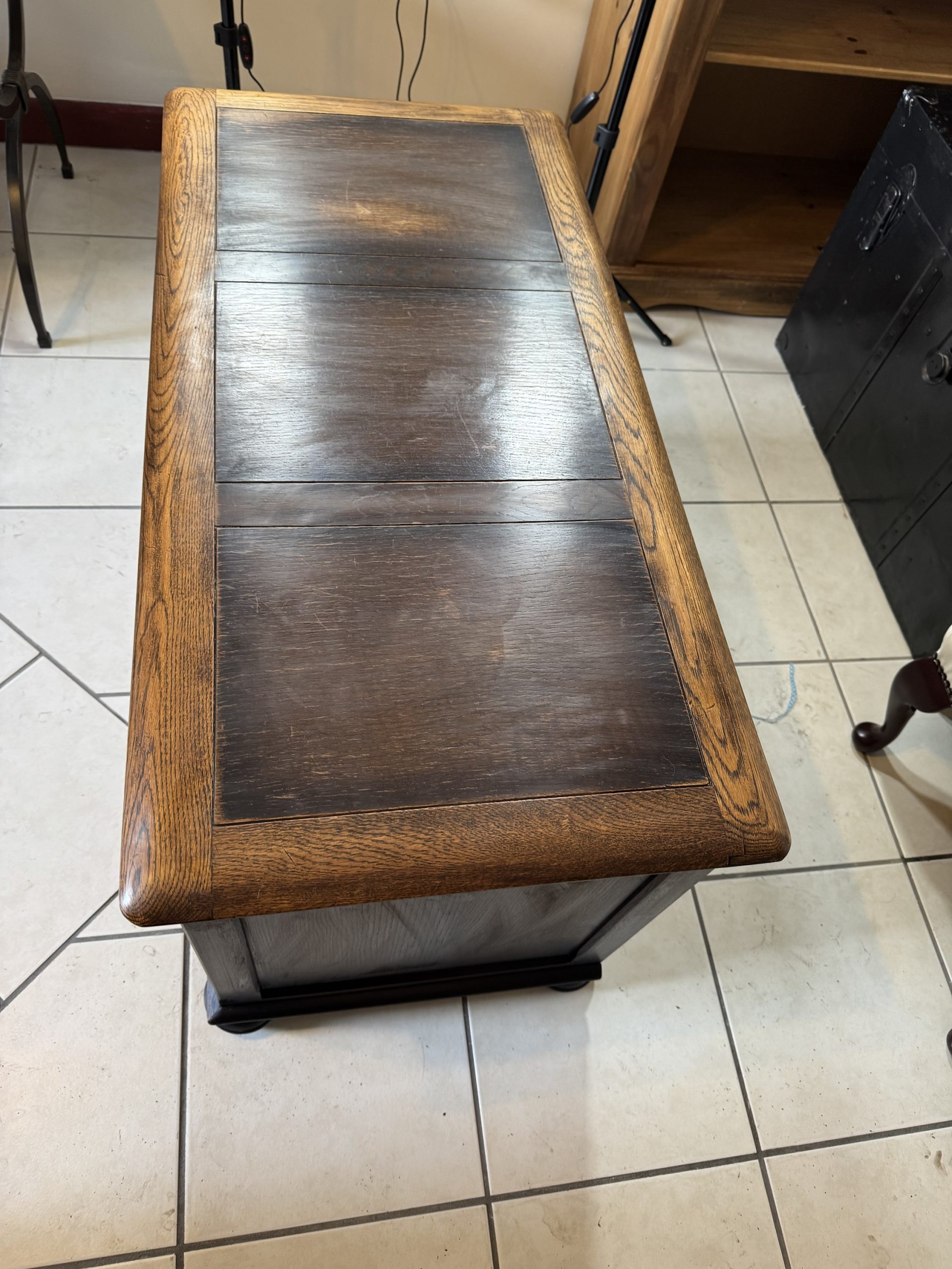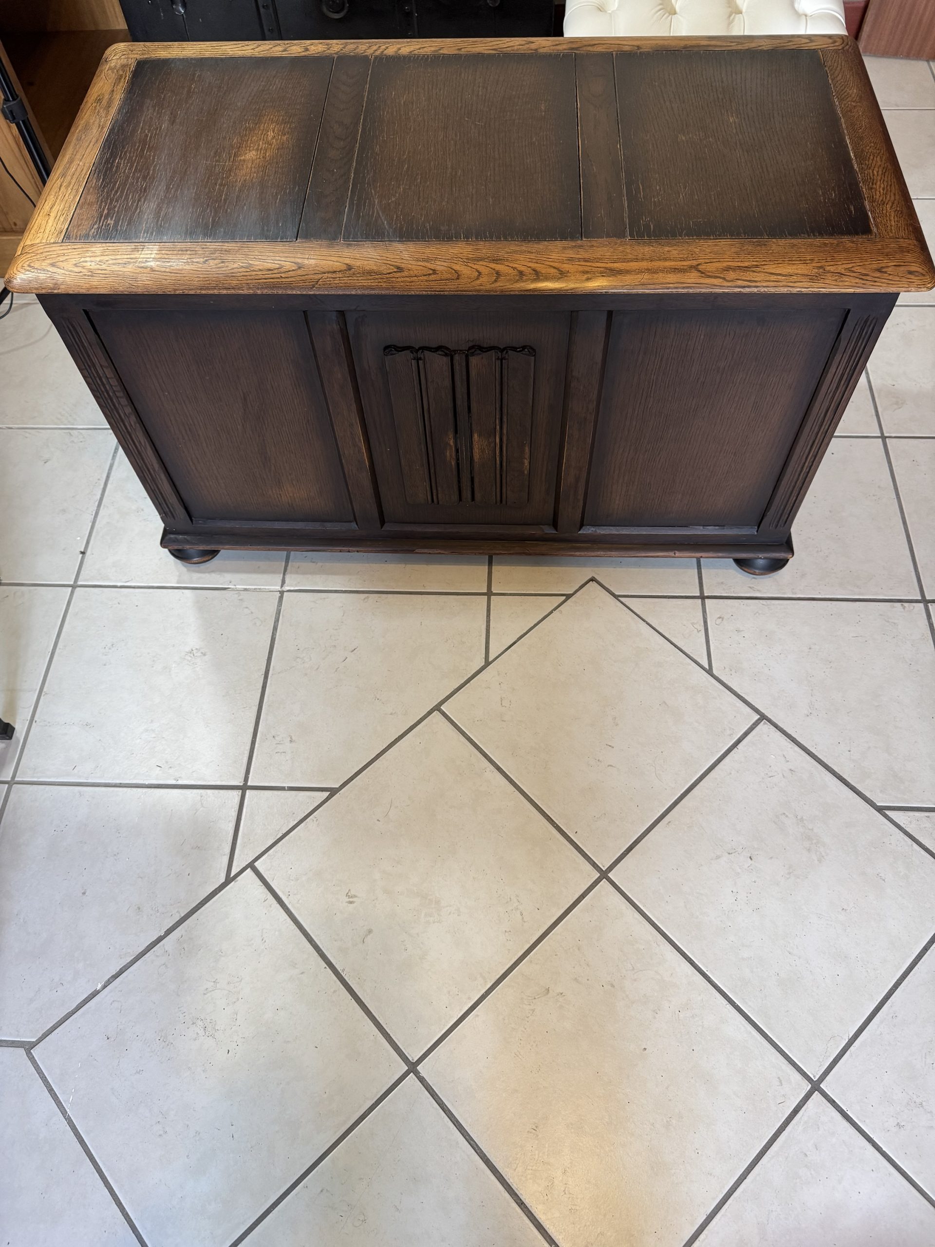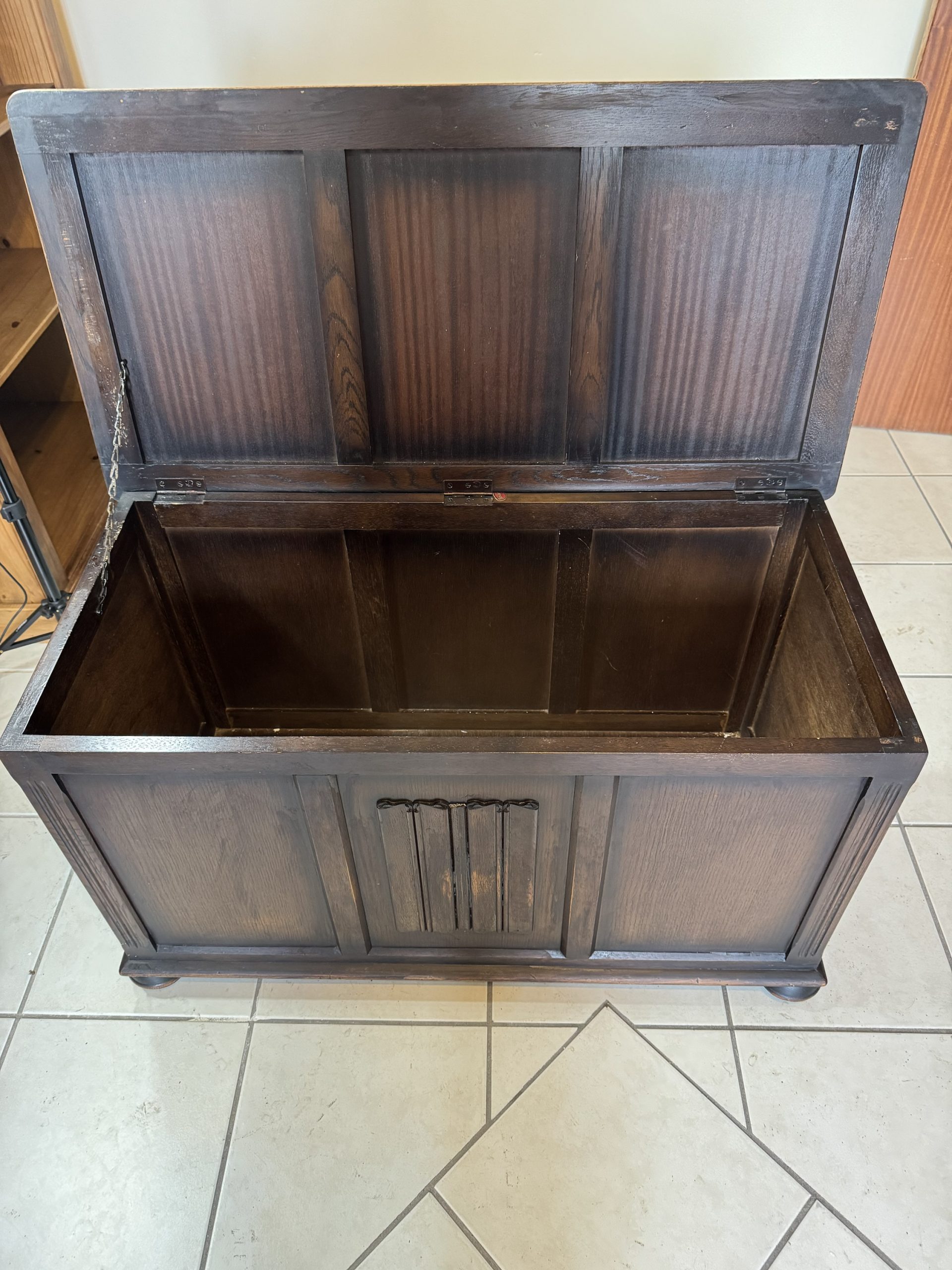 Early 20th century Jacobean style blanket case featuring side panels and decoratively carved front. Length 96cm width 49cm. Height 55cm