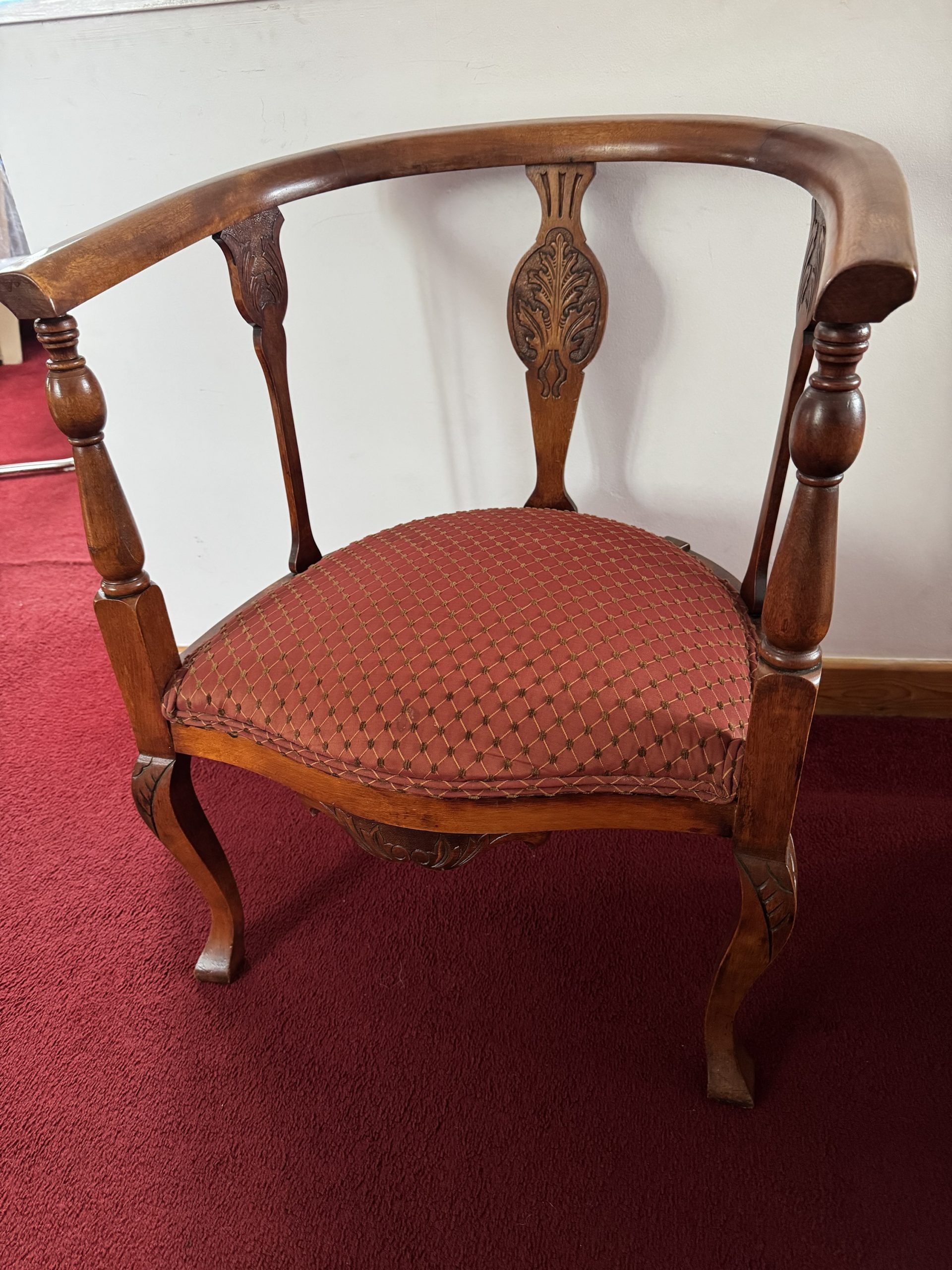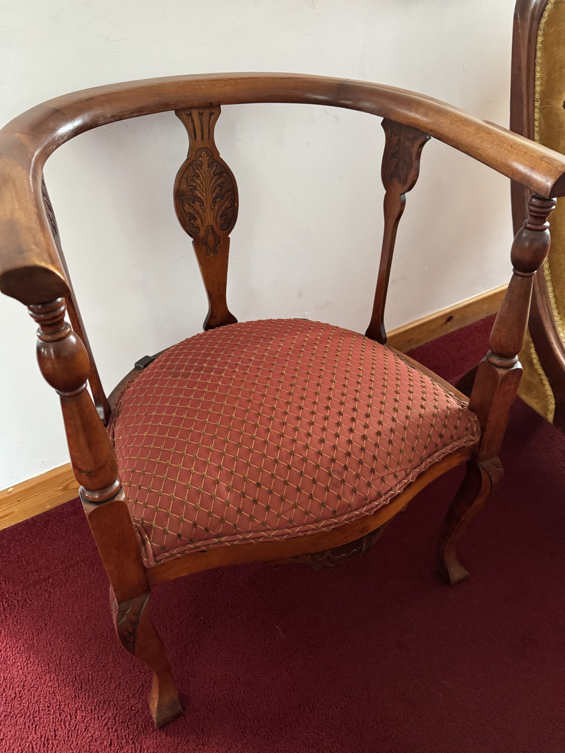 Late Victorian mahogany dog legged corner chair with red upholstered beautifully carved item