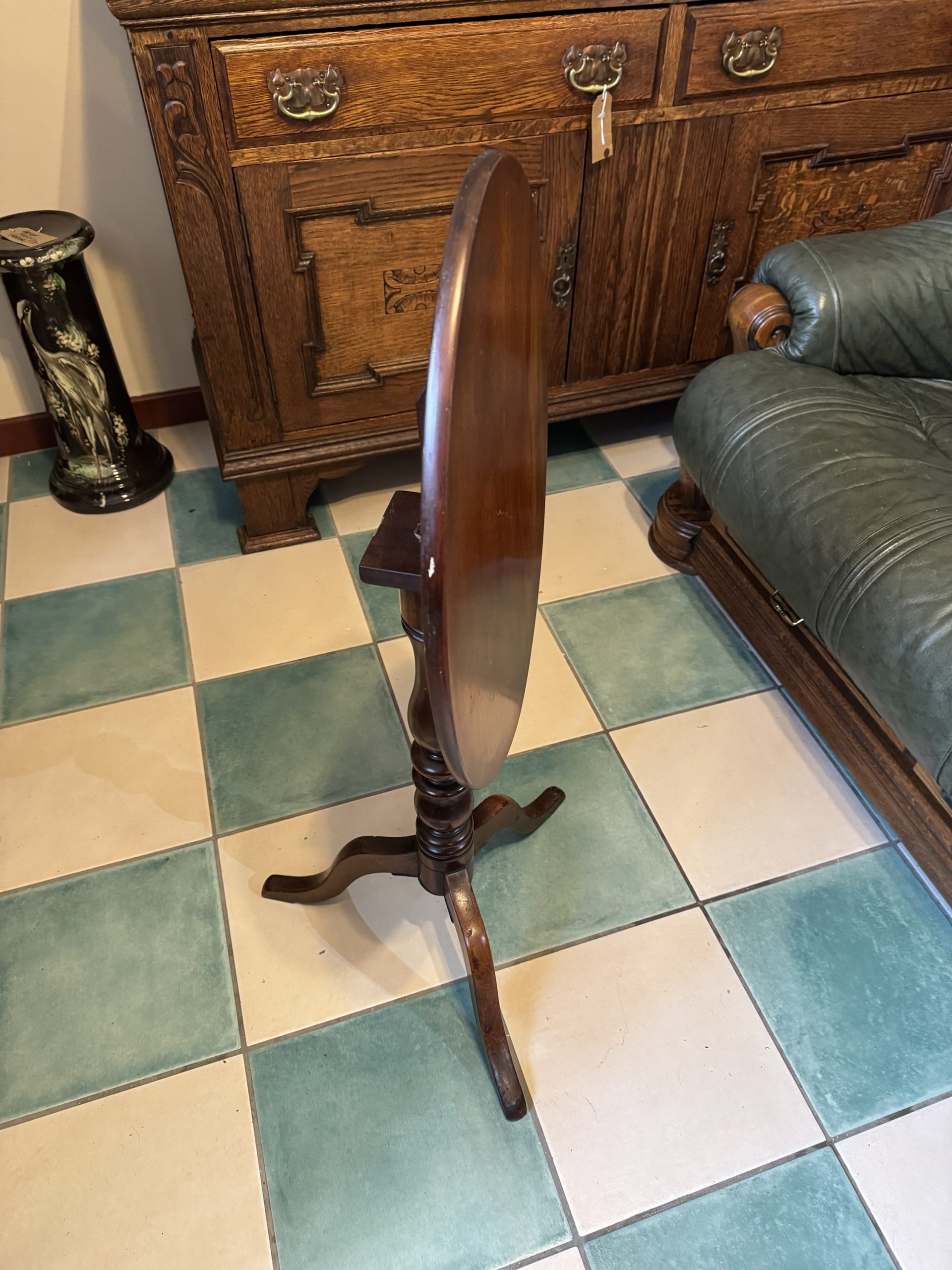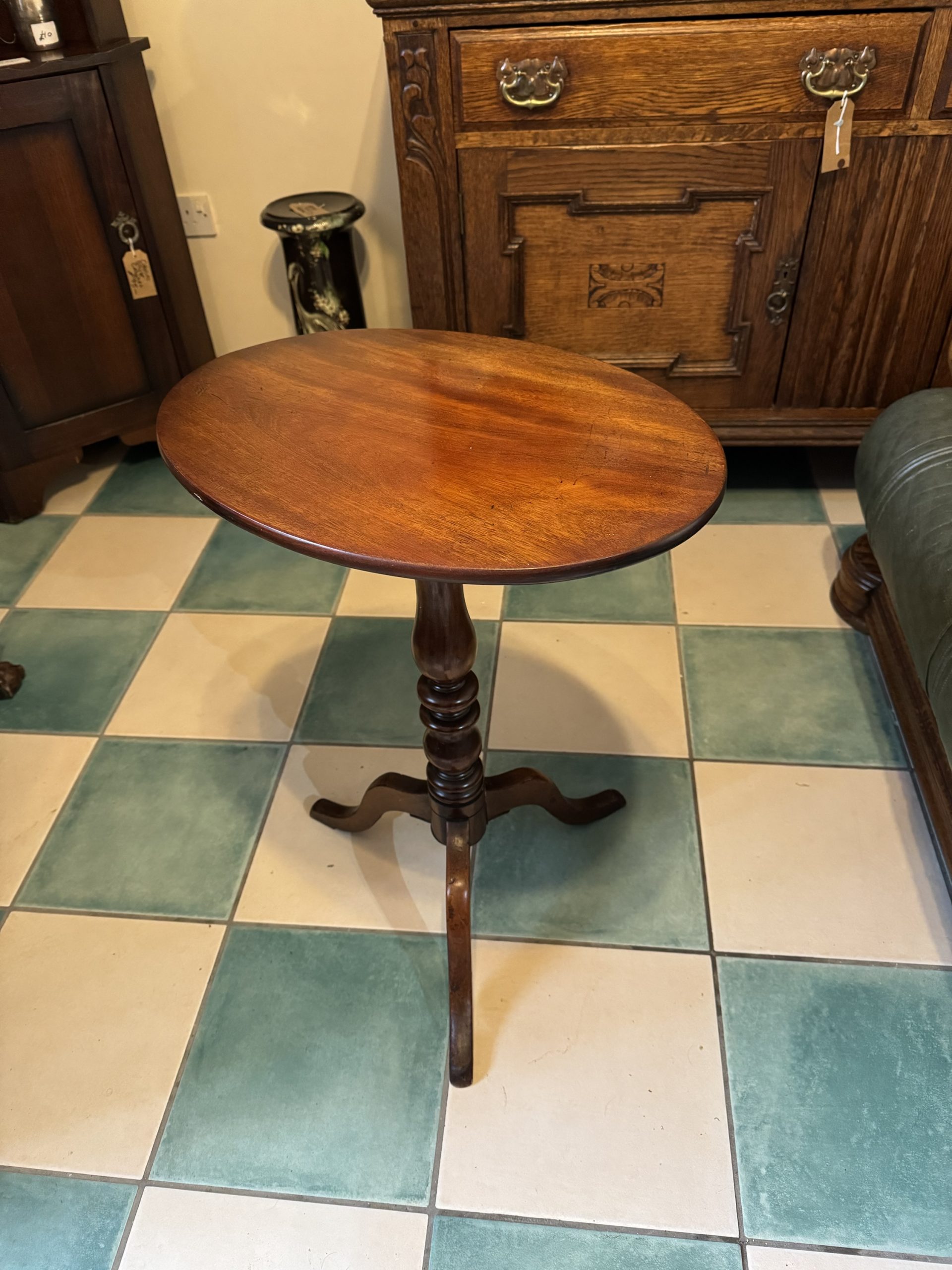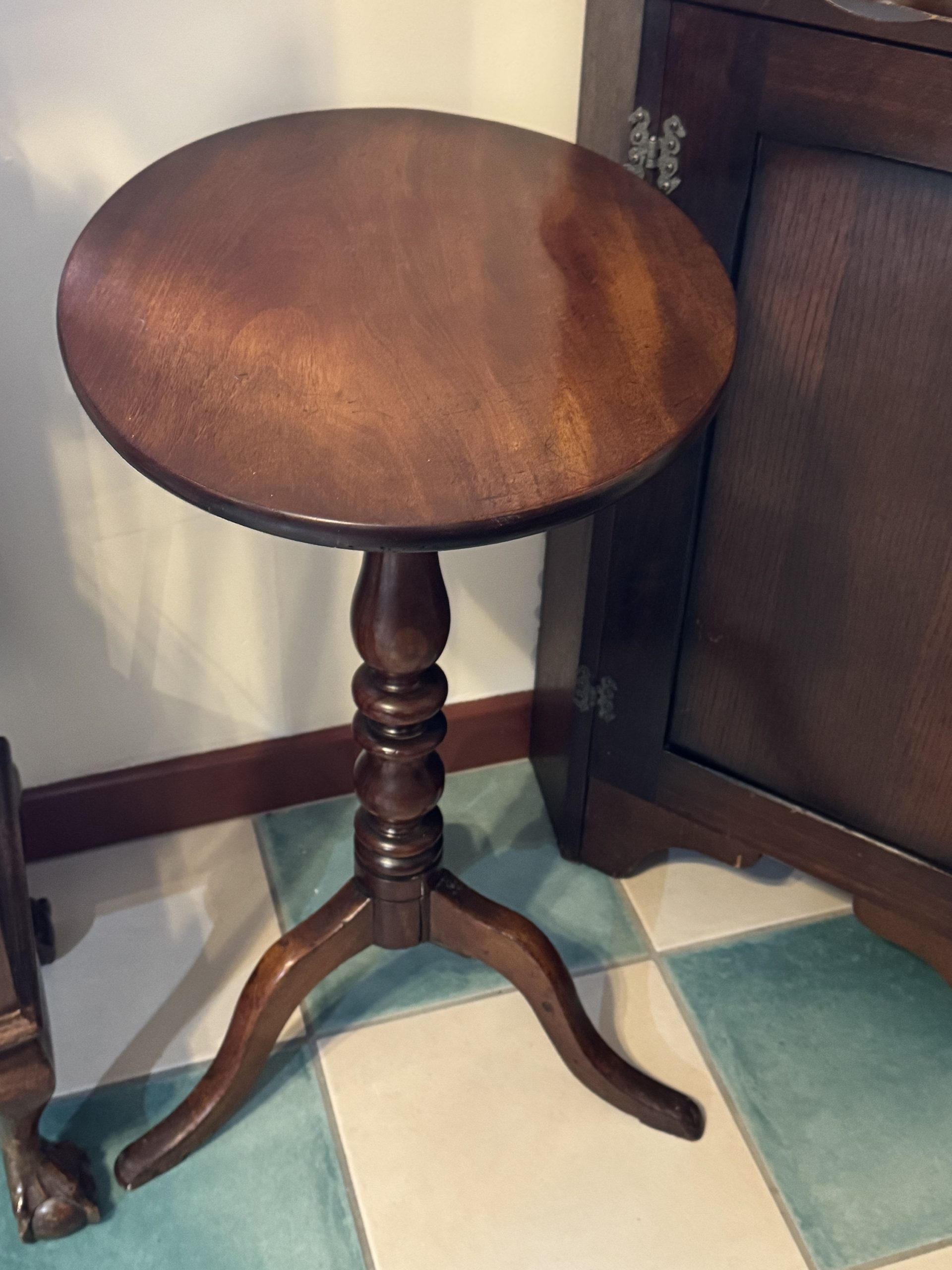 1900-1919 English Mahogany oval topped bobbin pedestal side table. A beautiful and functional showcase piece of furniture