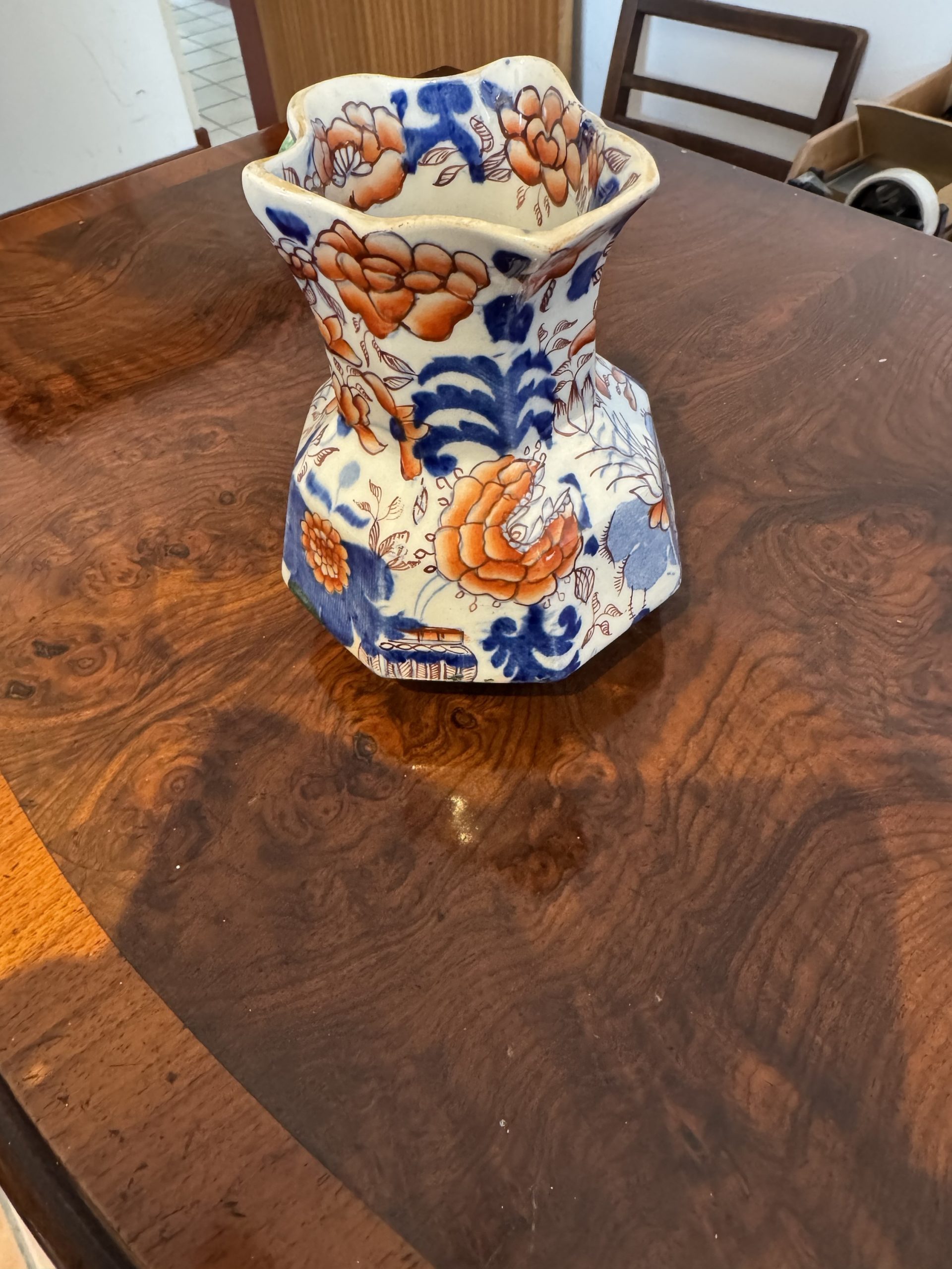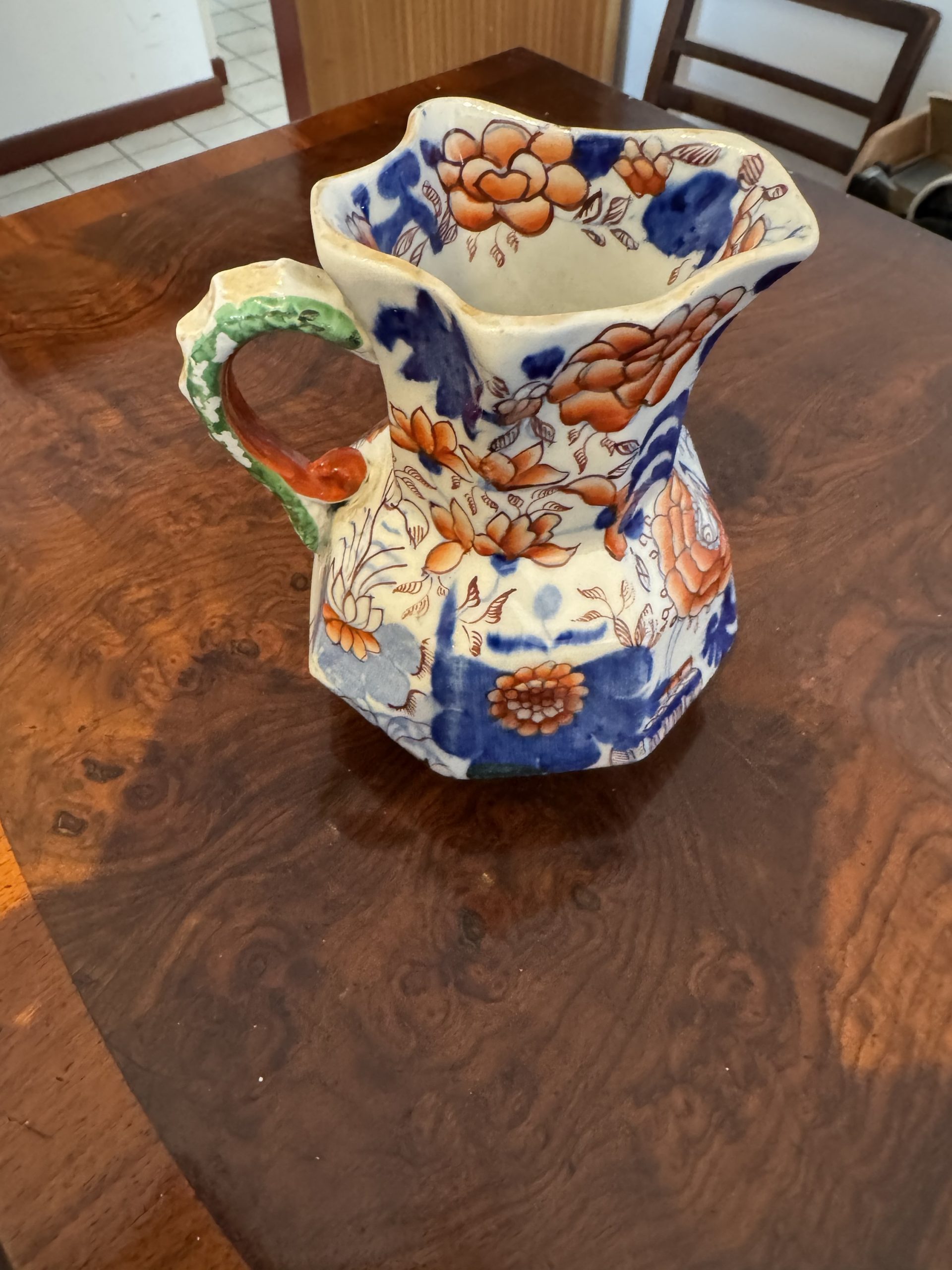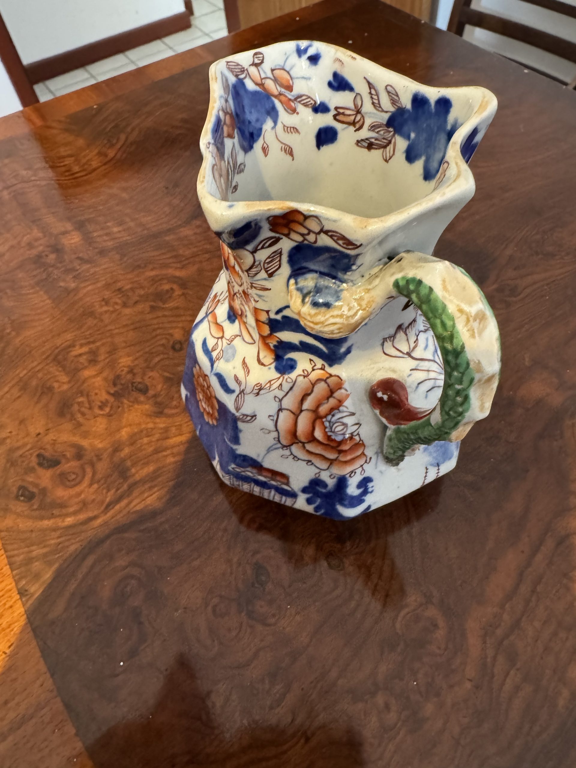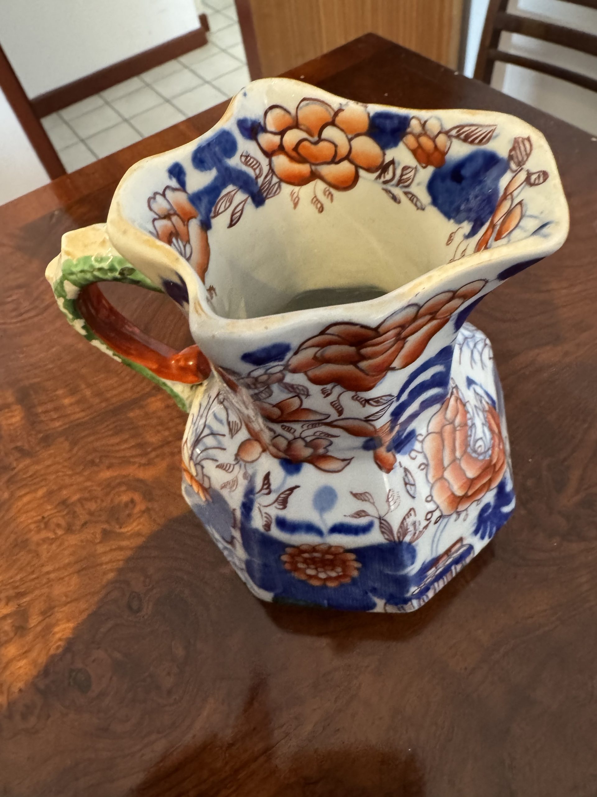 1815-1850 English Masons Ironstone pitcher with floral decoration and dragon handle with a Imari style. This jug “Hydra” has an octagonal shape.