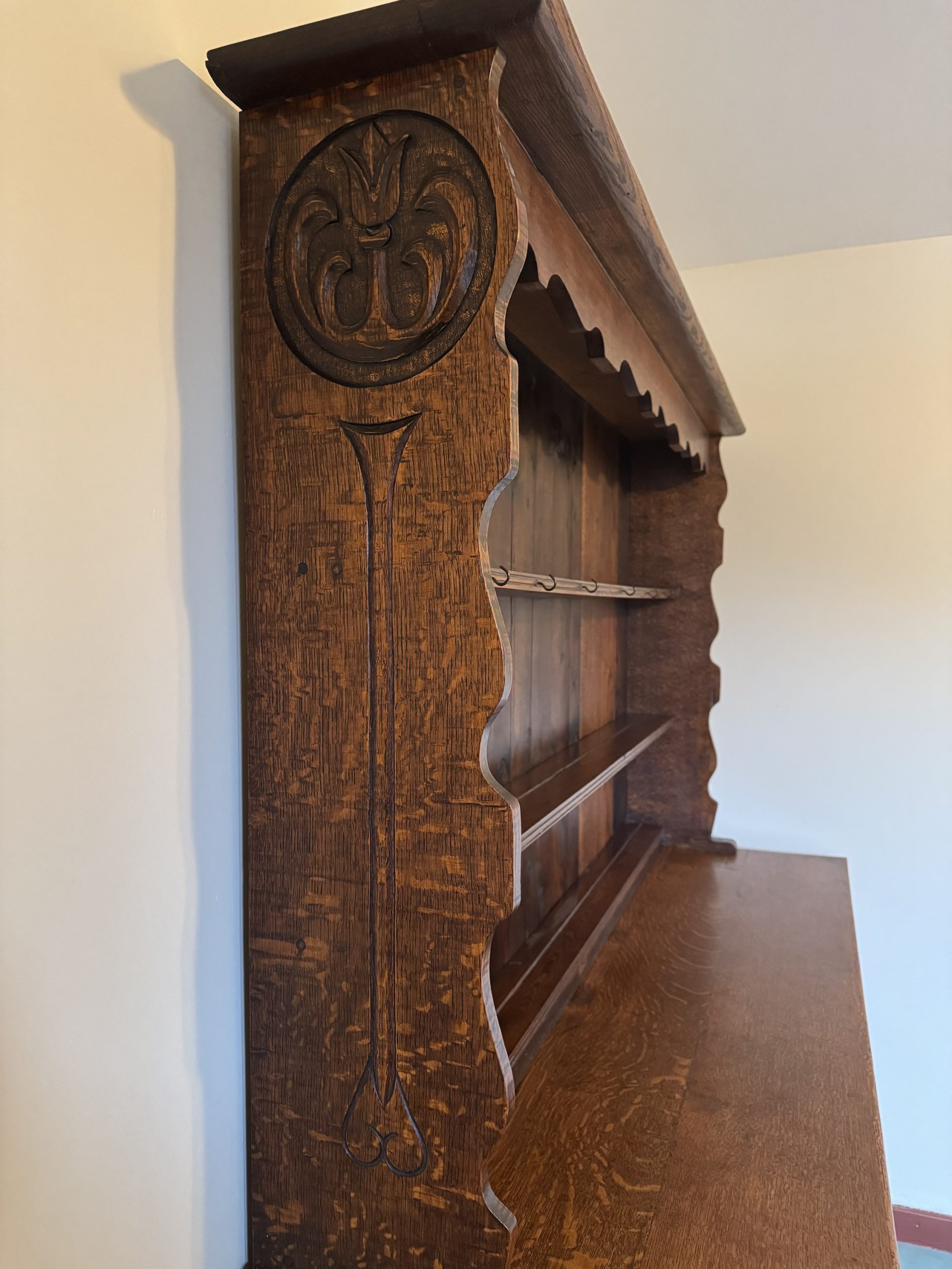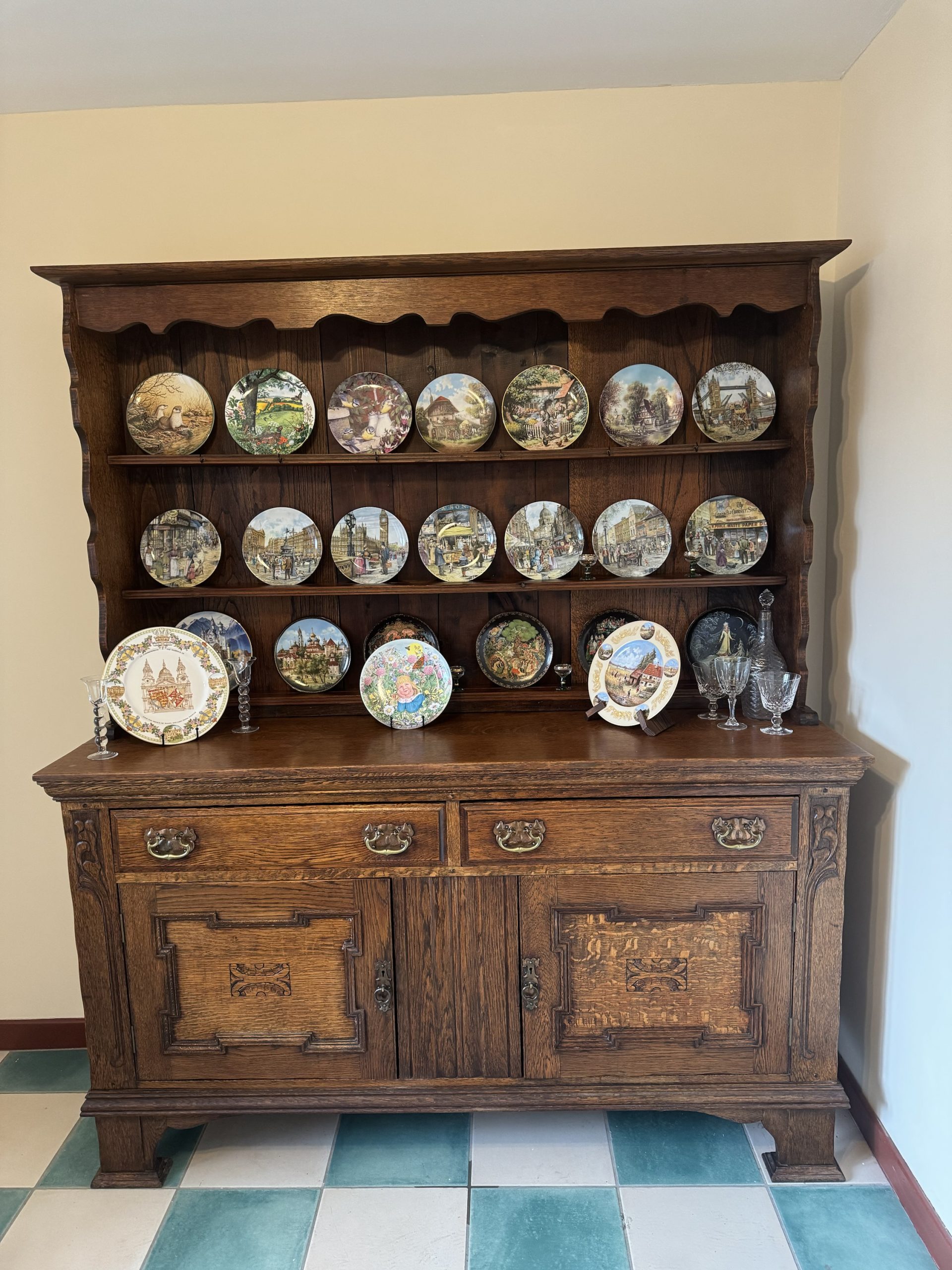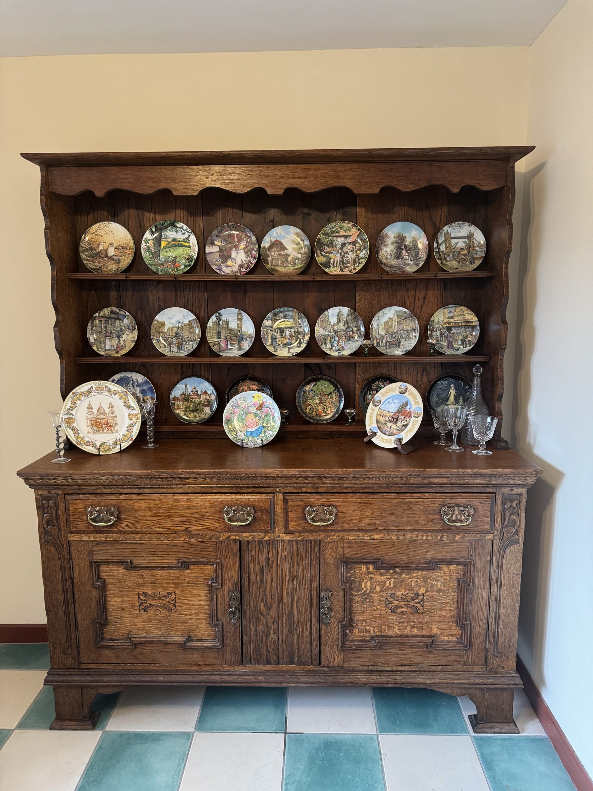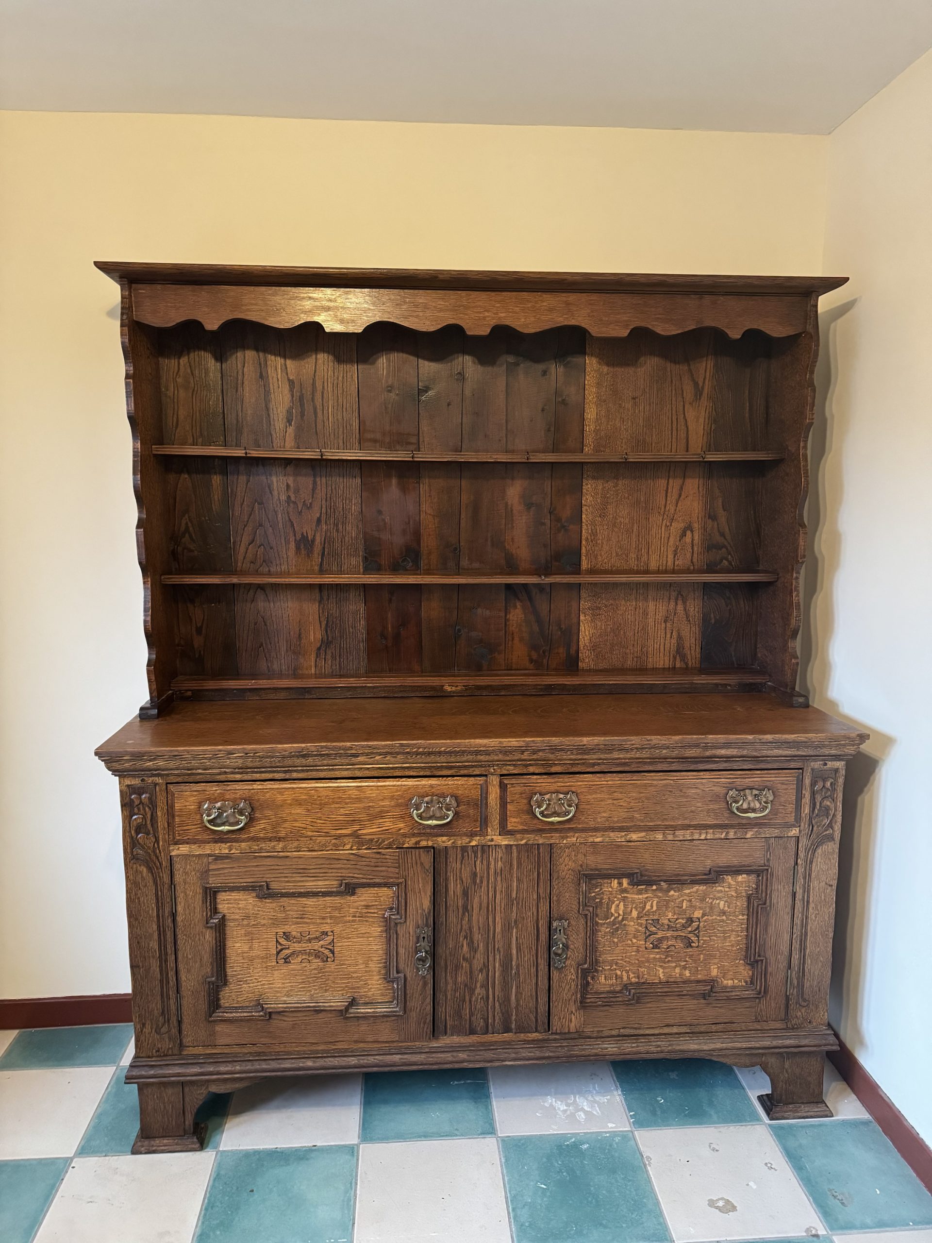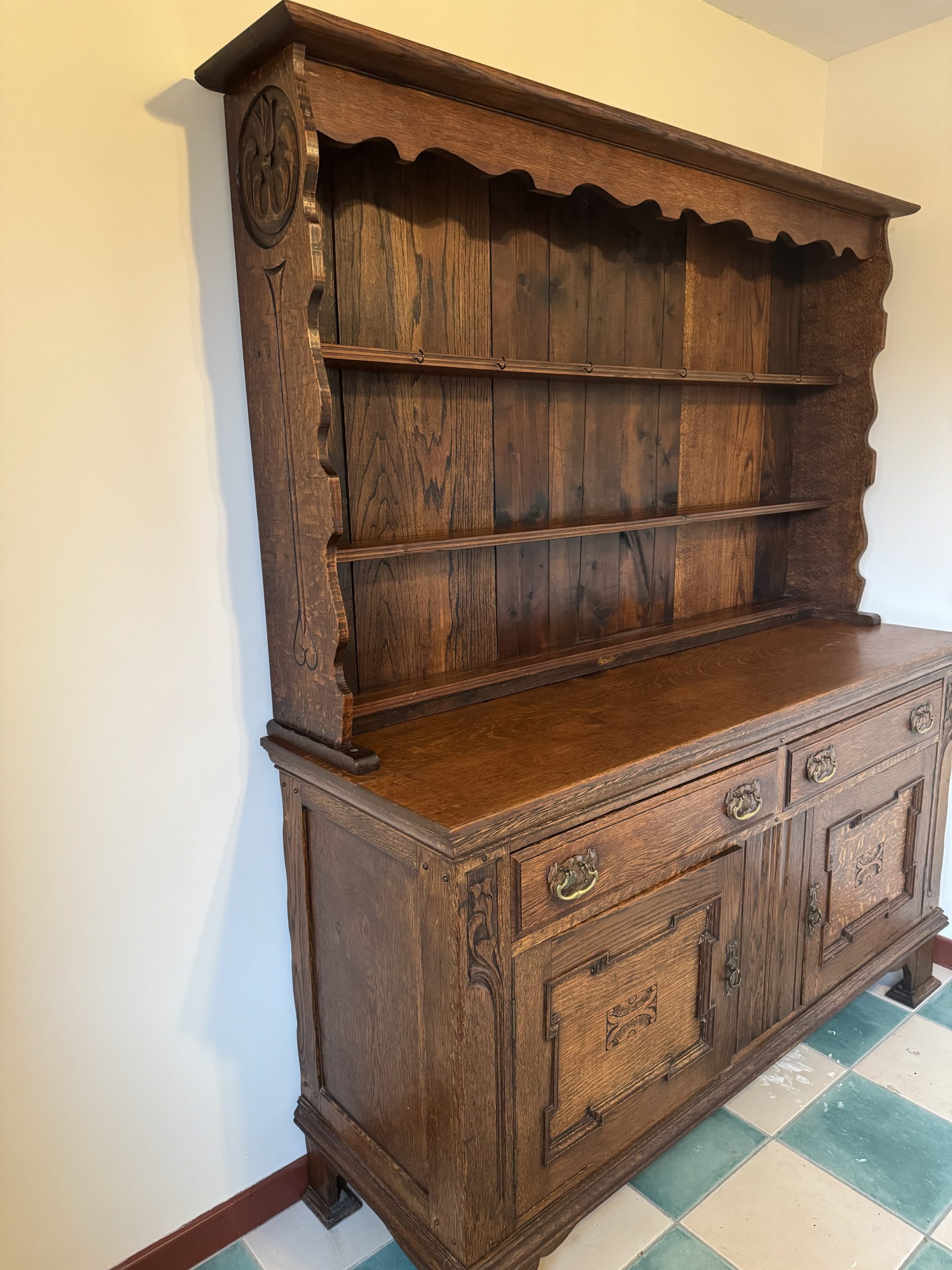 Late 19th century Oak dresser consisting of base including 2 x draws 2 x cupboards top shelving unit. This beautiful antique with intricate carvings and brass detailing is a real show stopper