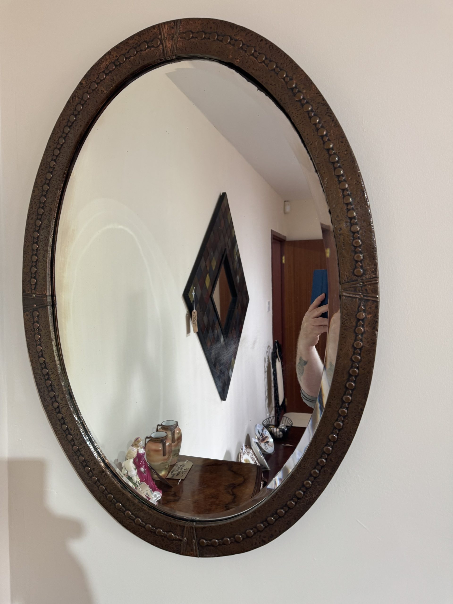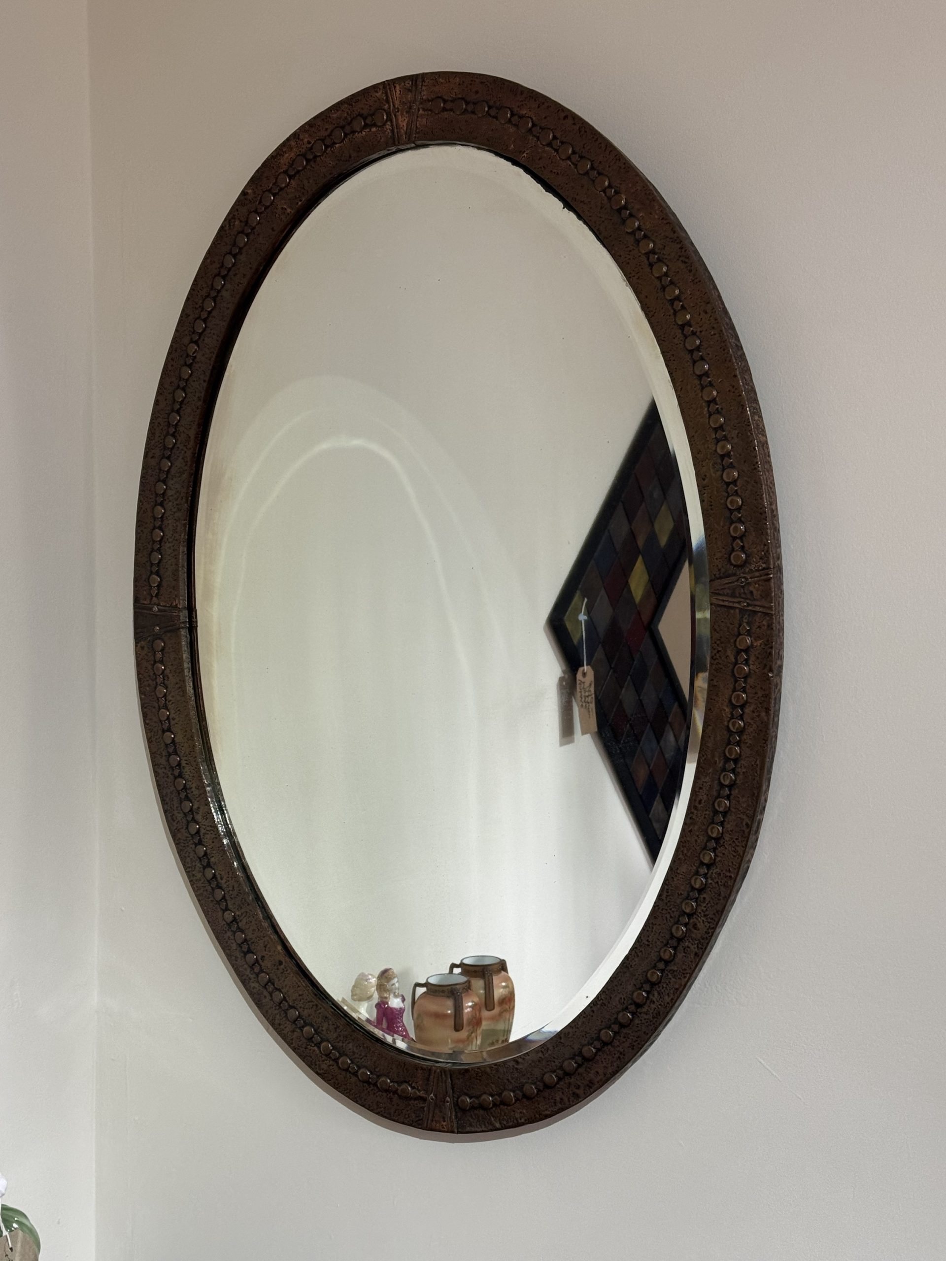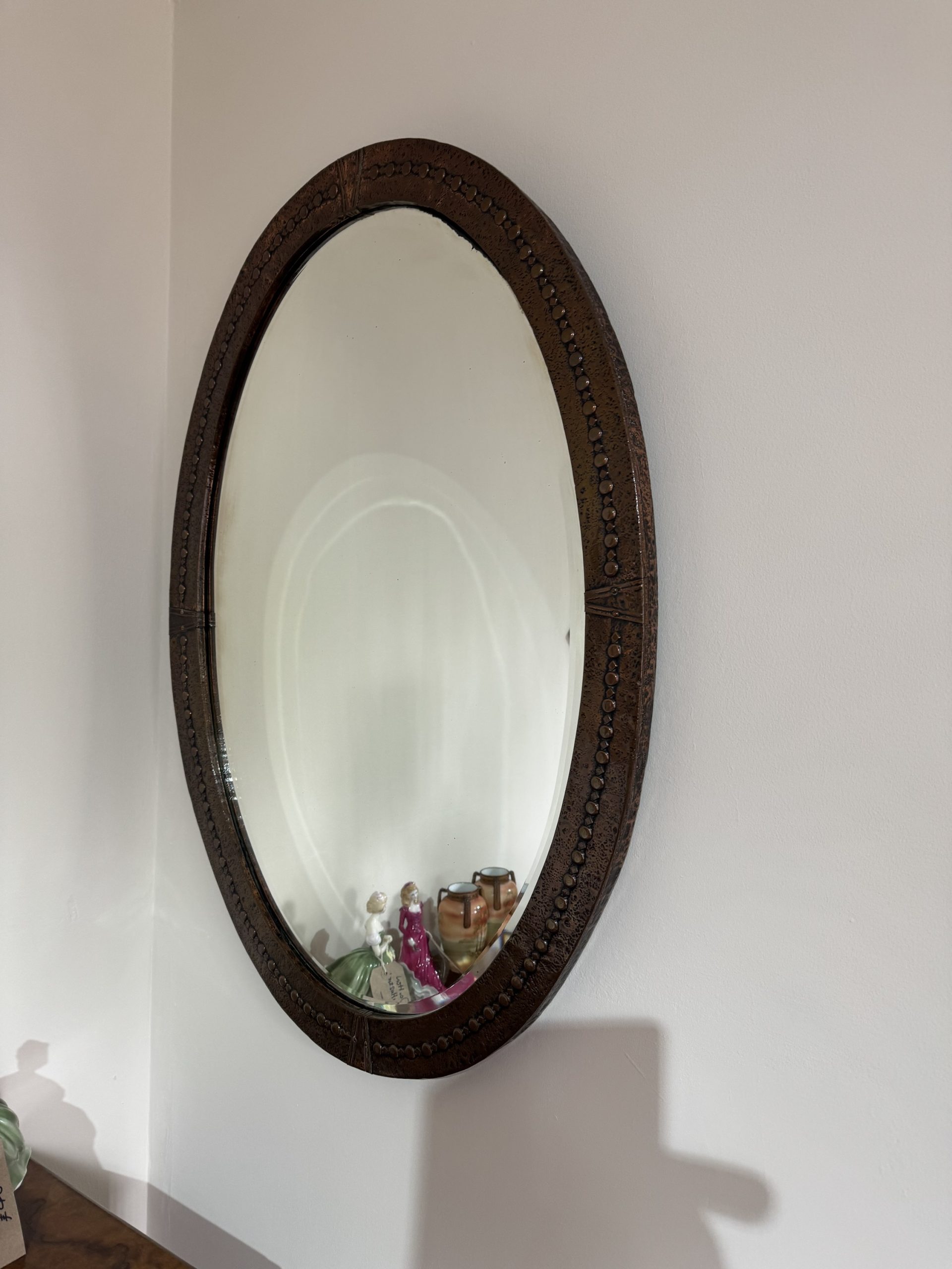 Arts and crafts beaten copper oval mirror with Celtic knot decoration.