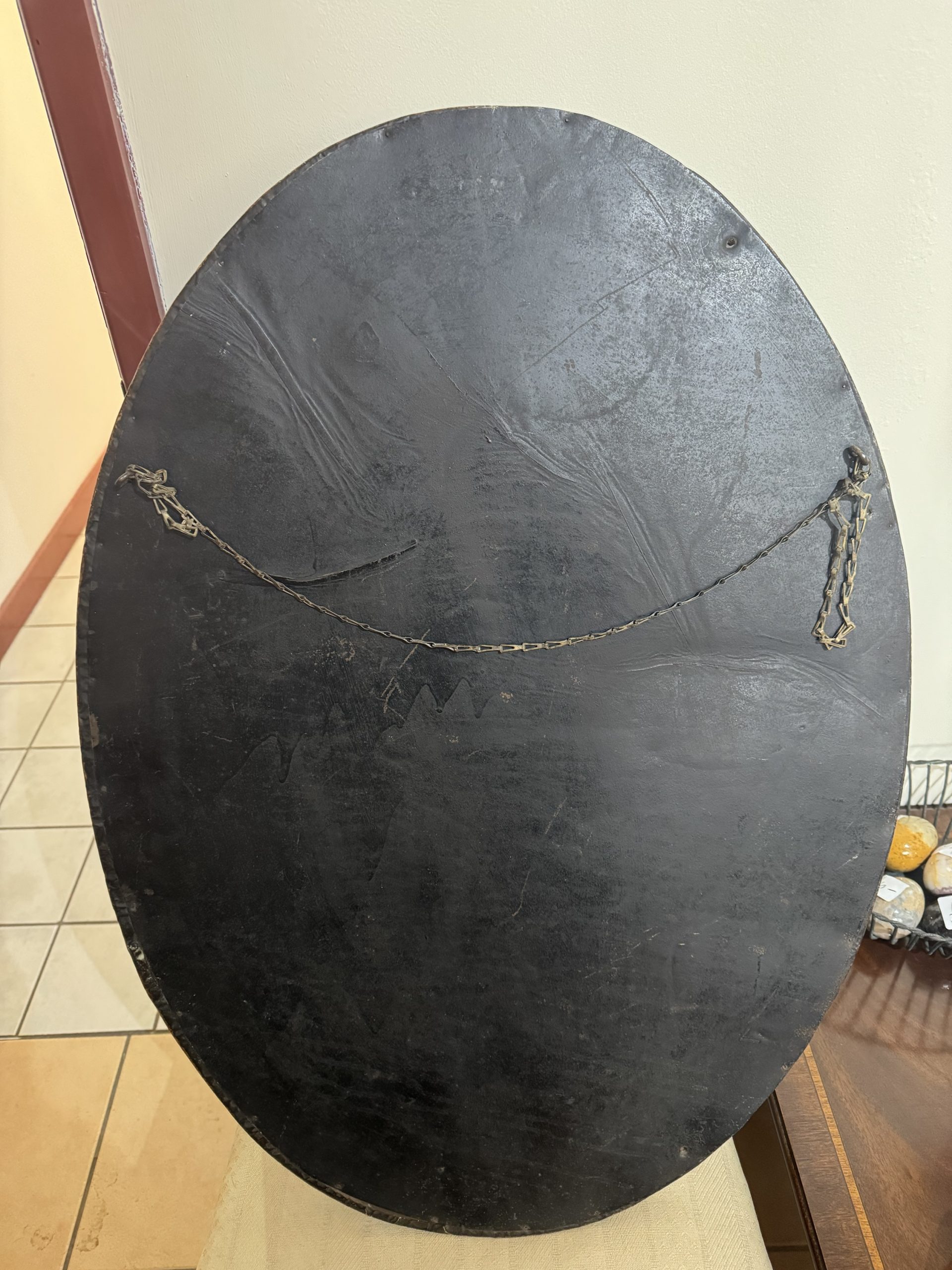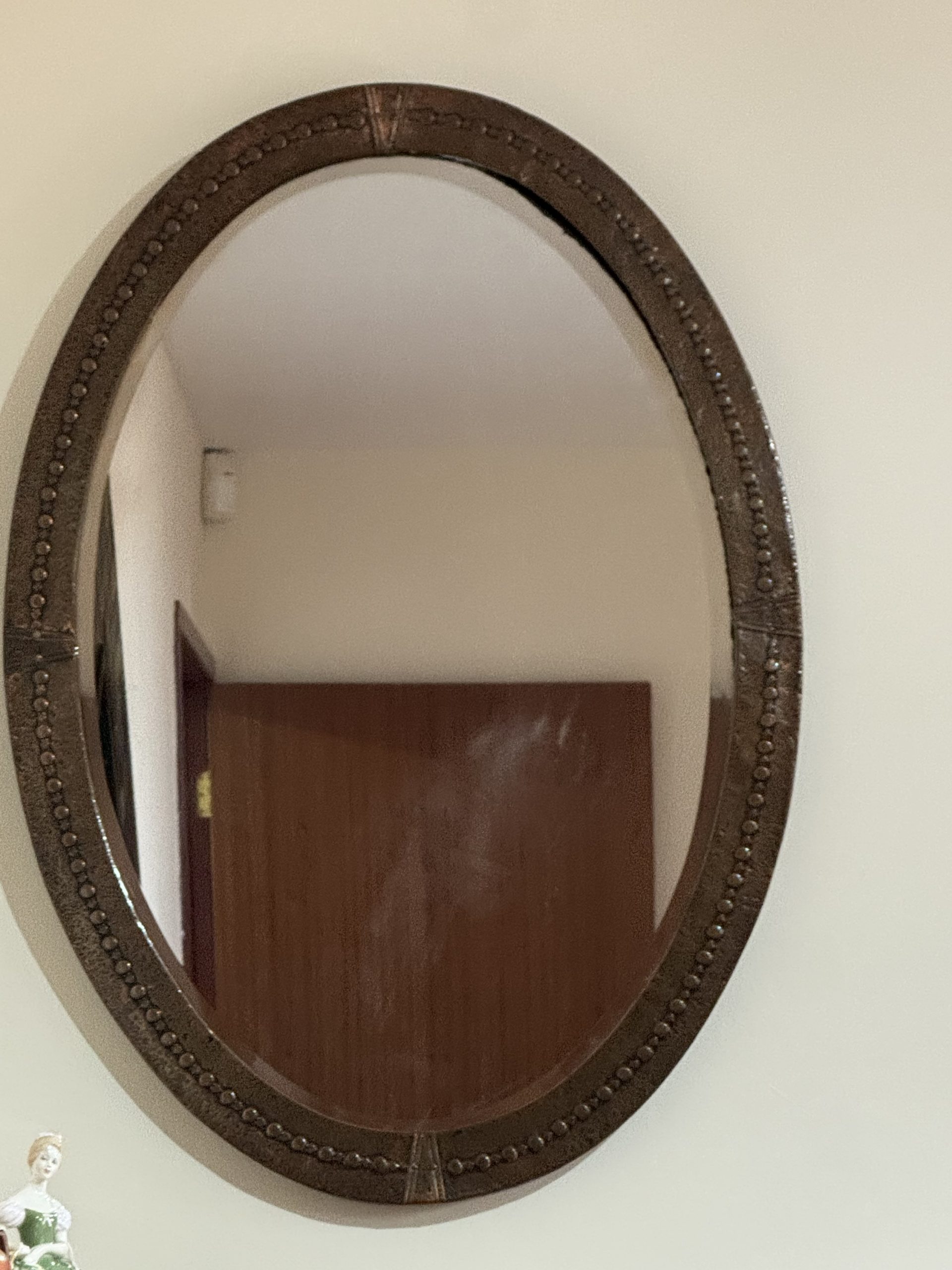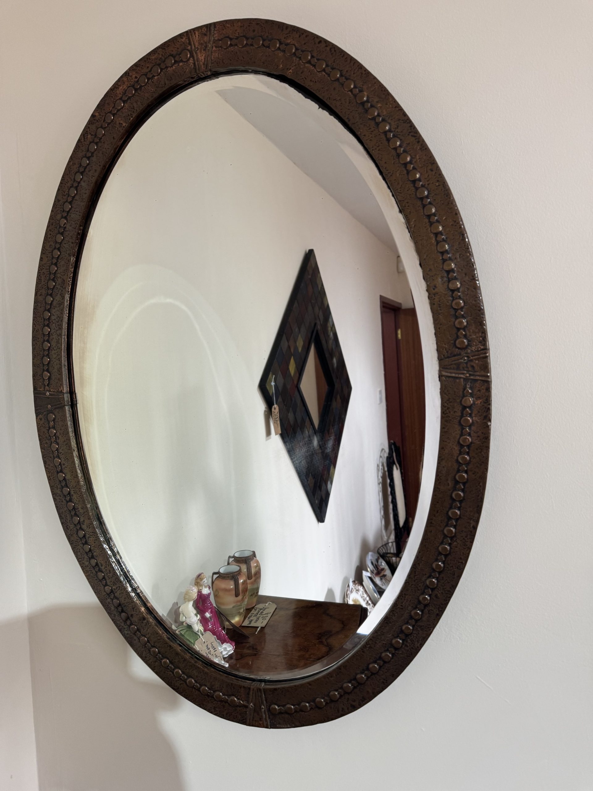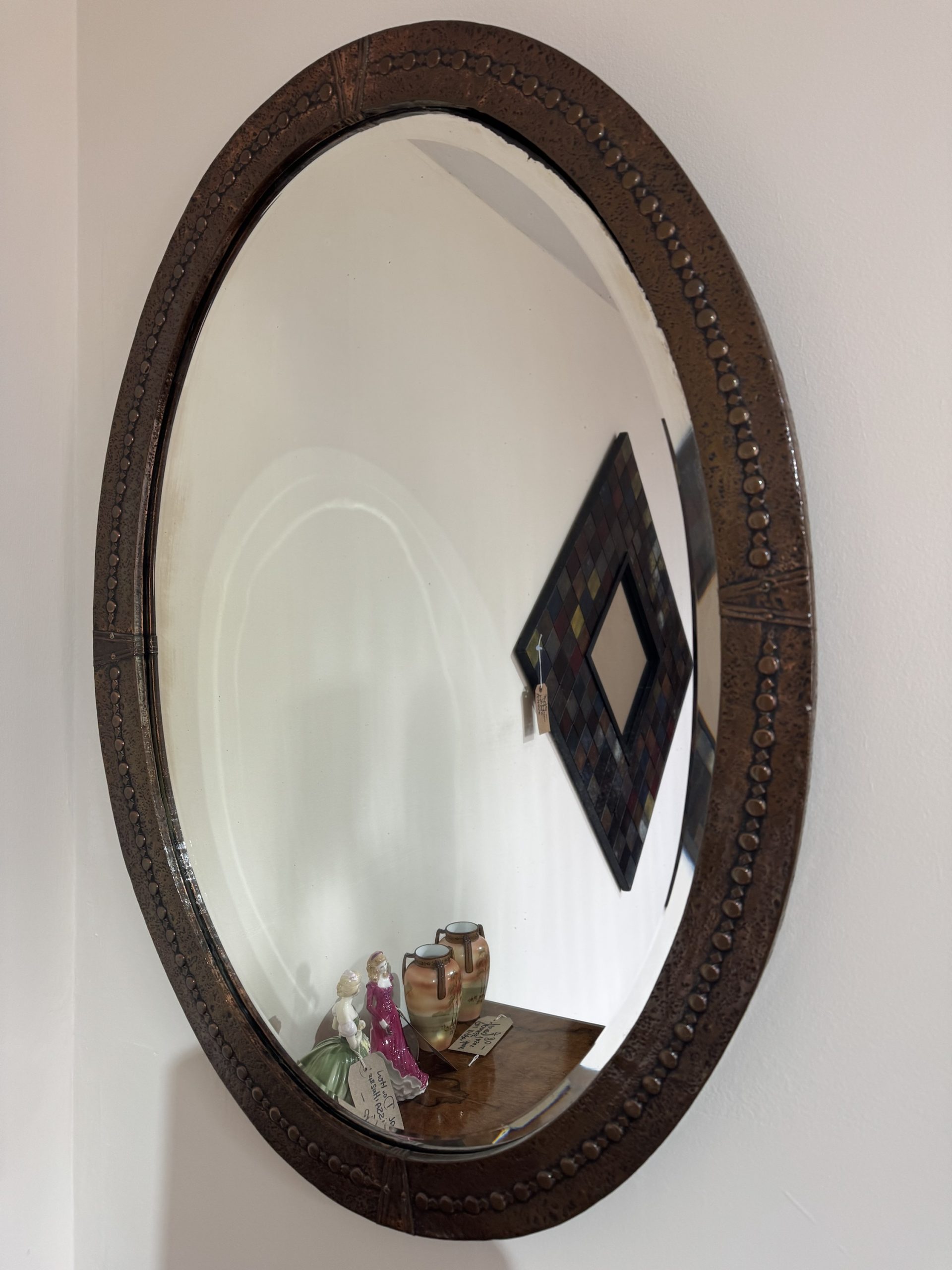 Arts and crafts beaten copper oval mirror with Celtic knot decoration.