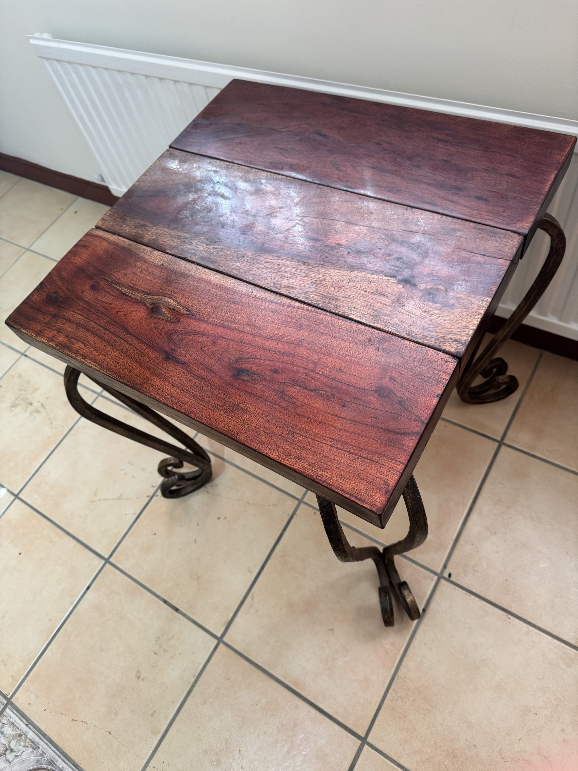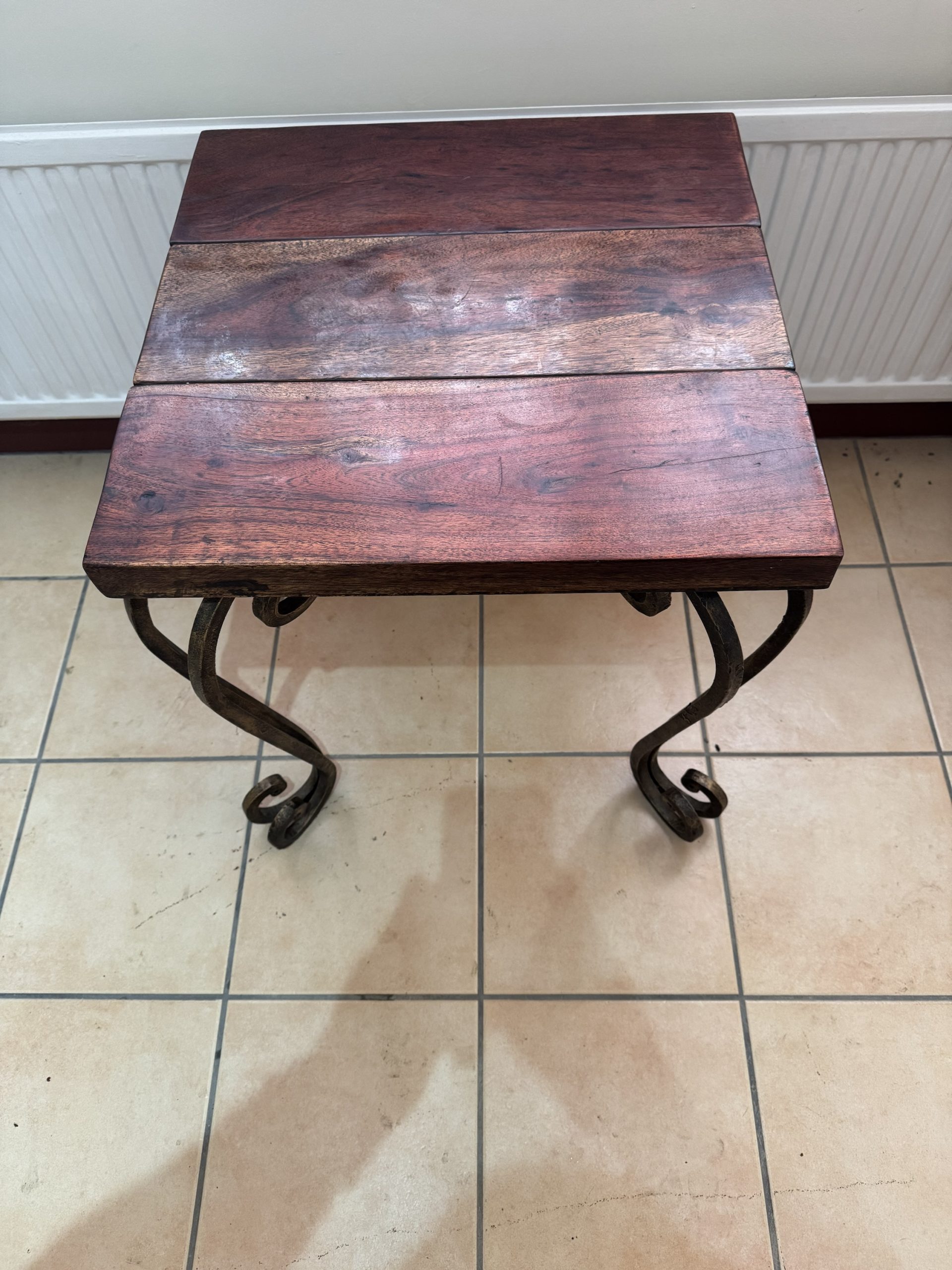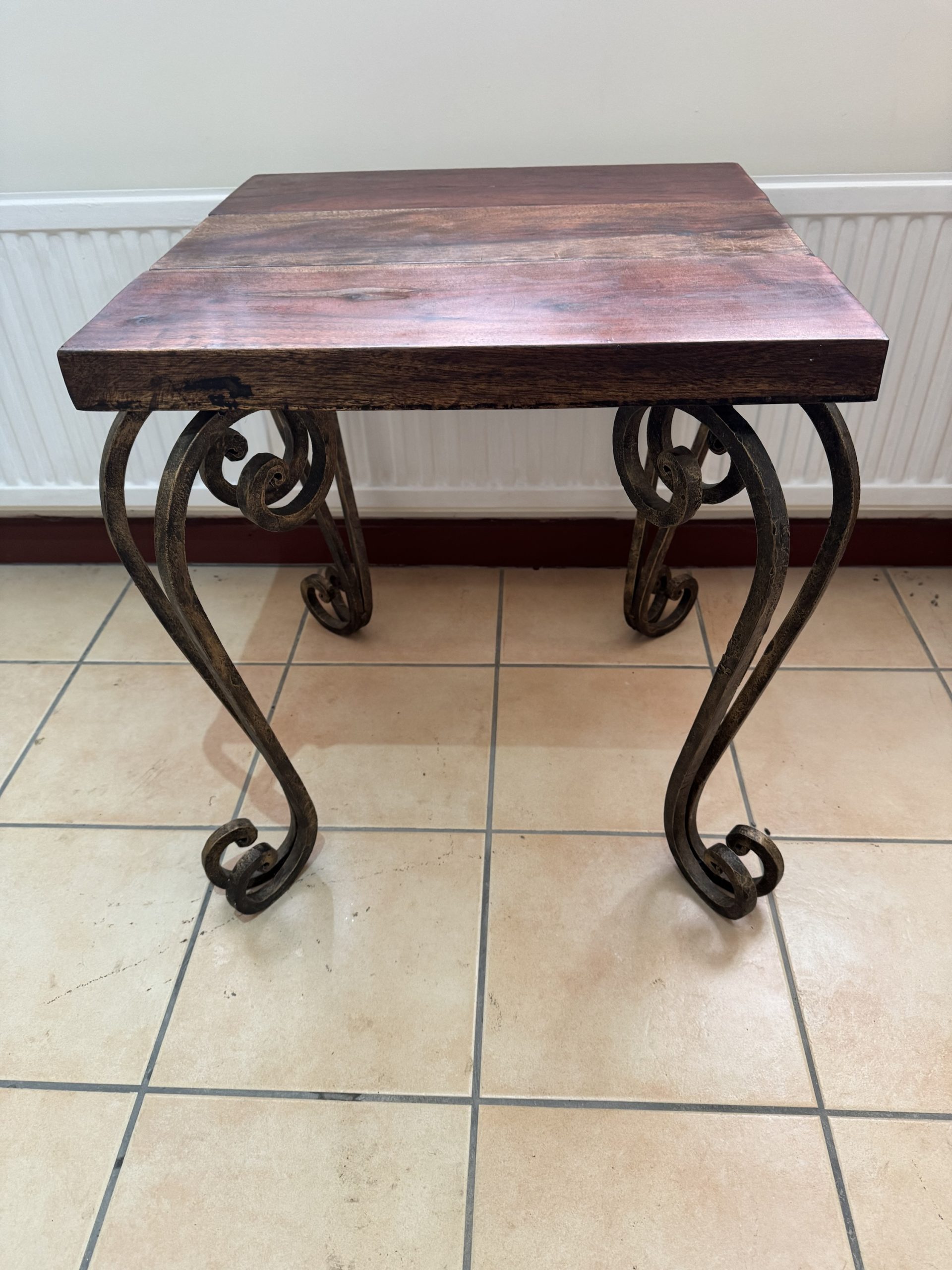 Mid 20th century dark wood topped side table with decorative wrought iron legs.
