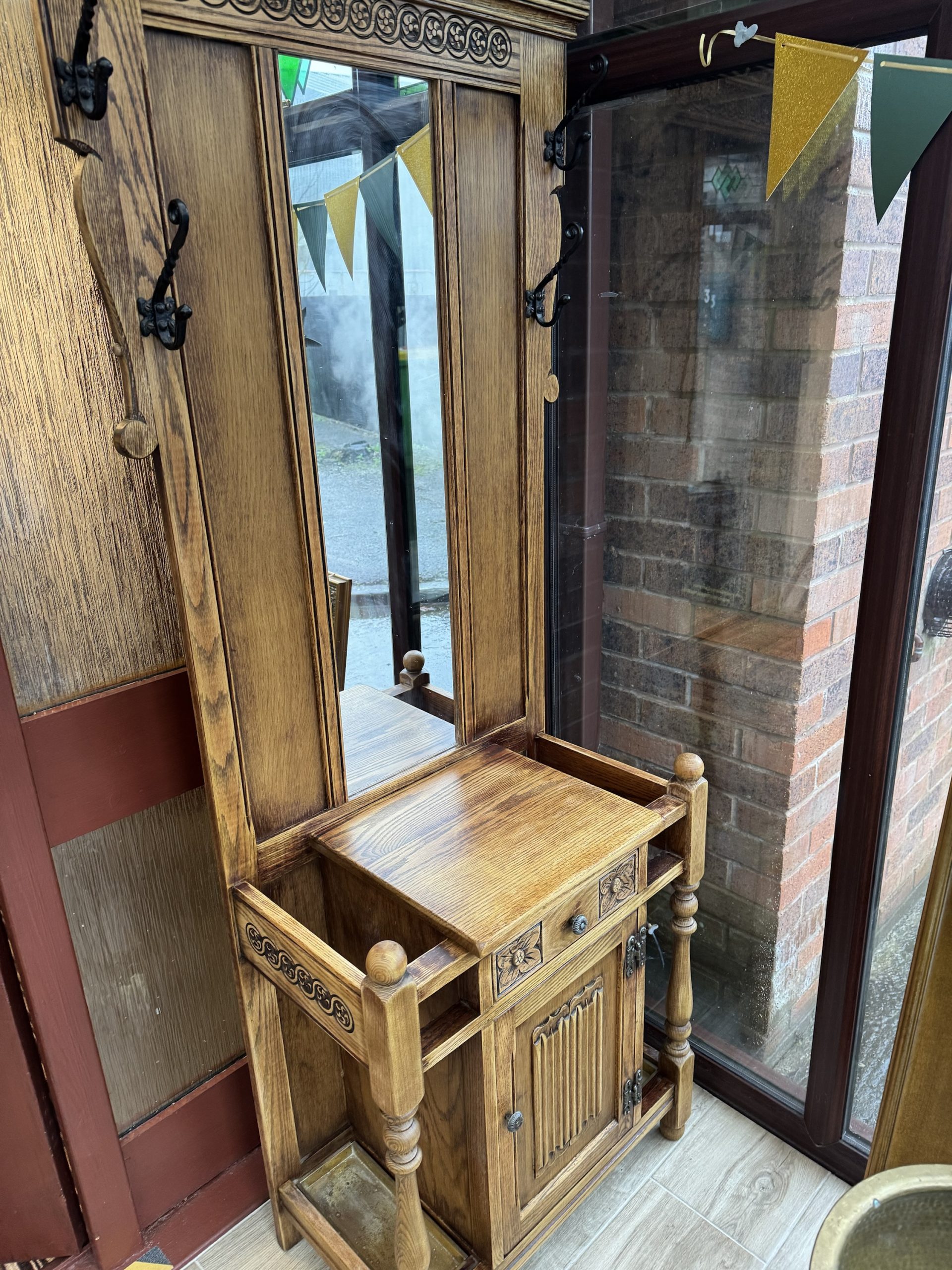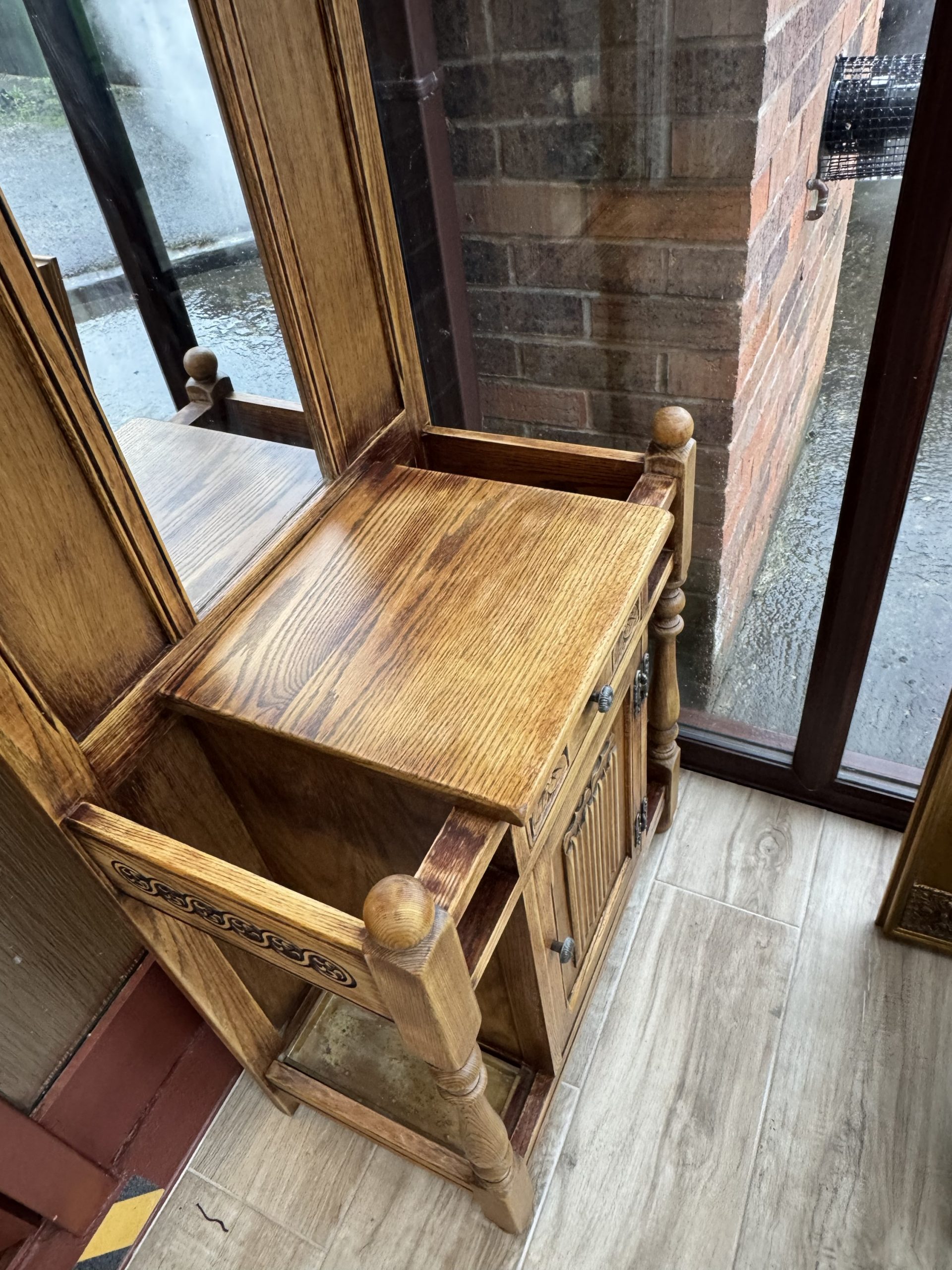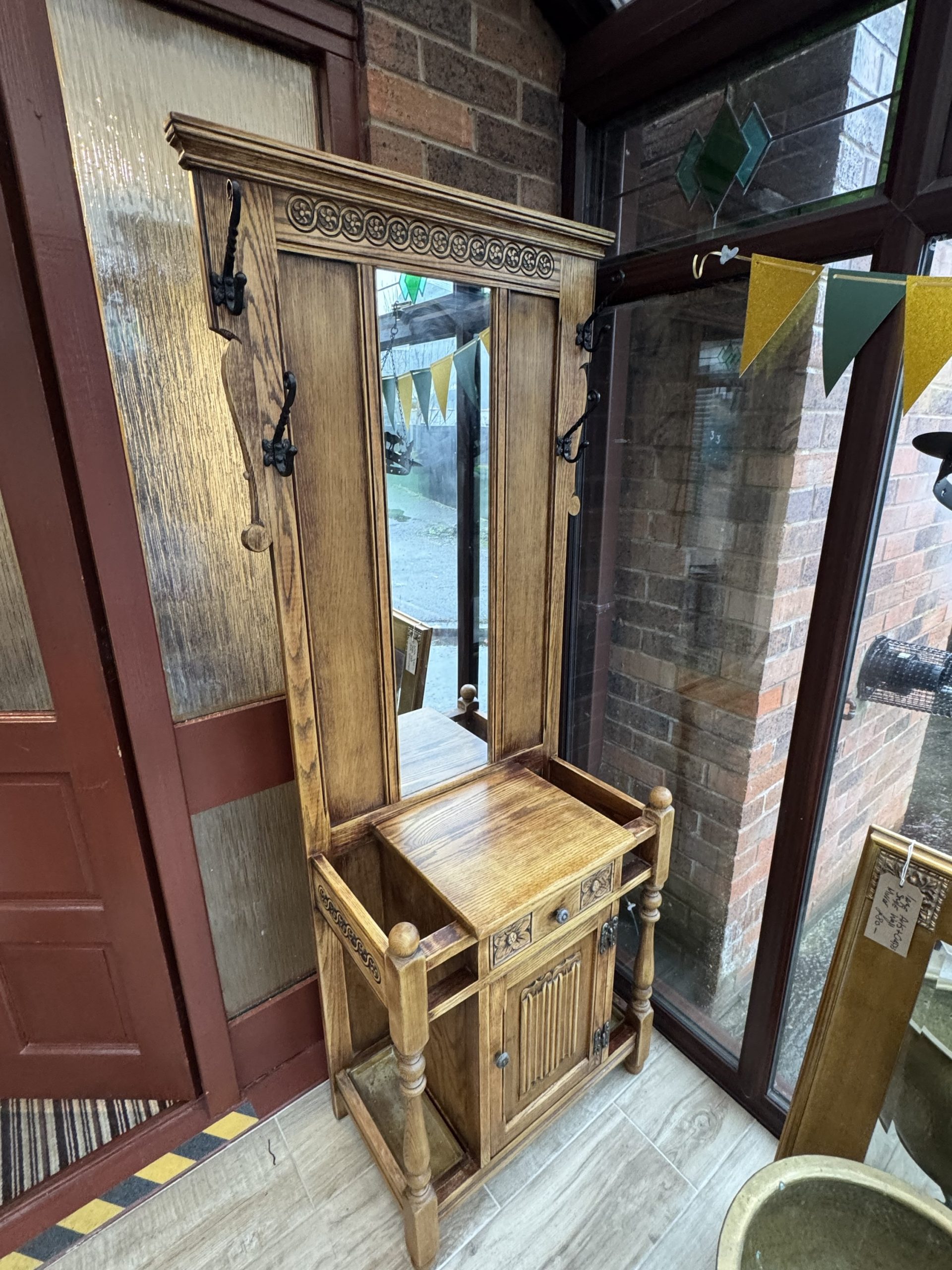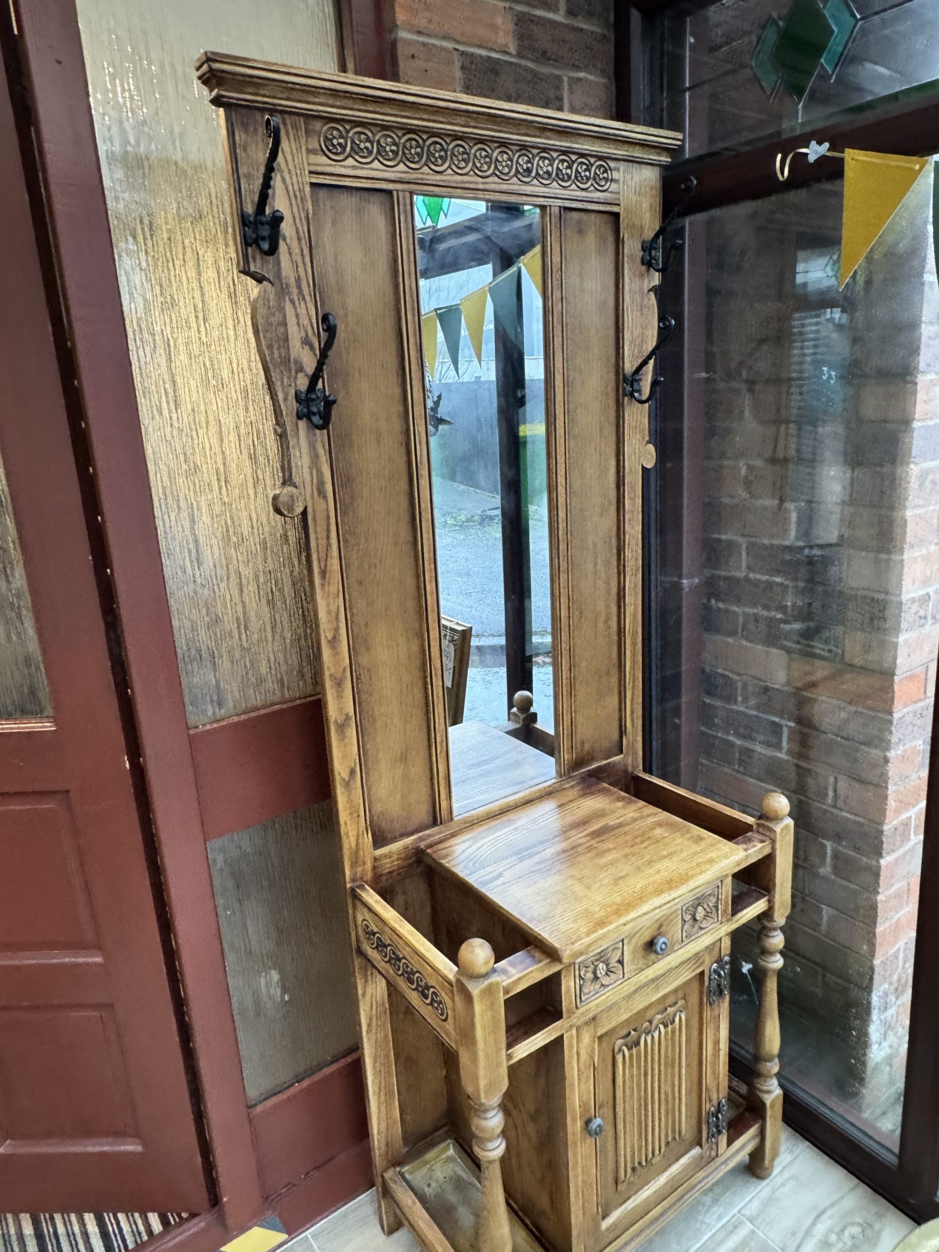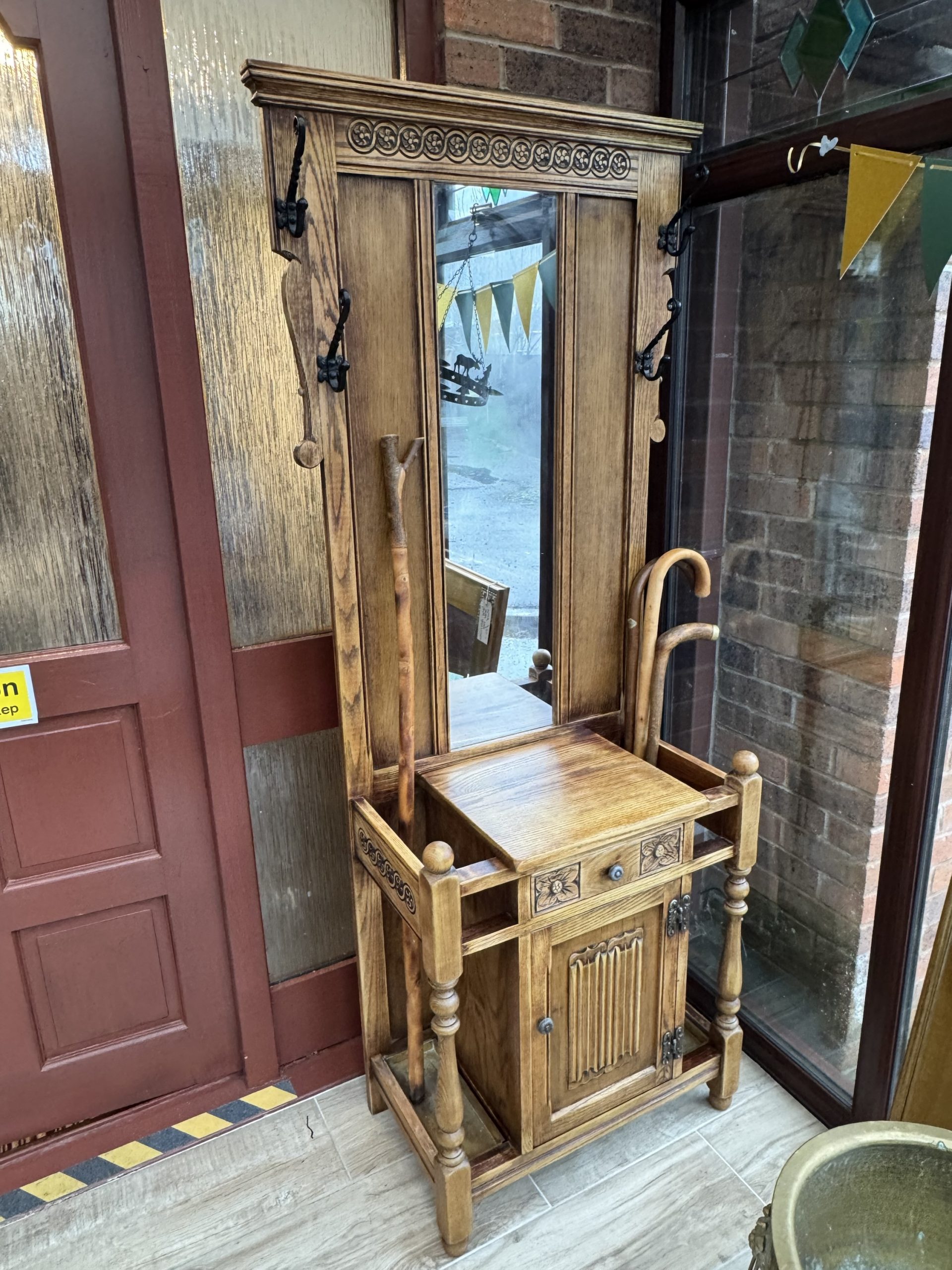 Mid 20th century Old charm by Wood Brothers oak hall stand with mirror draw and cabinet. Beautifully carved in a Tudor revival style