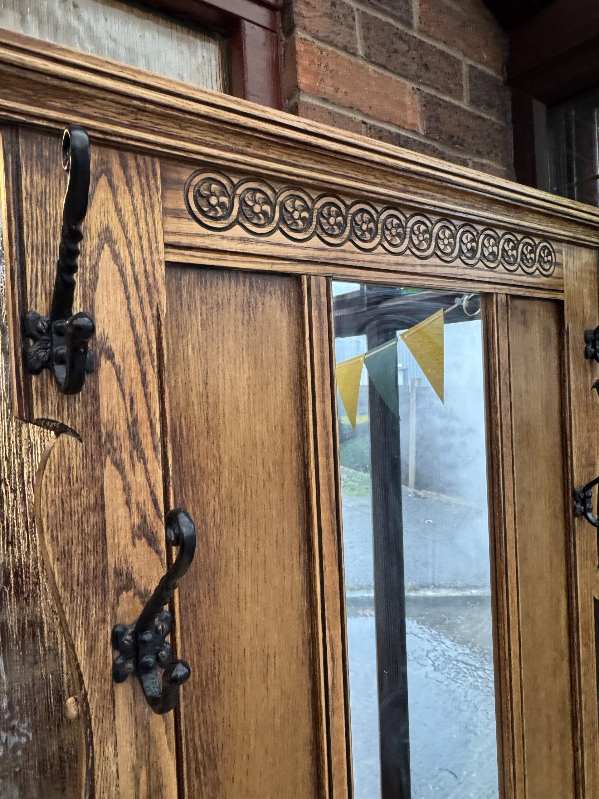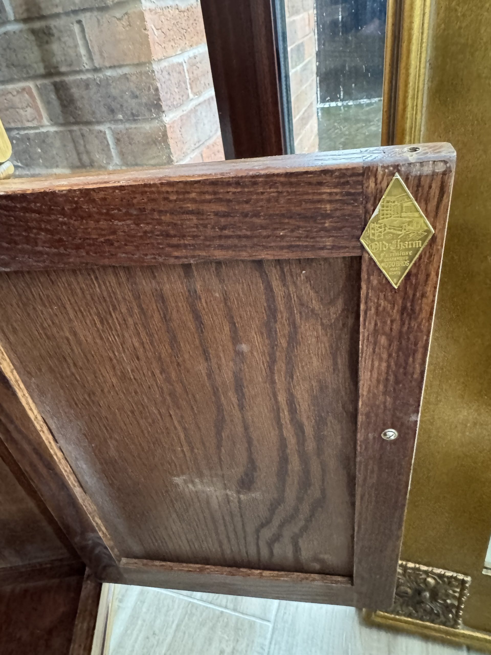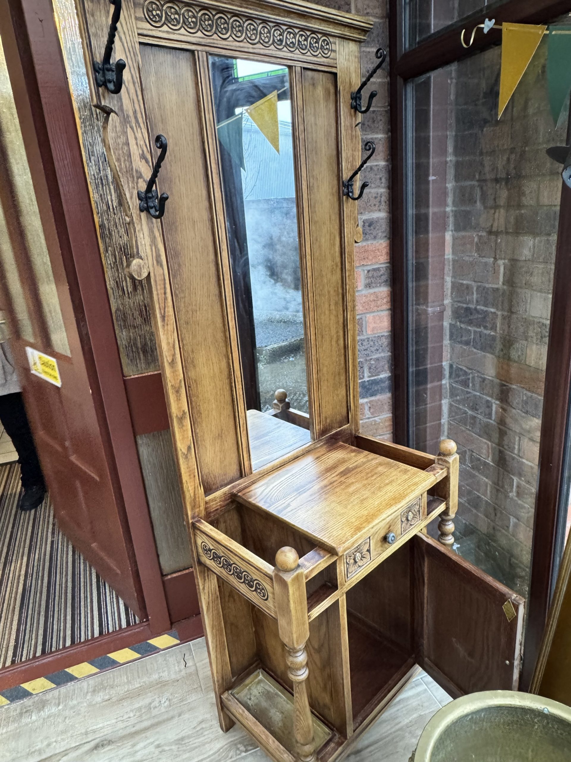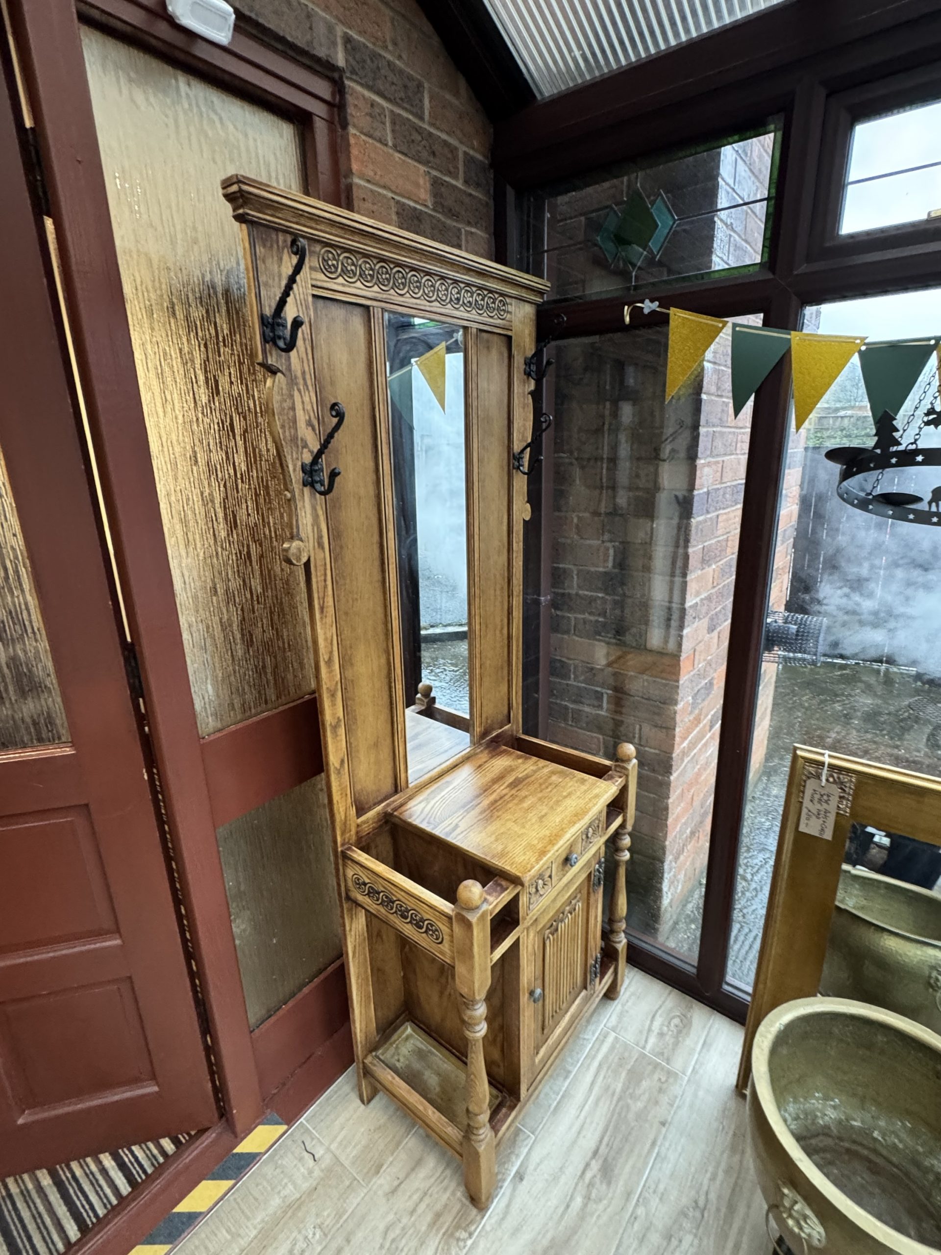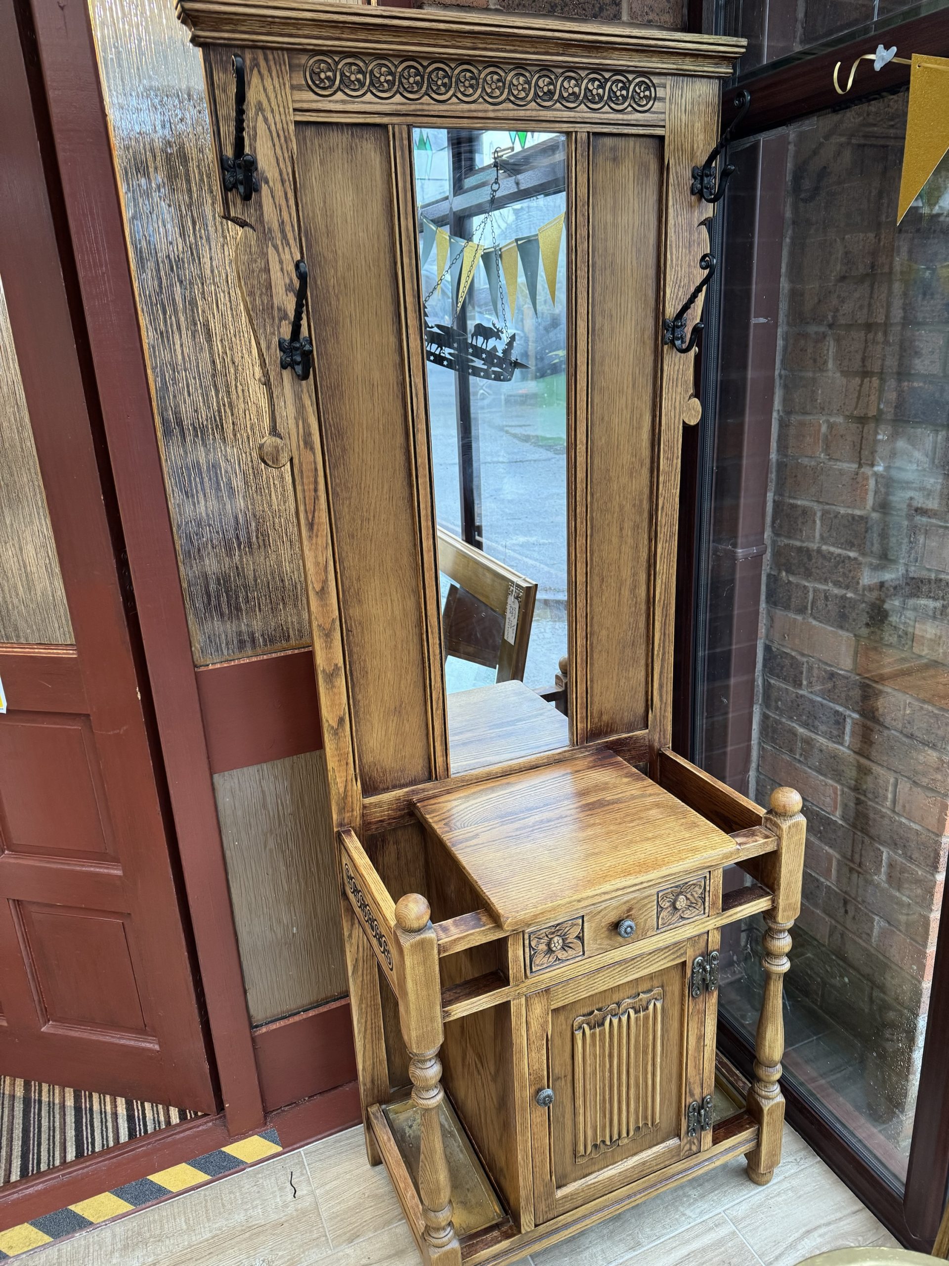 Mid 20th century Old charm by Wood Brothers oak hall stand with mirror draw and cabinet. Beautifully carved in a Tudor revival style