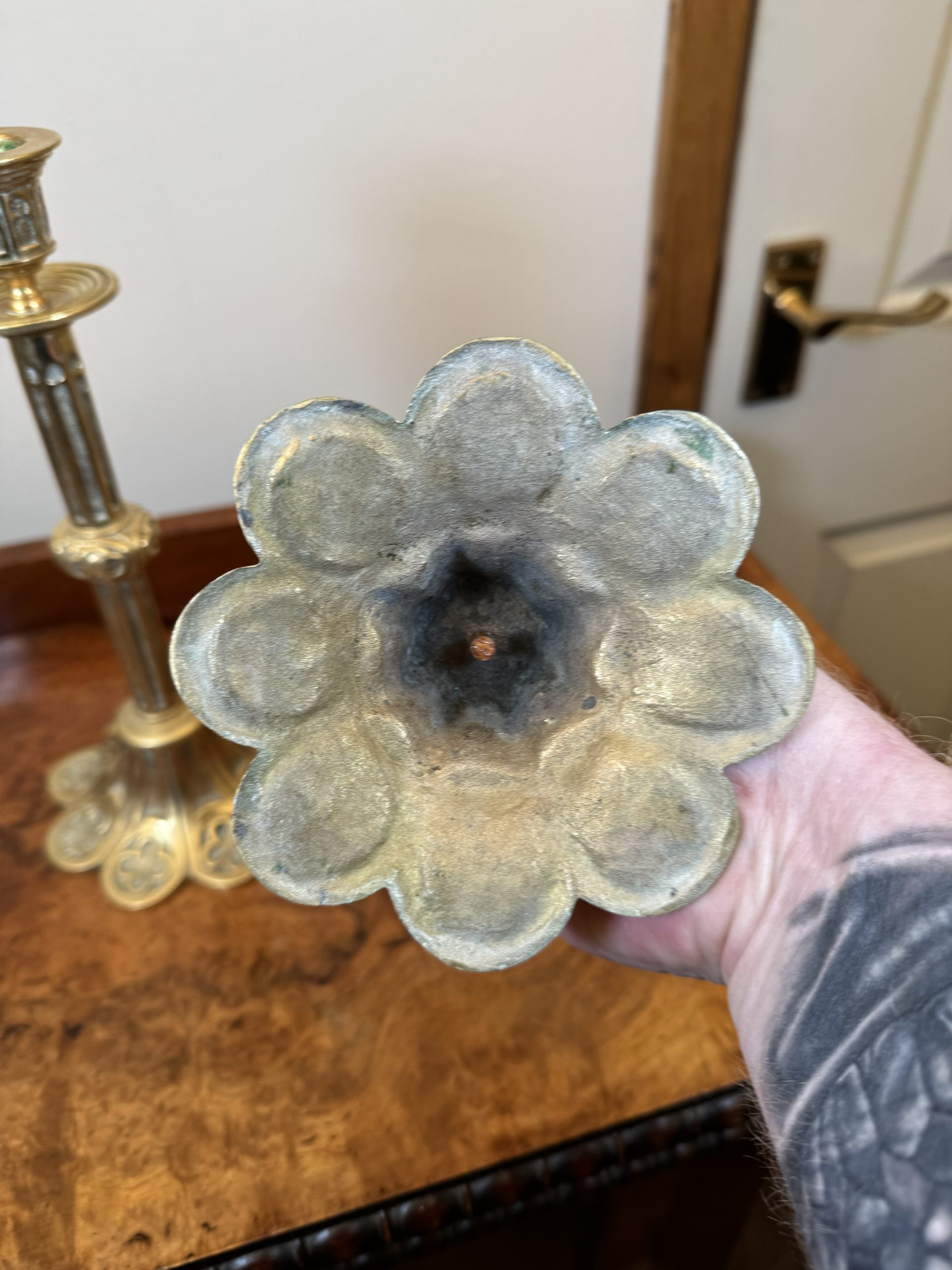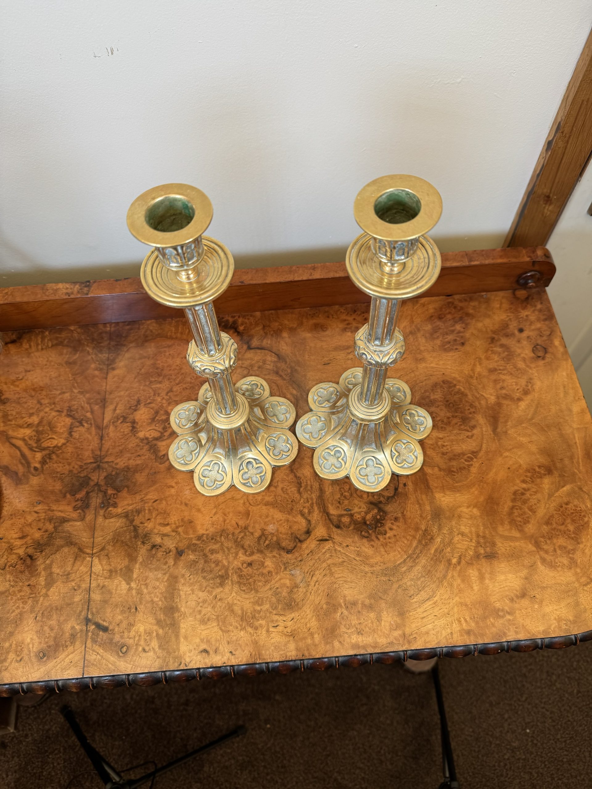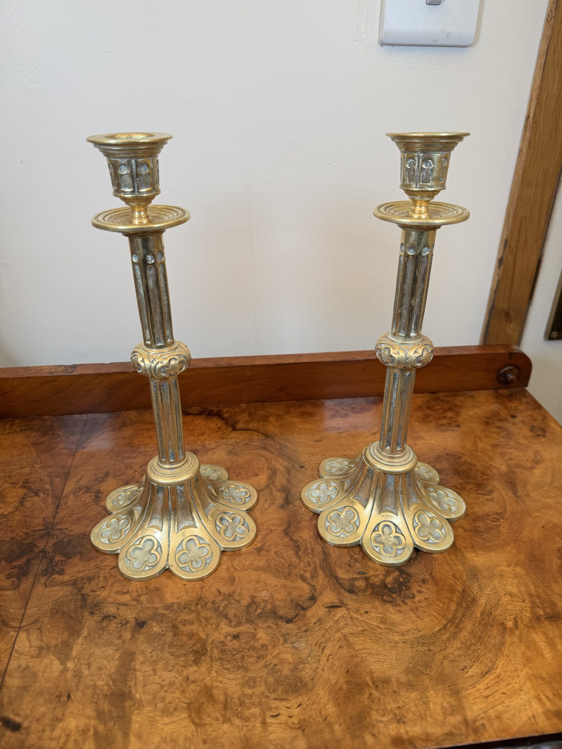 Pair of Edwardian Gothic brass candlesticks. English made circa 1850-1899