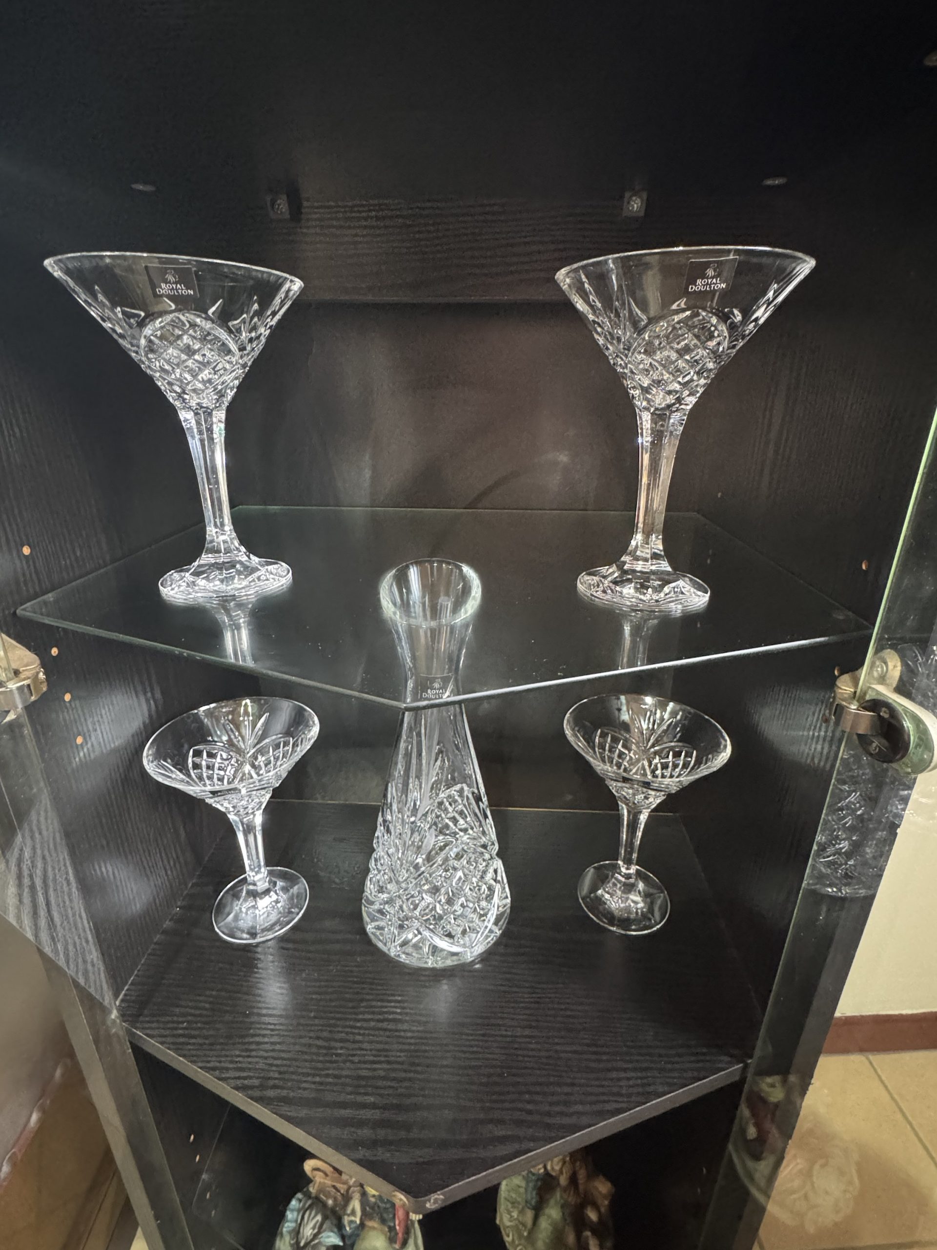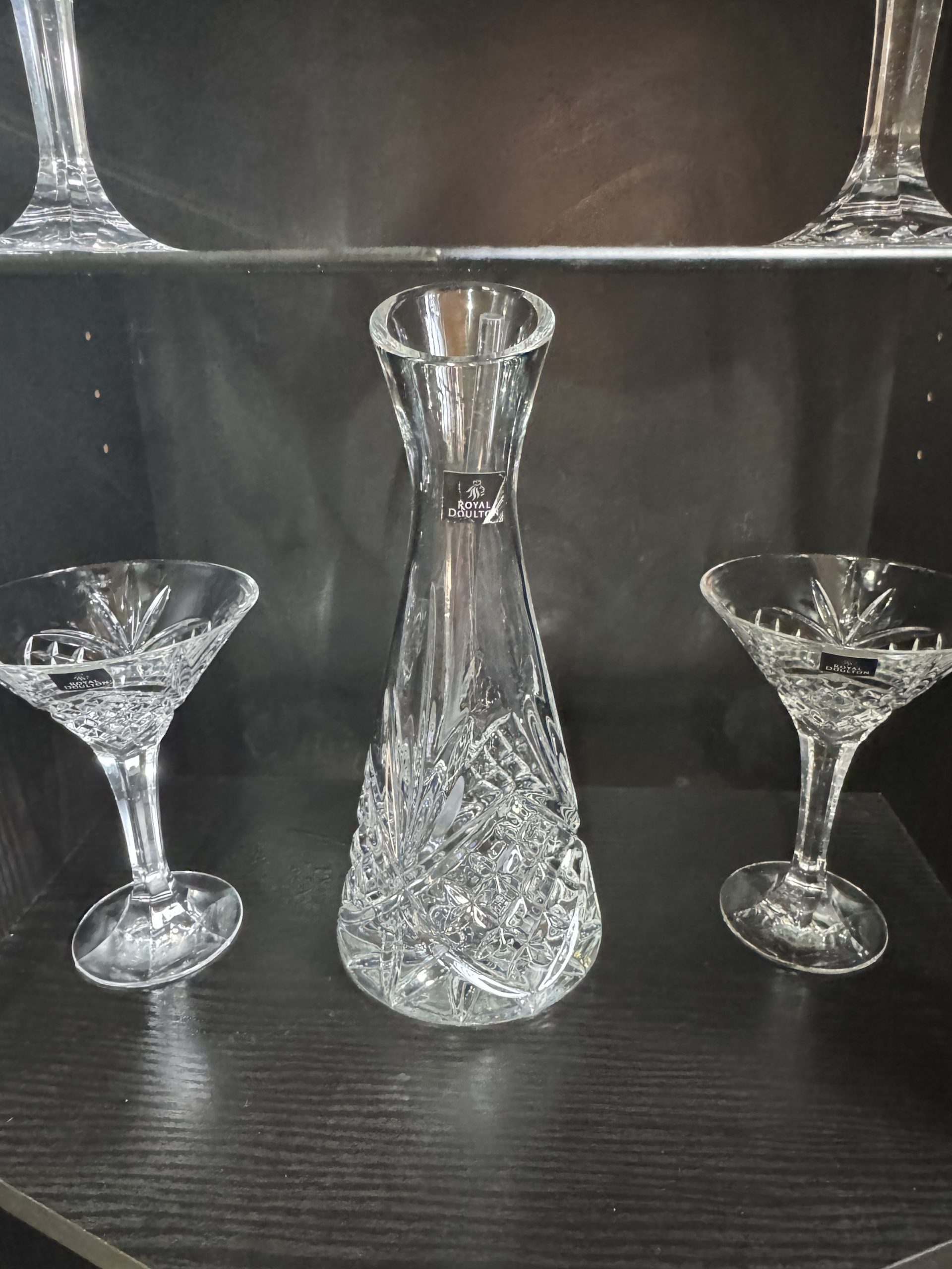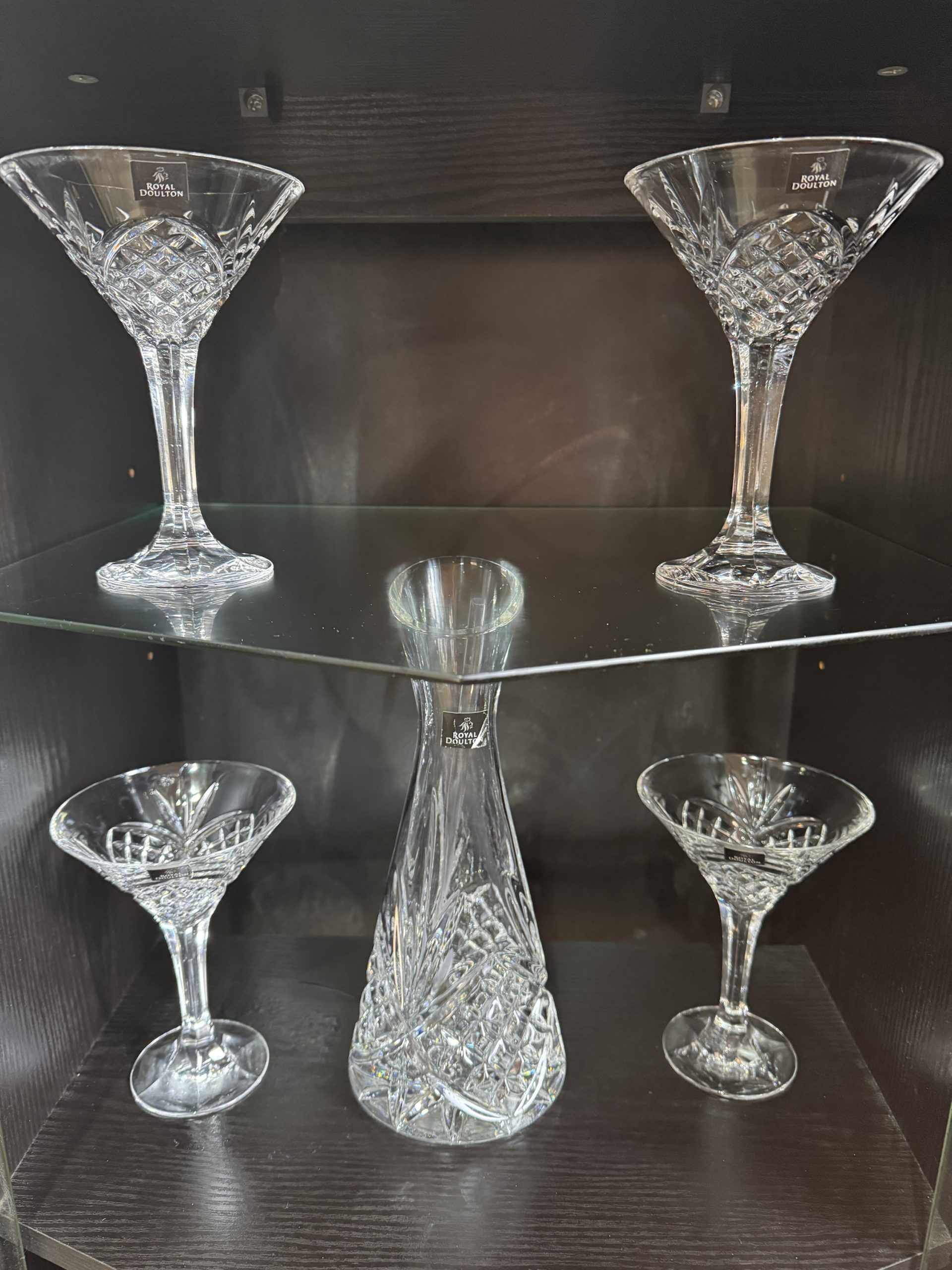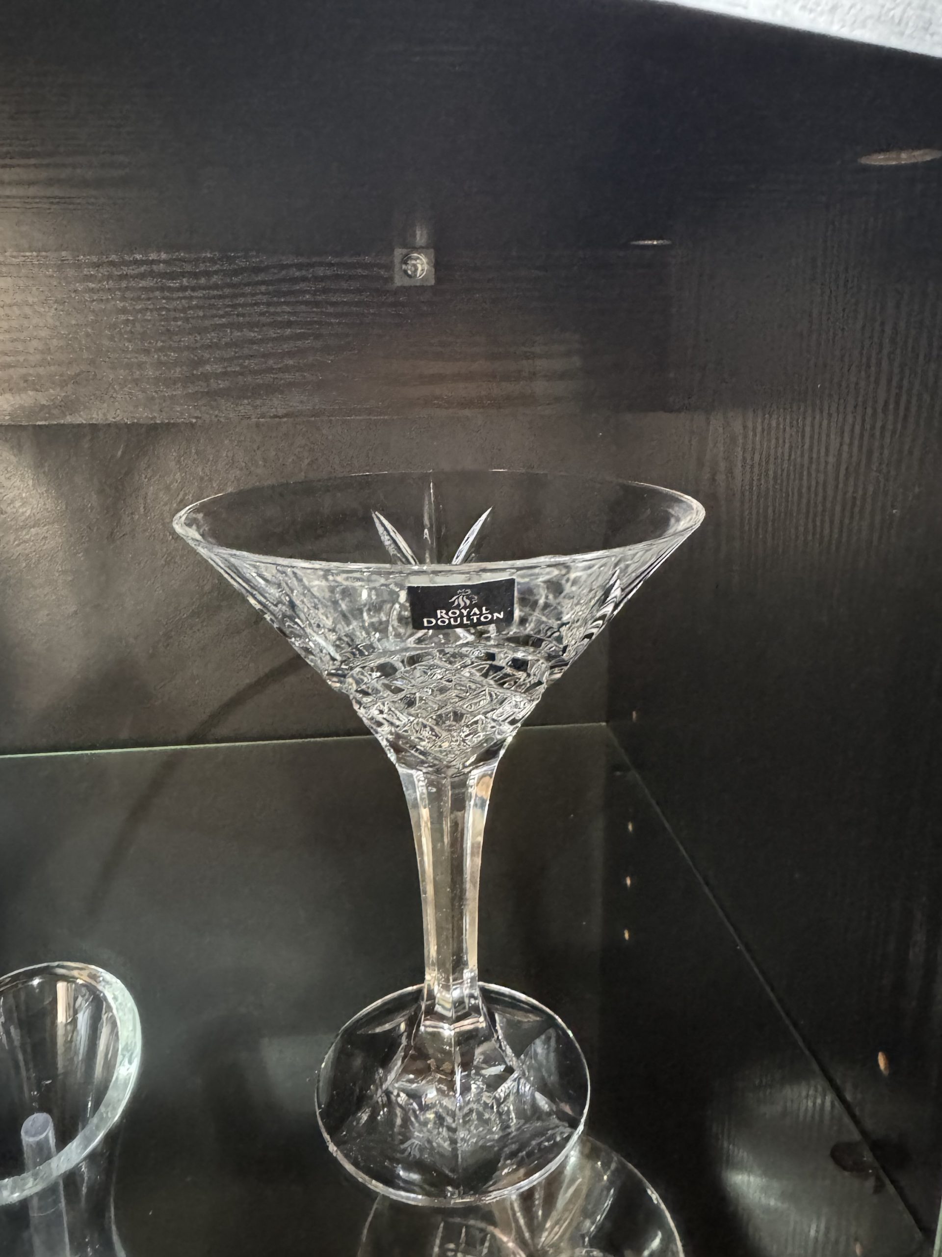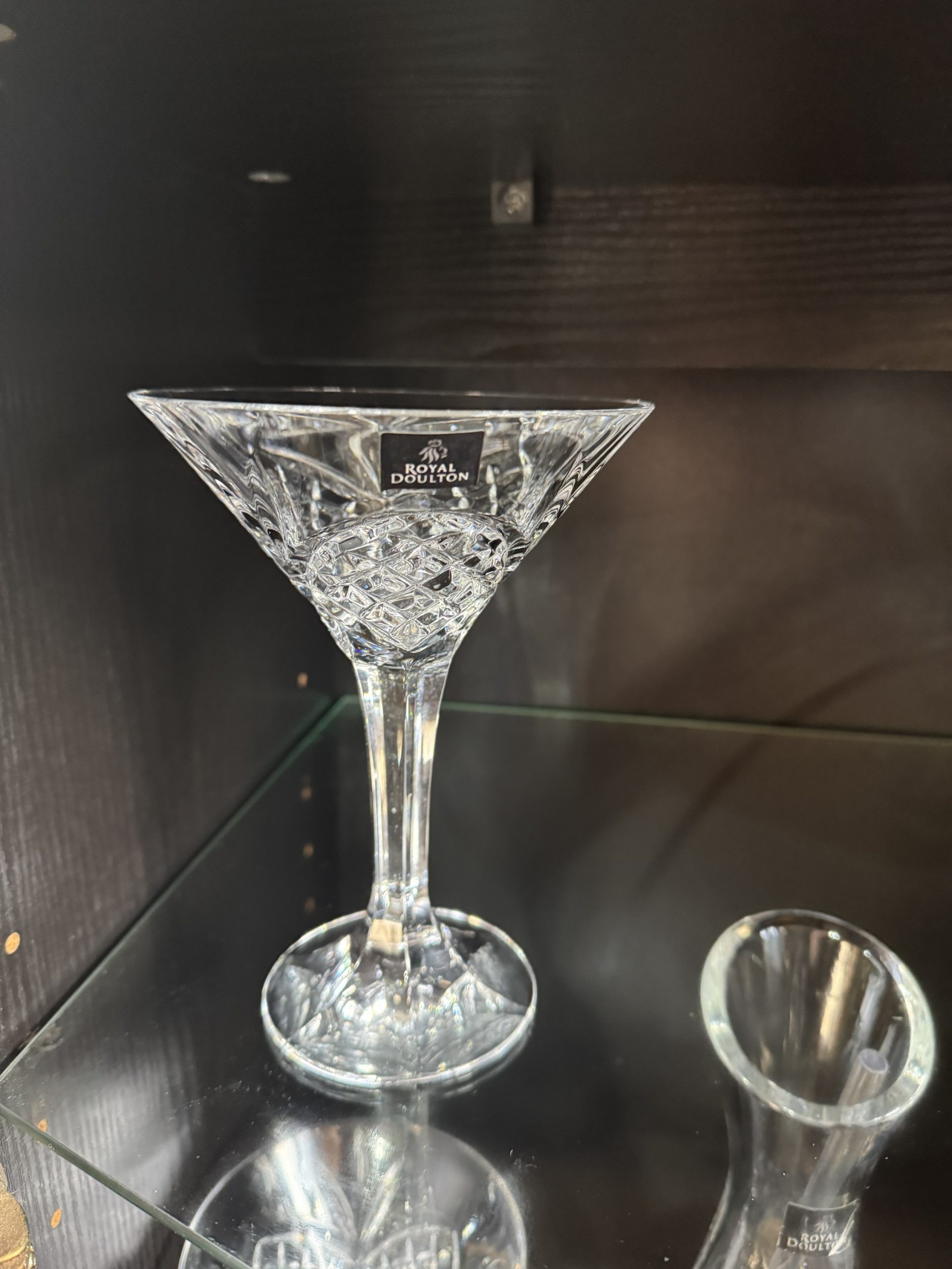 Vintage Royal Doulton Gkassware Martini set with cut diamond and fan pattern. Hand made in England with intricate detail and high quality craftsmanship.