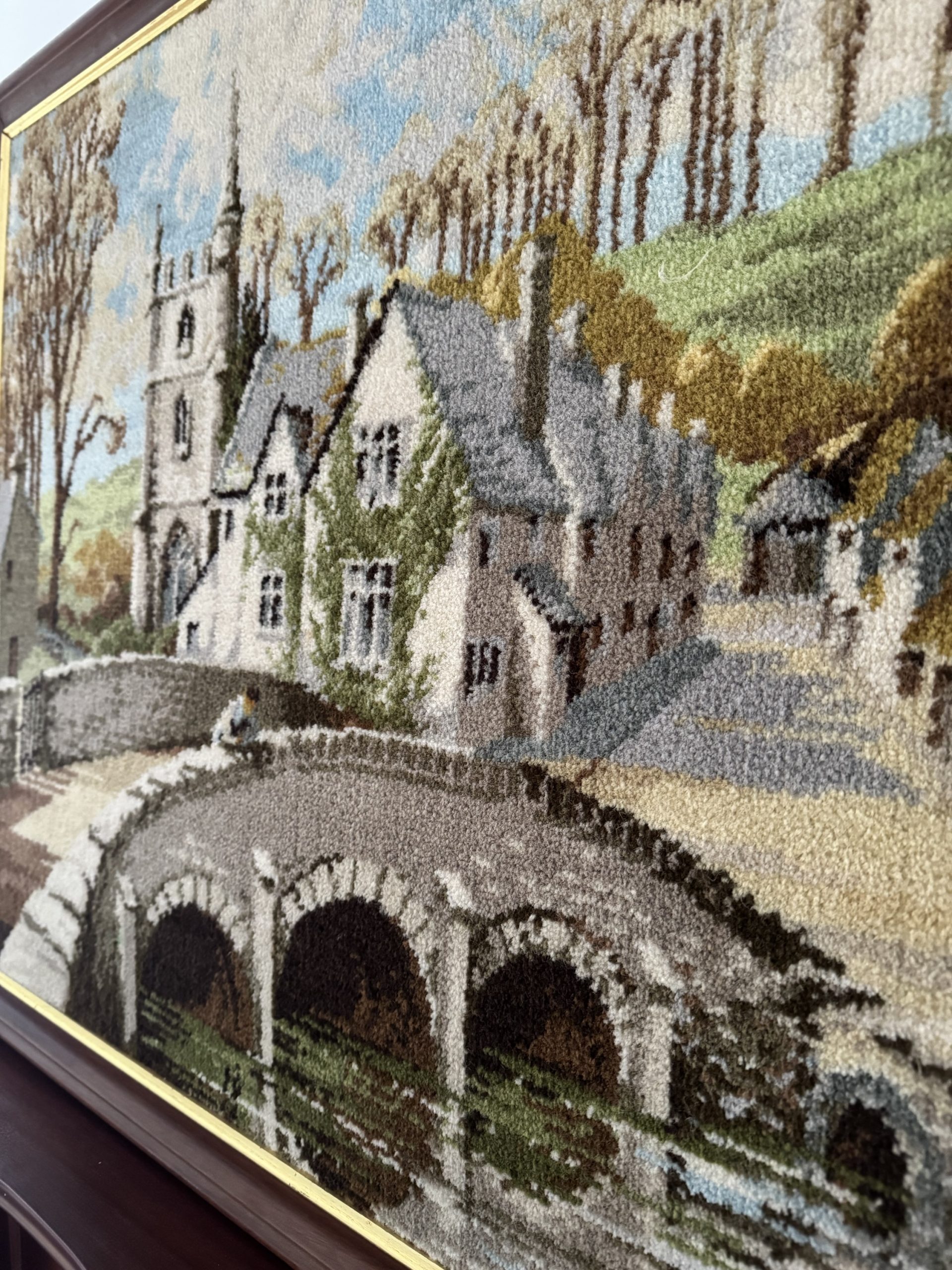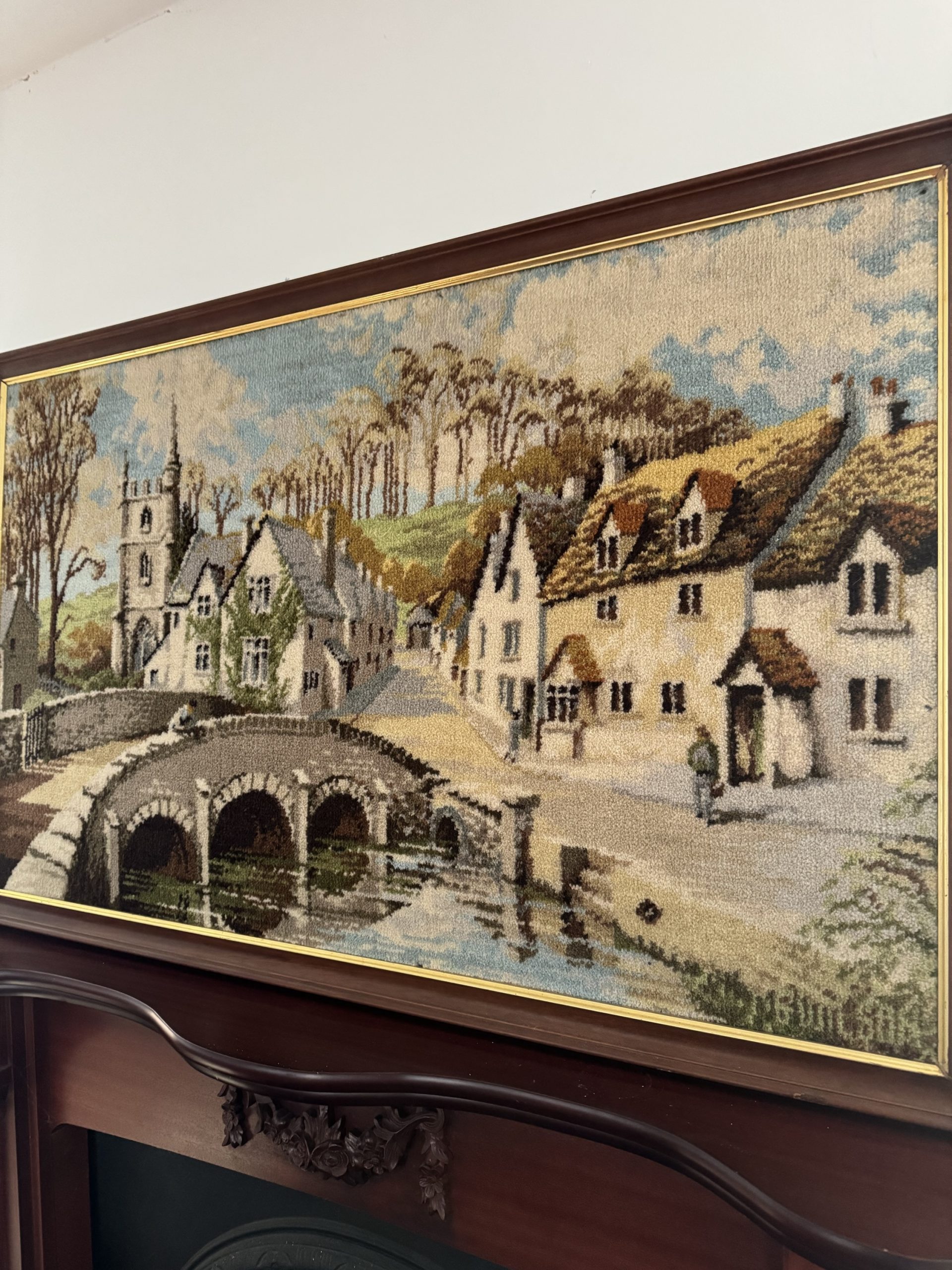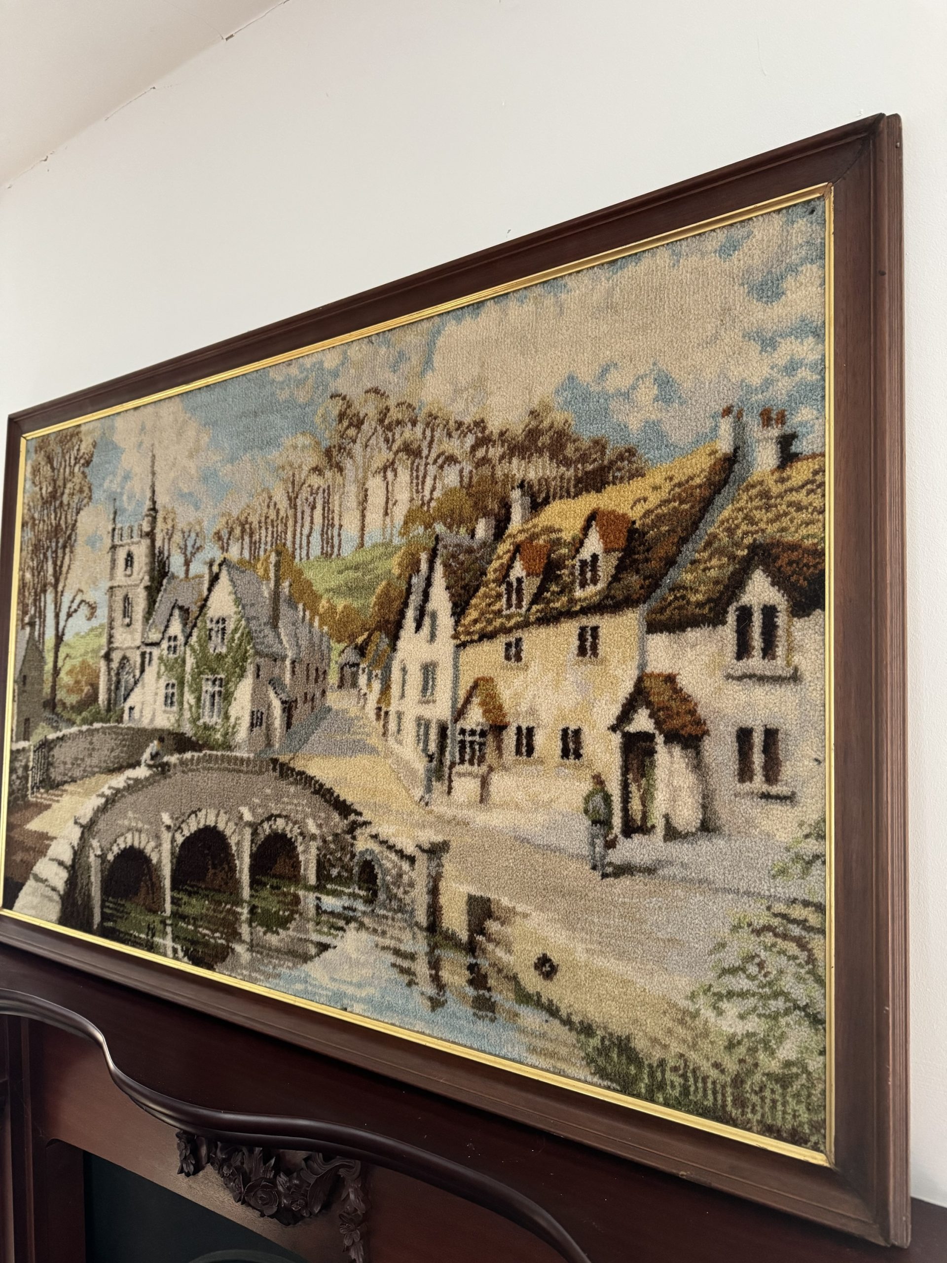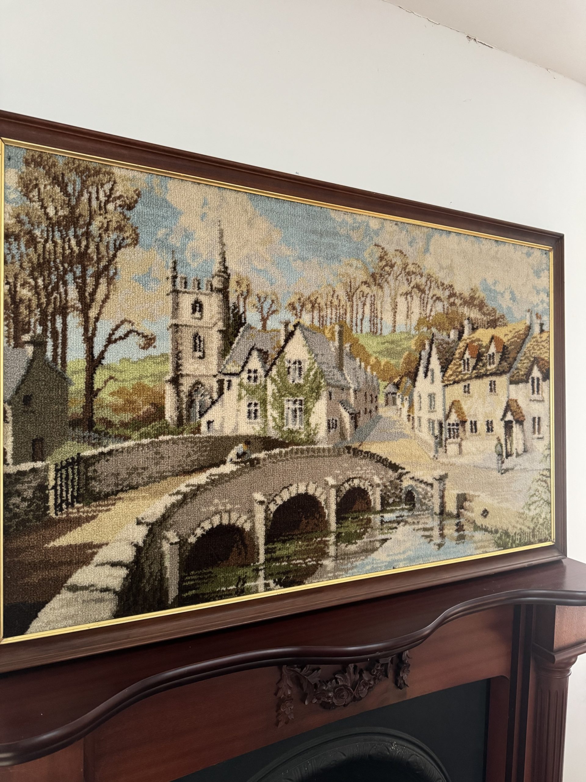 Mid 20th century needle point art work that has been framed. Depicting a British countryside scene with stone bridge and church.