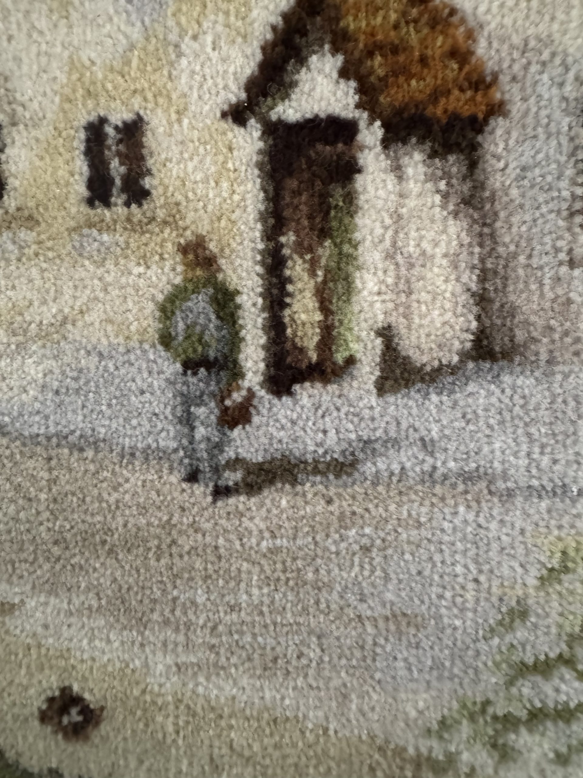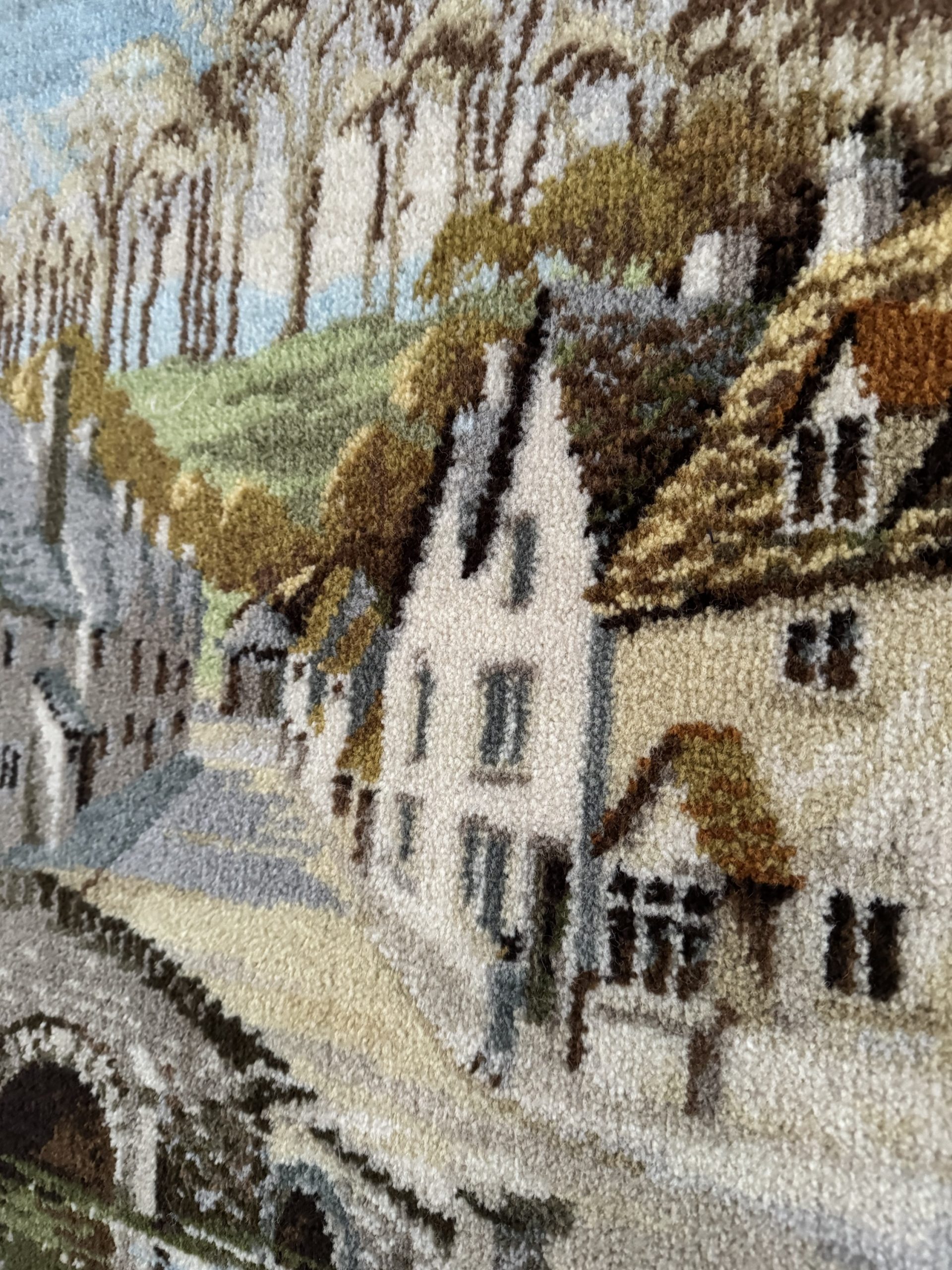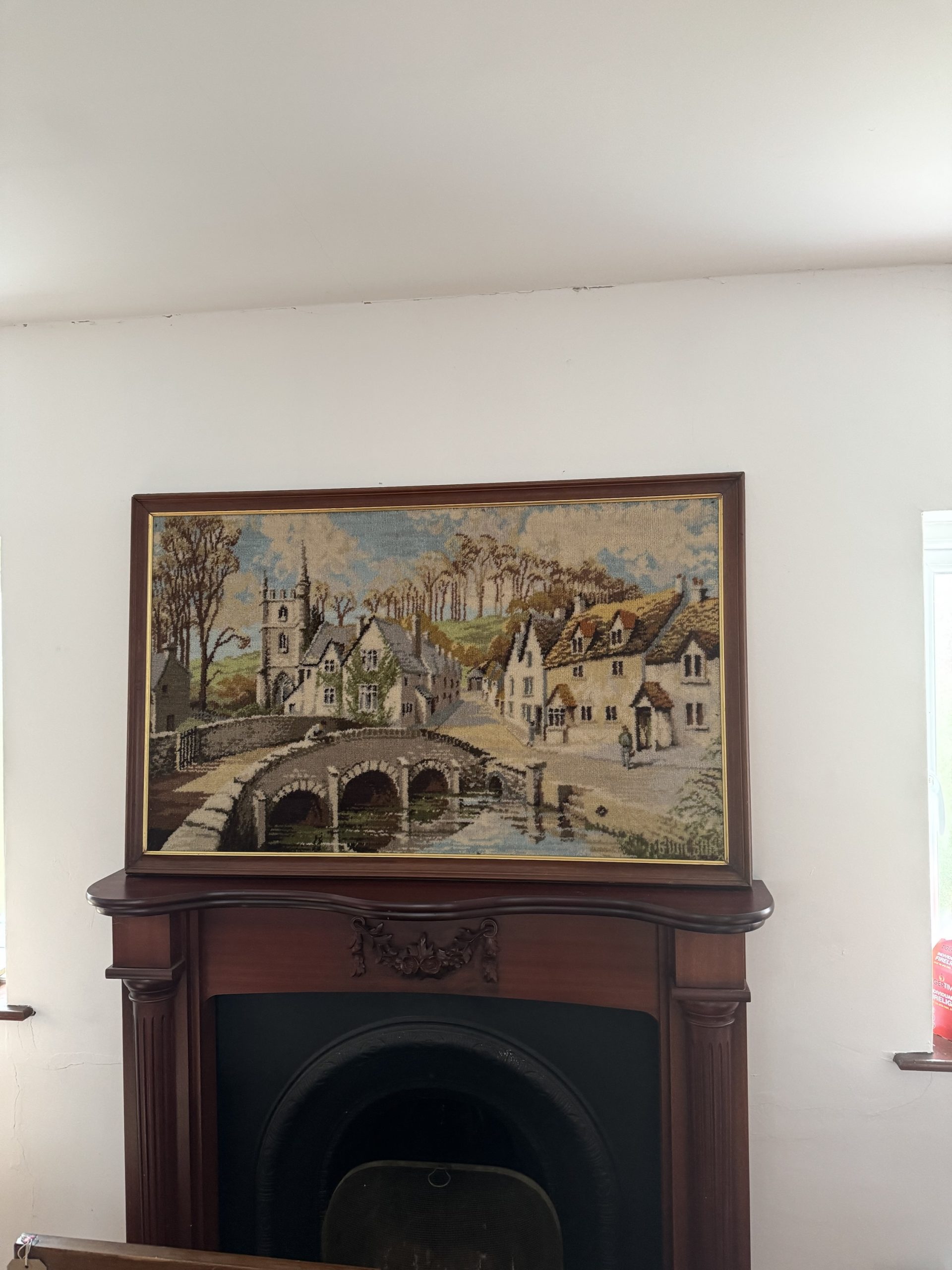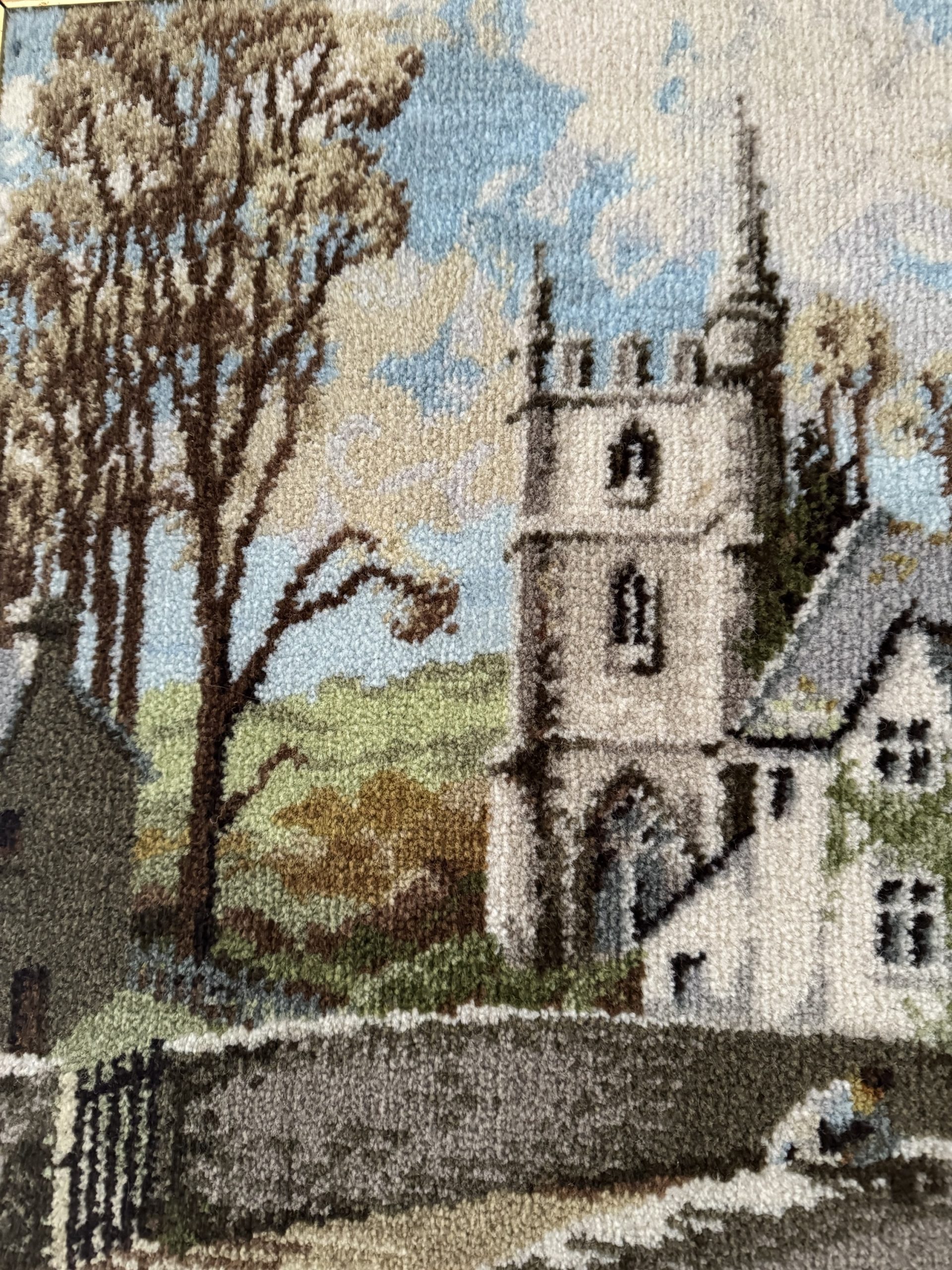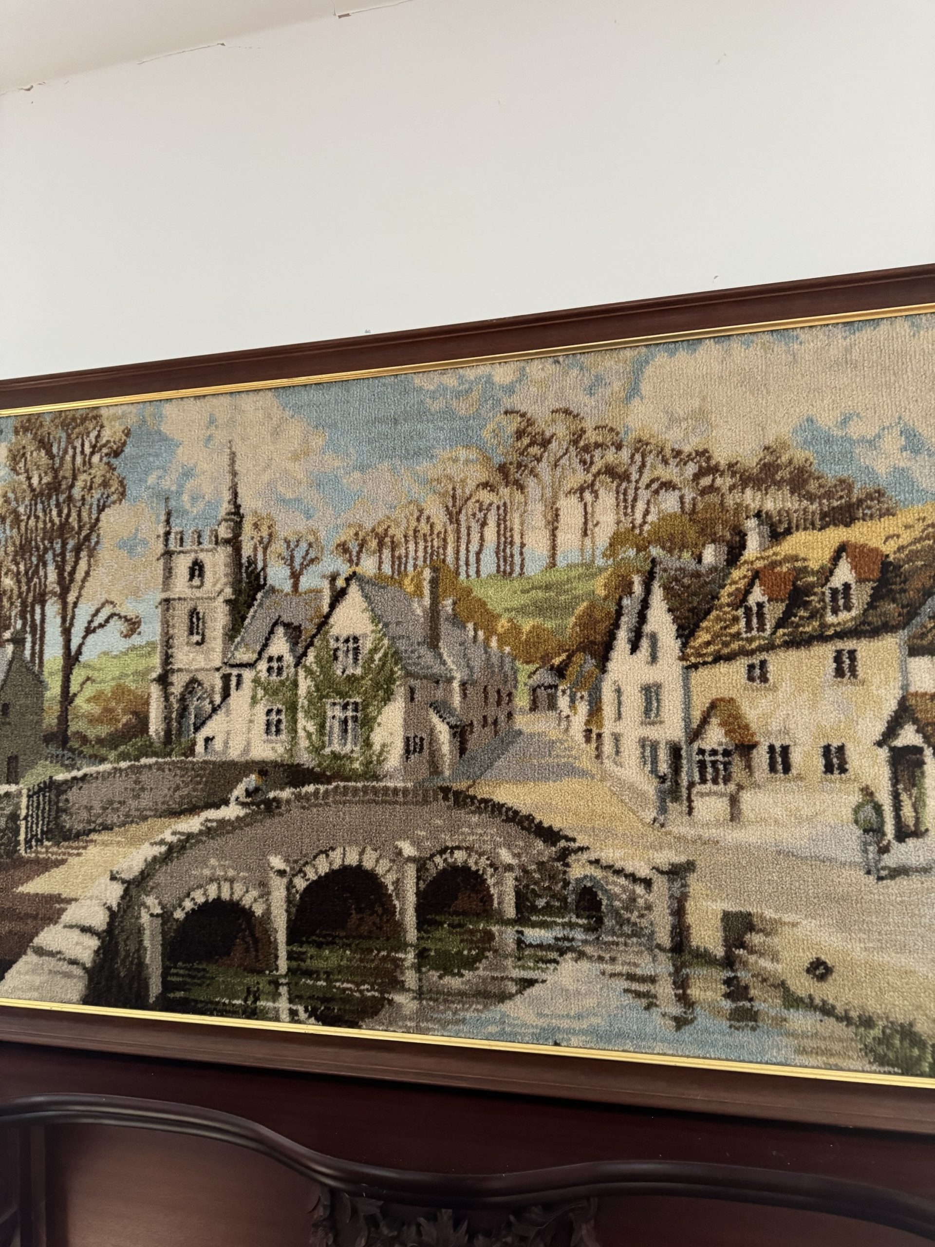 Mid 20th century needle point art work that has been framed. Depicting a British countryside scene with stone bridge and church.