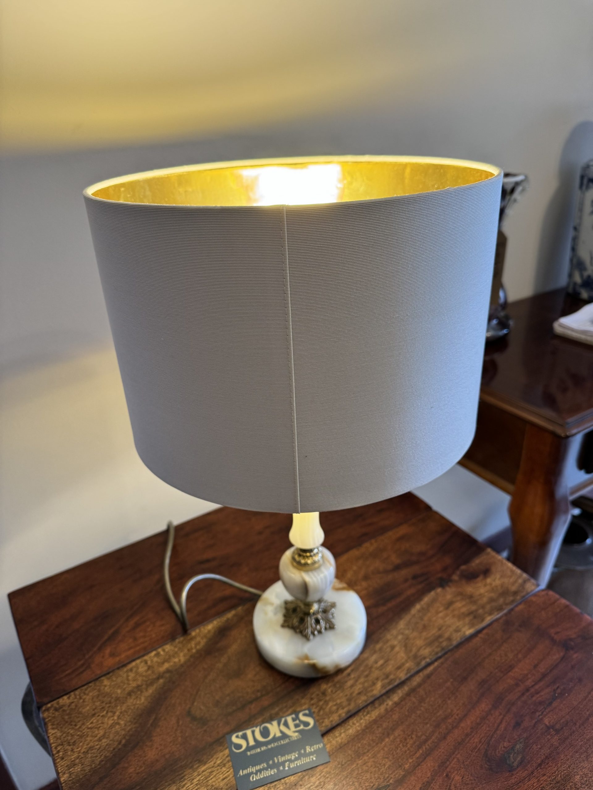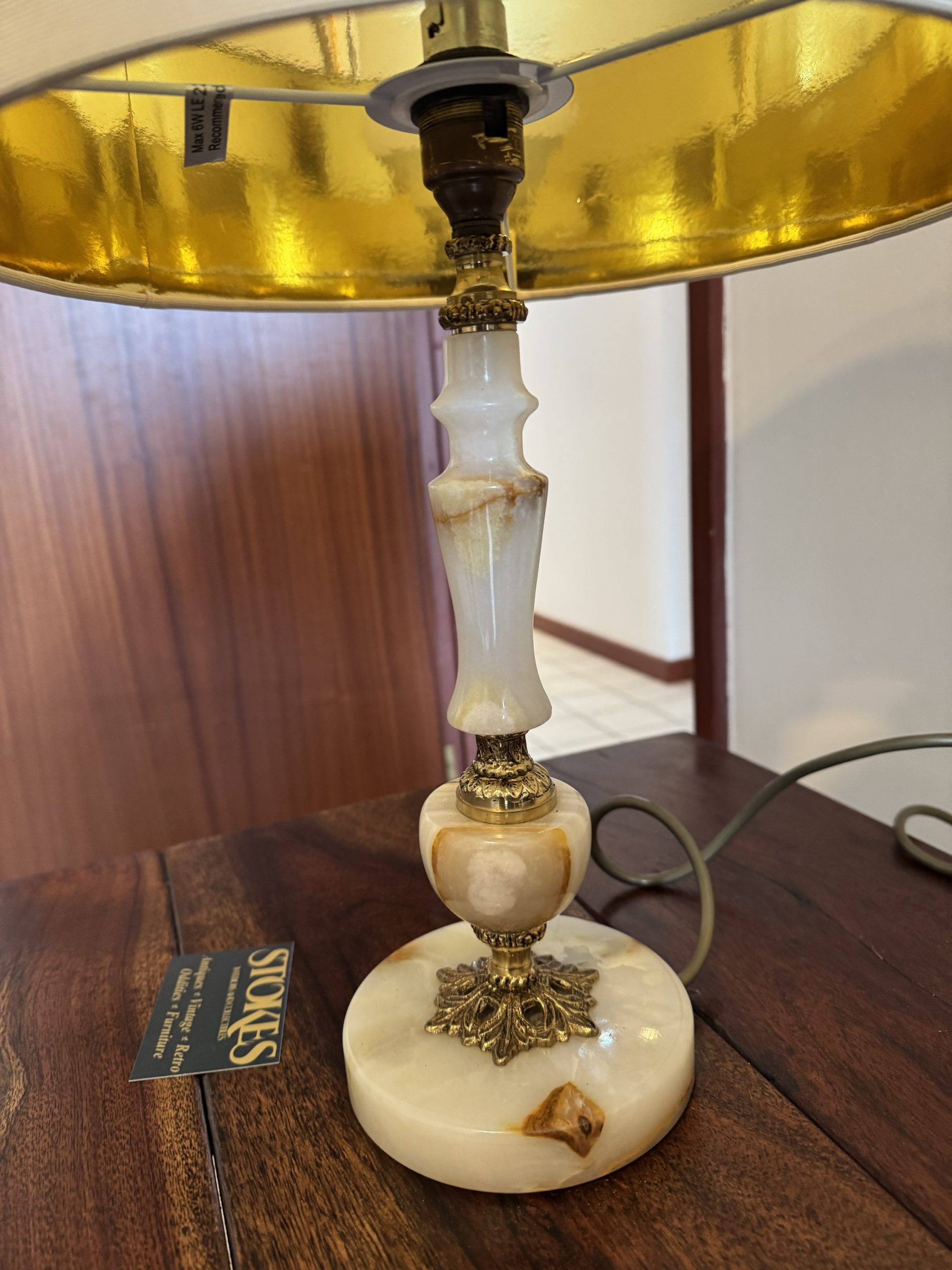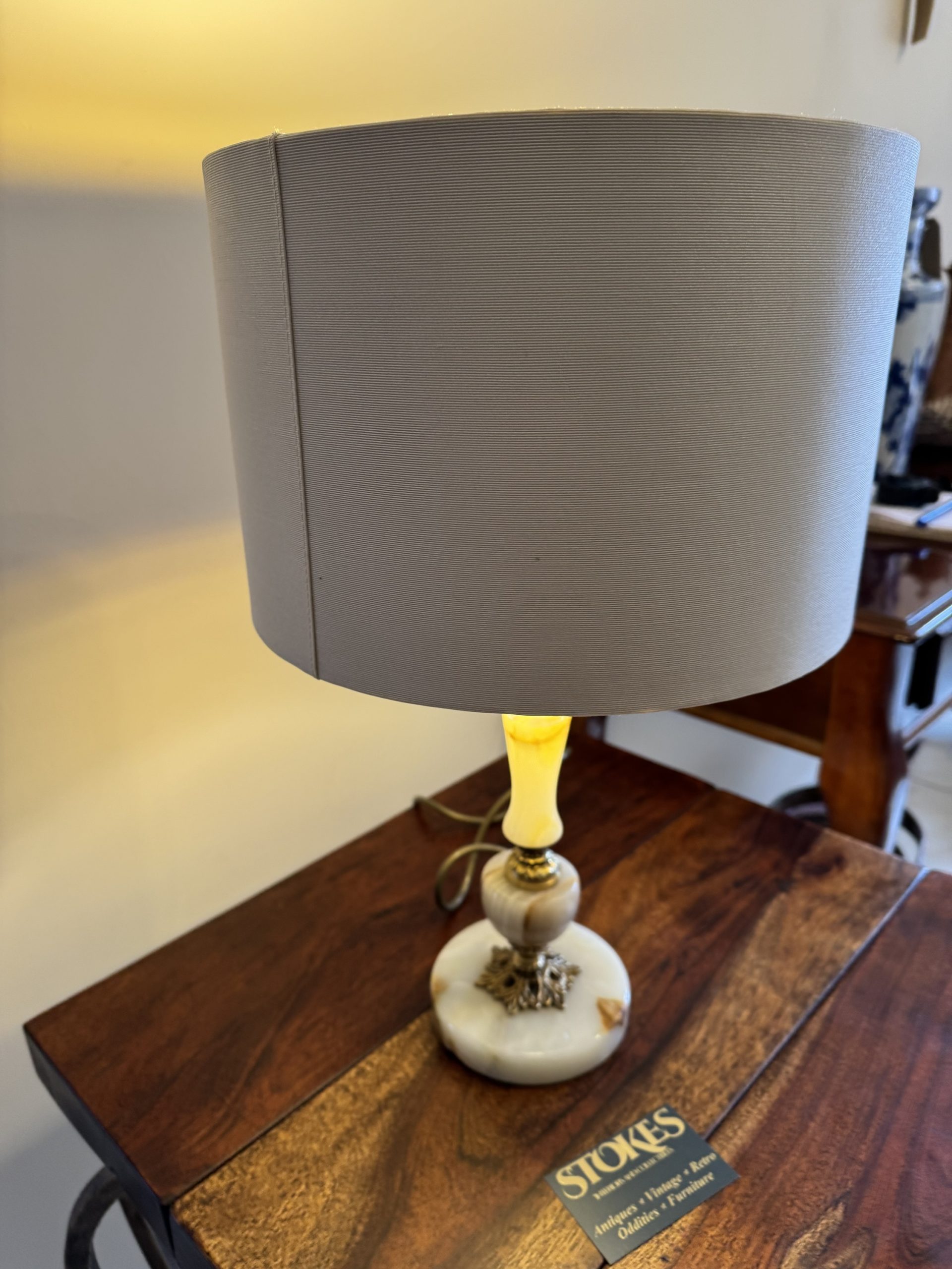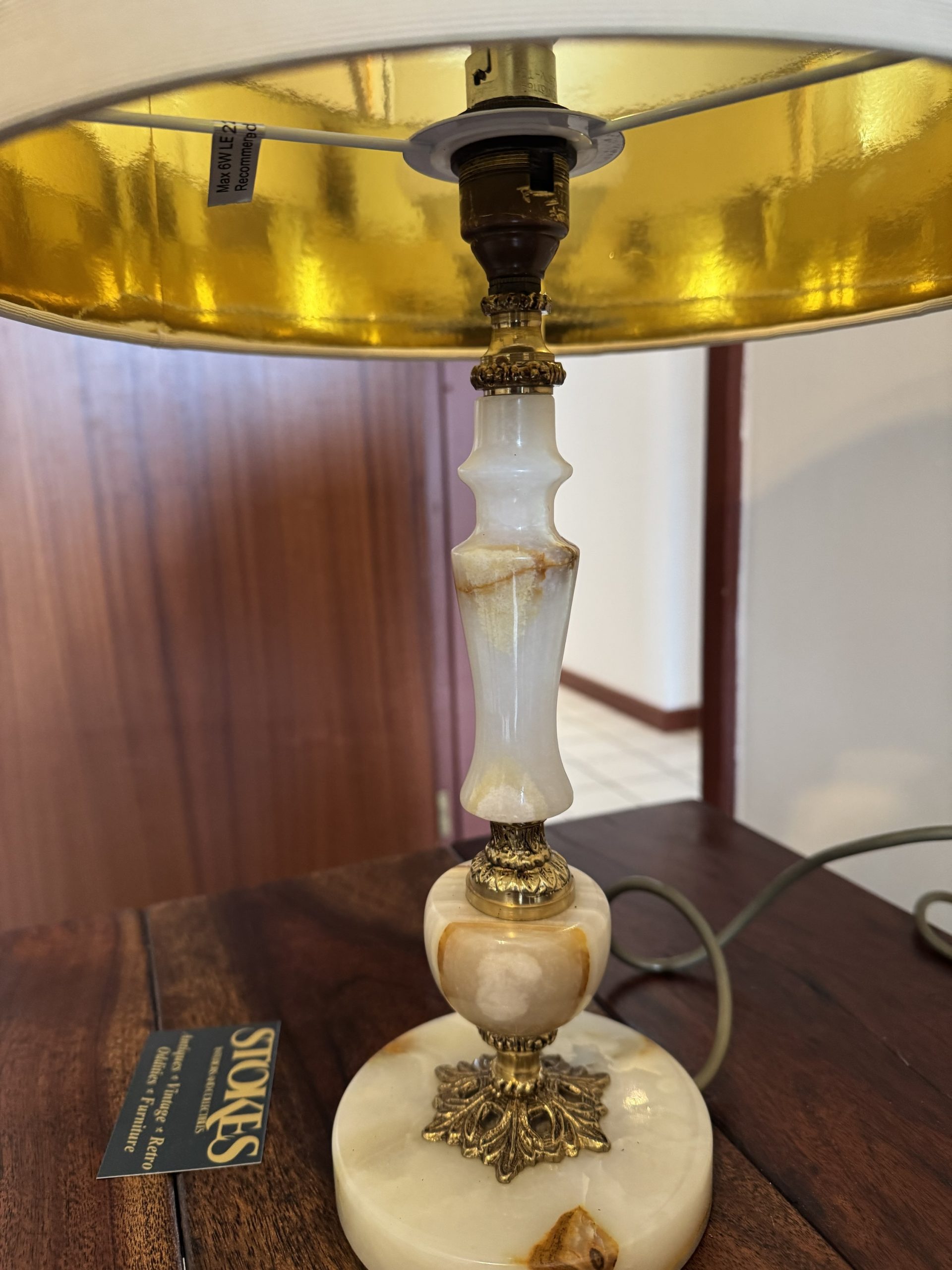 1950’s onyx and brass lamp stacked turned sections of onyx with ornate brass fittings with cream gold lined lamp shade.