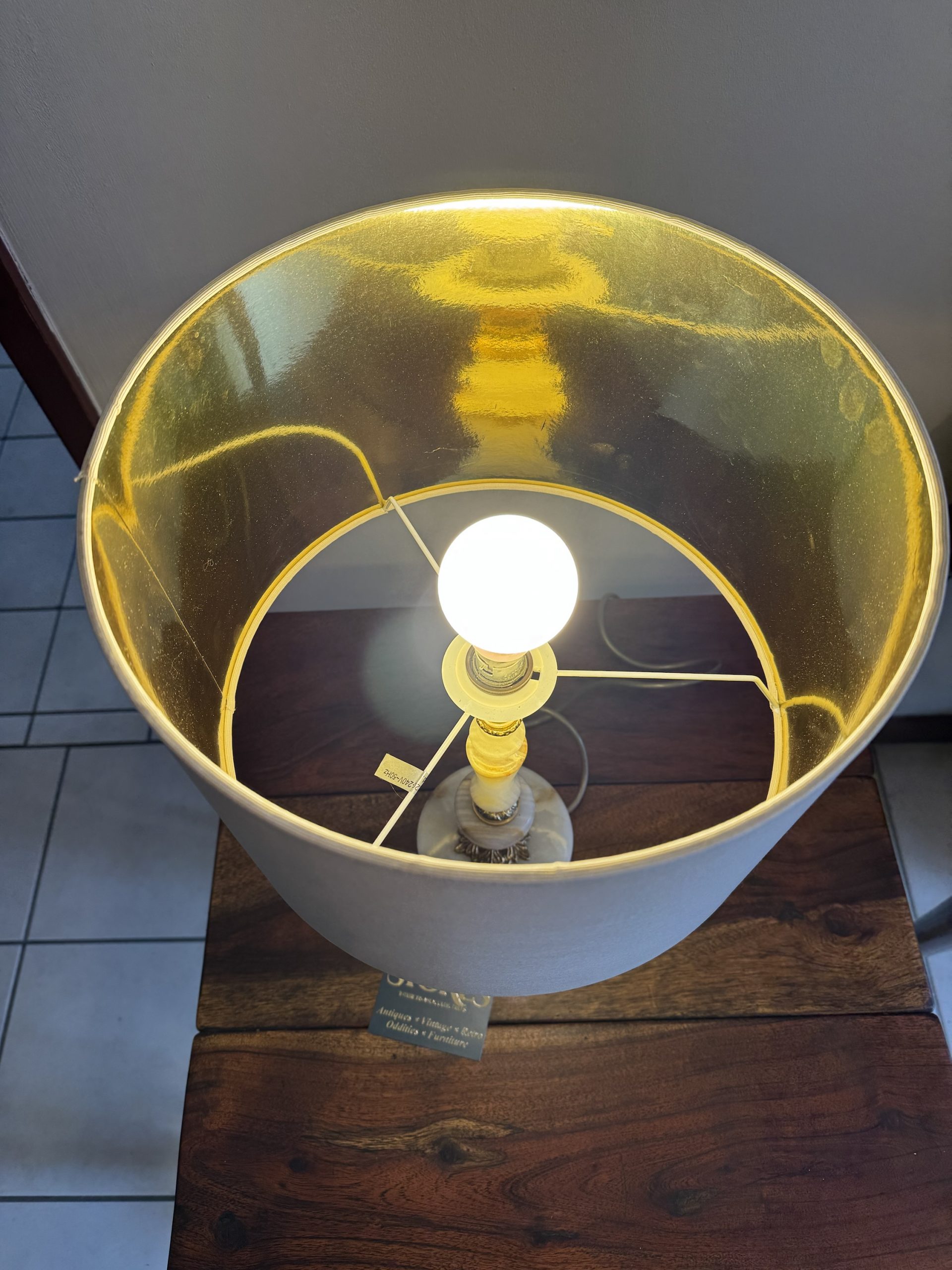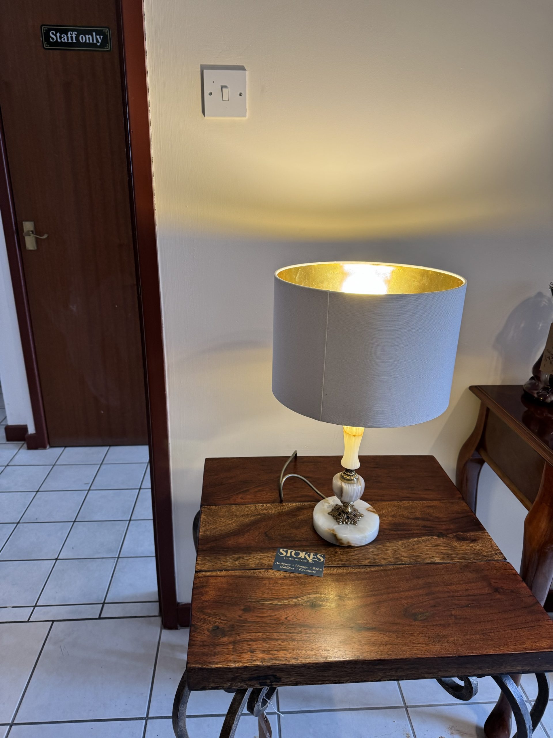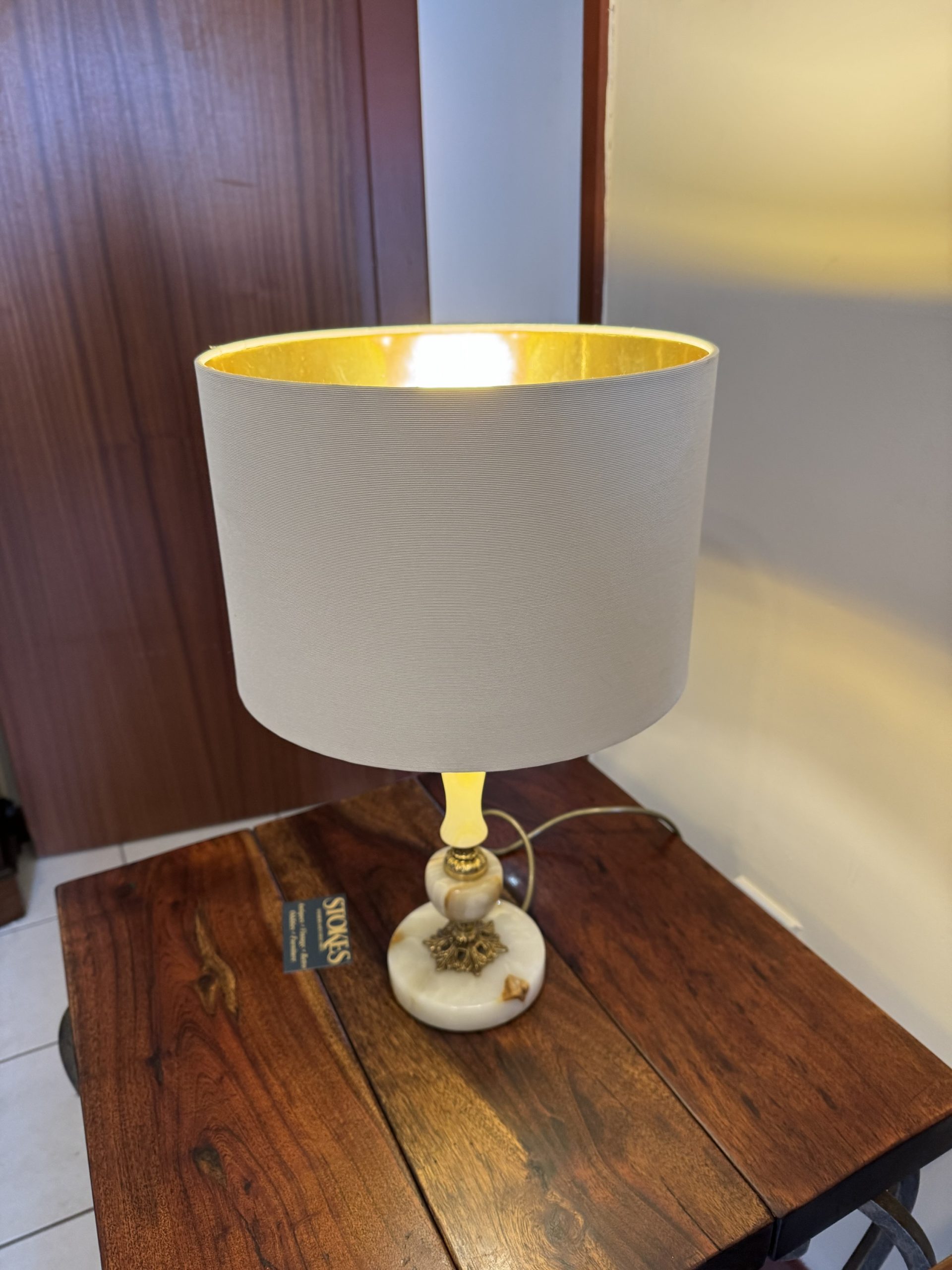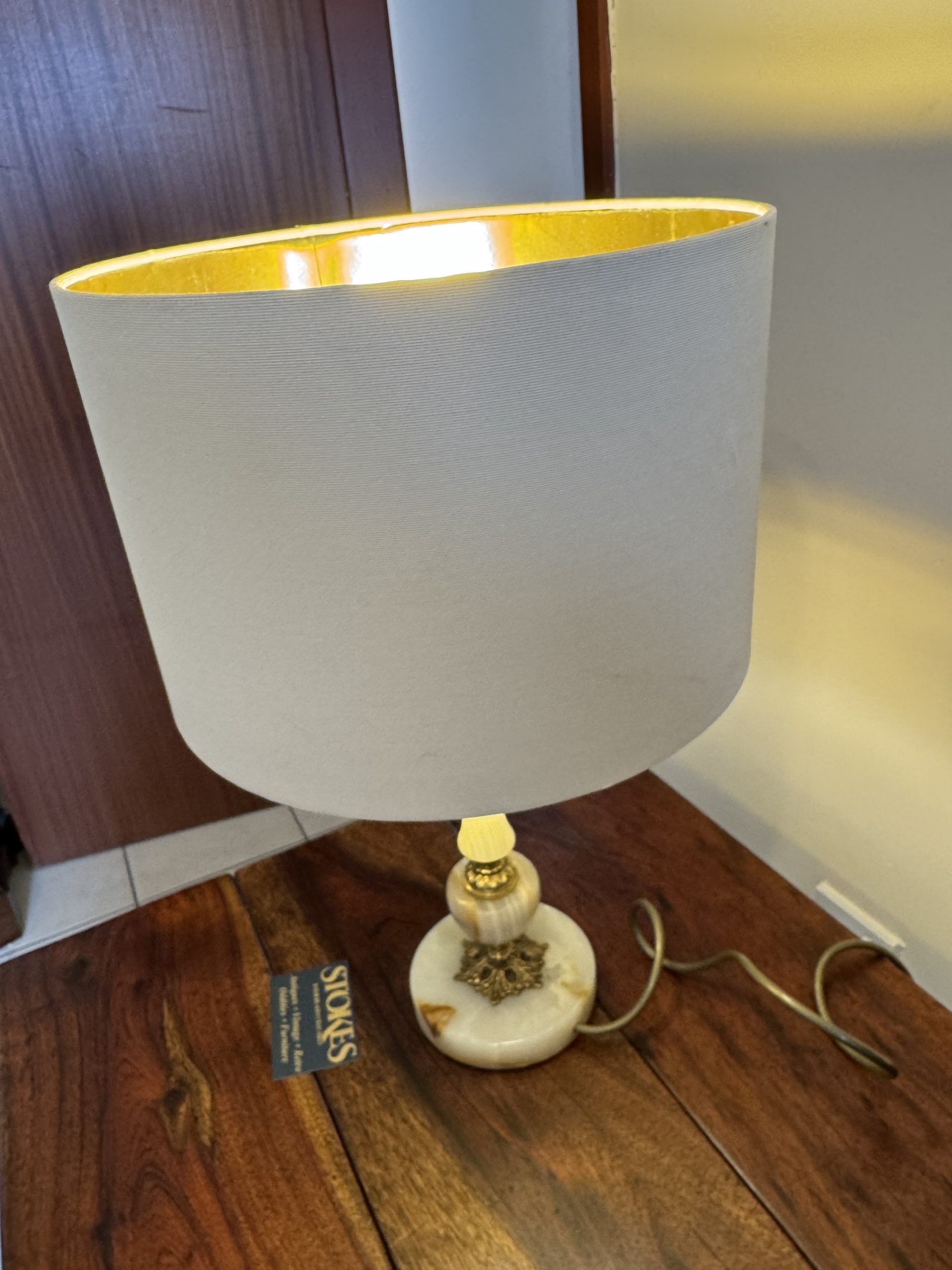 1950’s onyx and brass lamp stacked turned sections of onyx with ornate brass fittings with cream gold lined lamp shade.