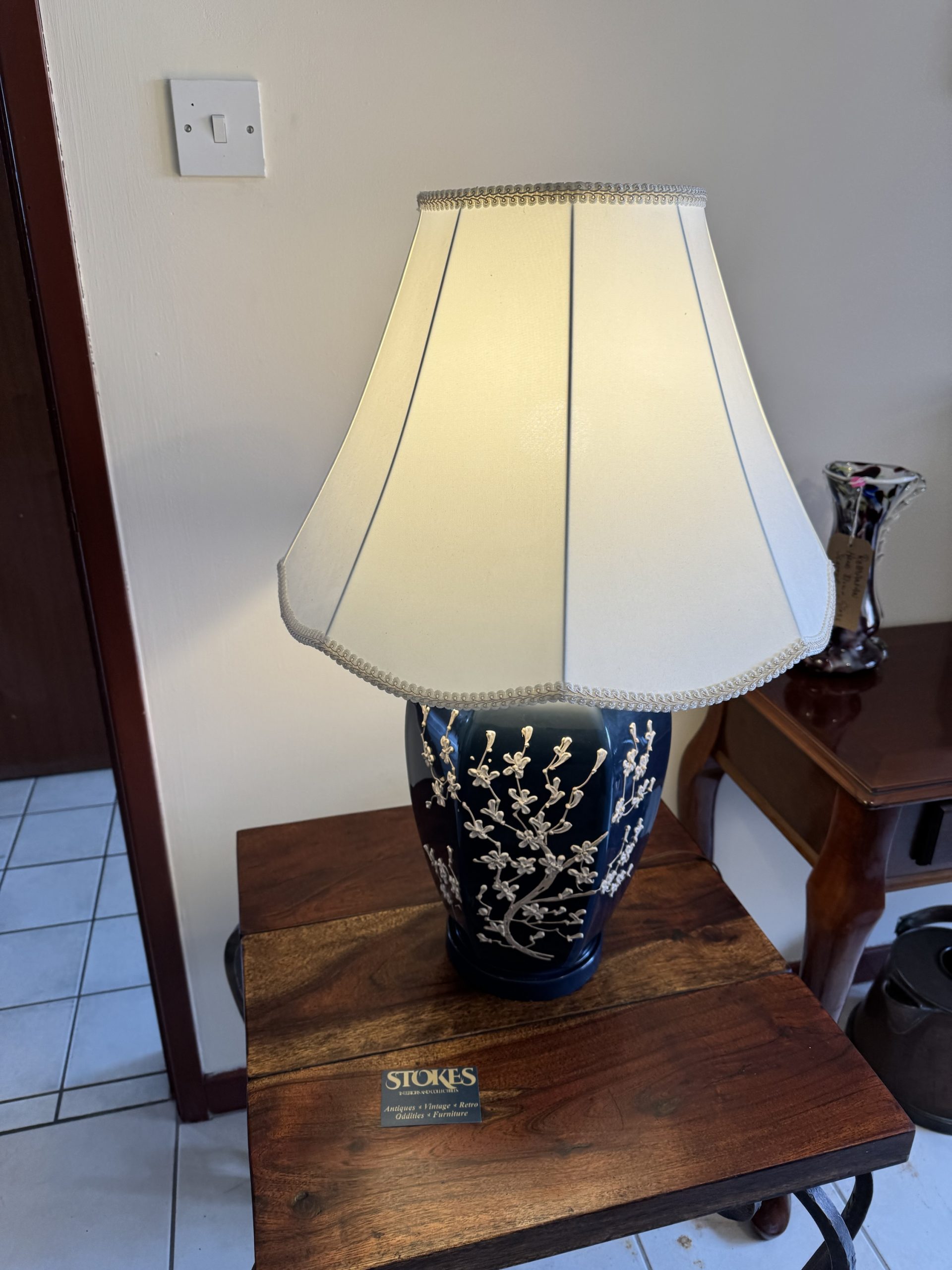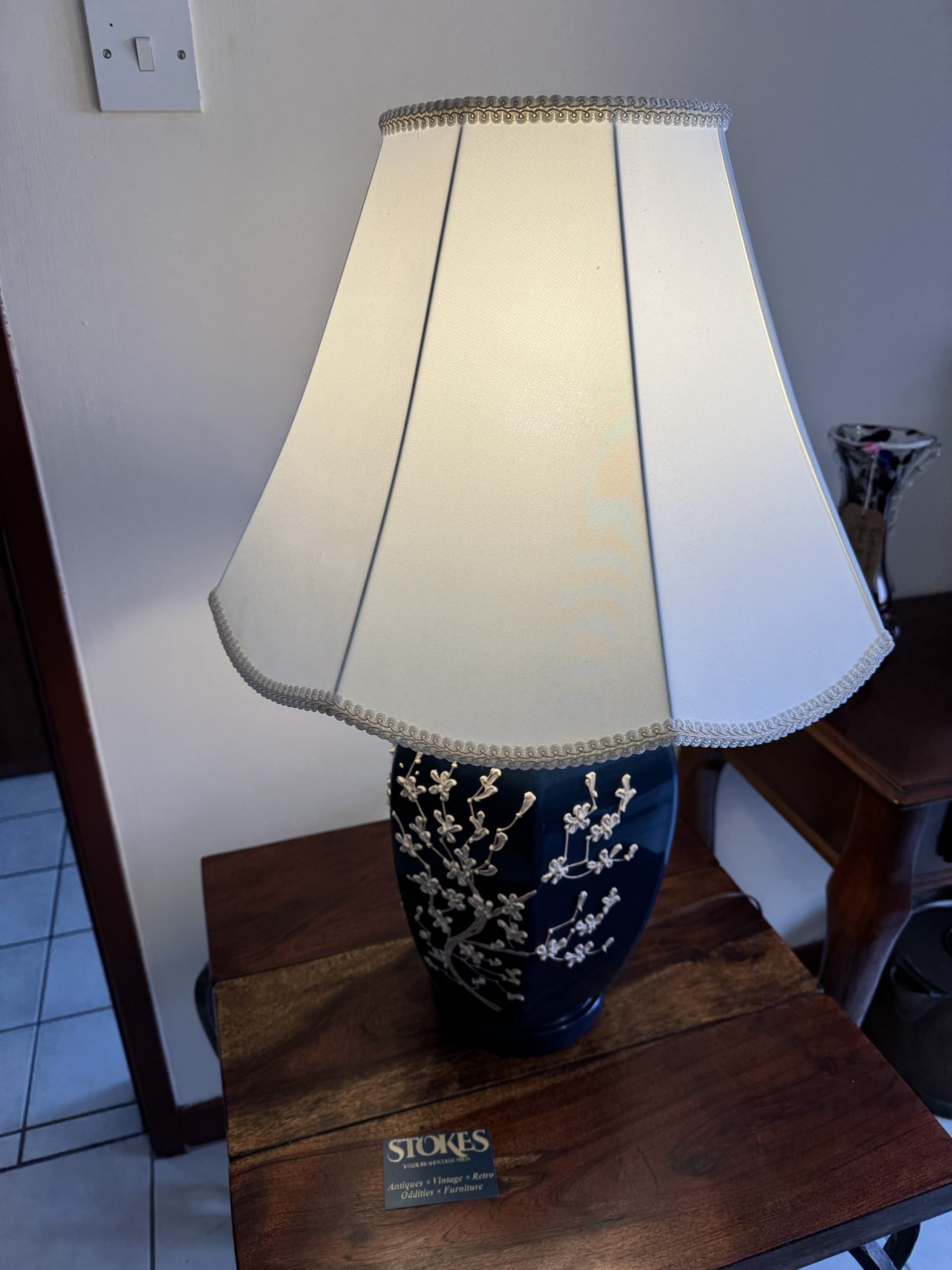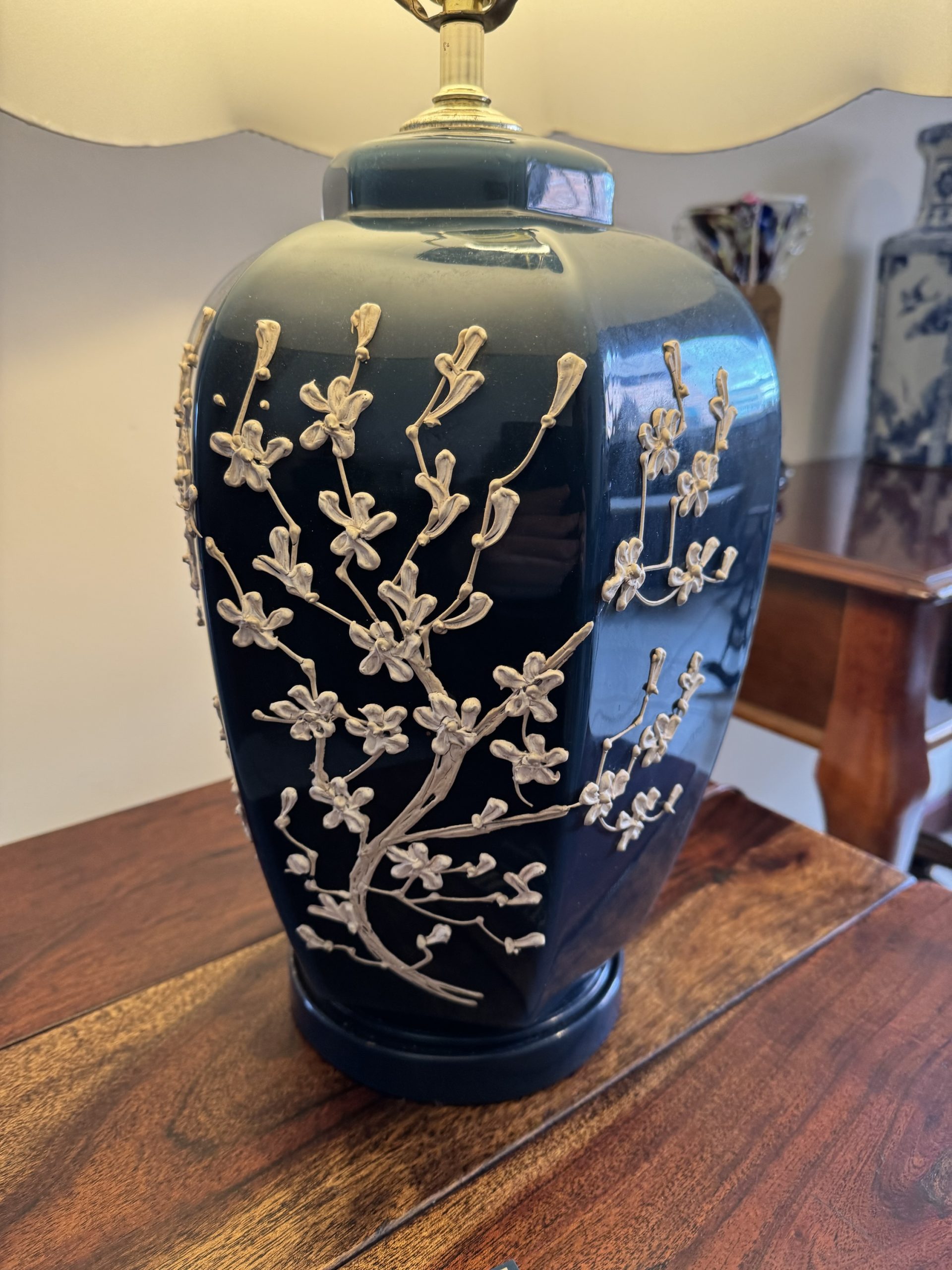 Mid 20th century ceramic dark blue table lamp with raised white blossom cherry floral relief