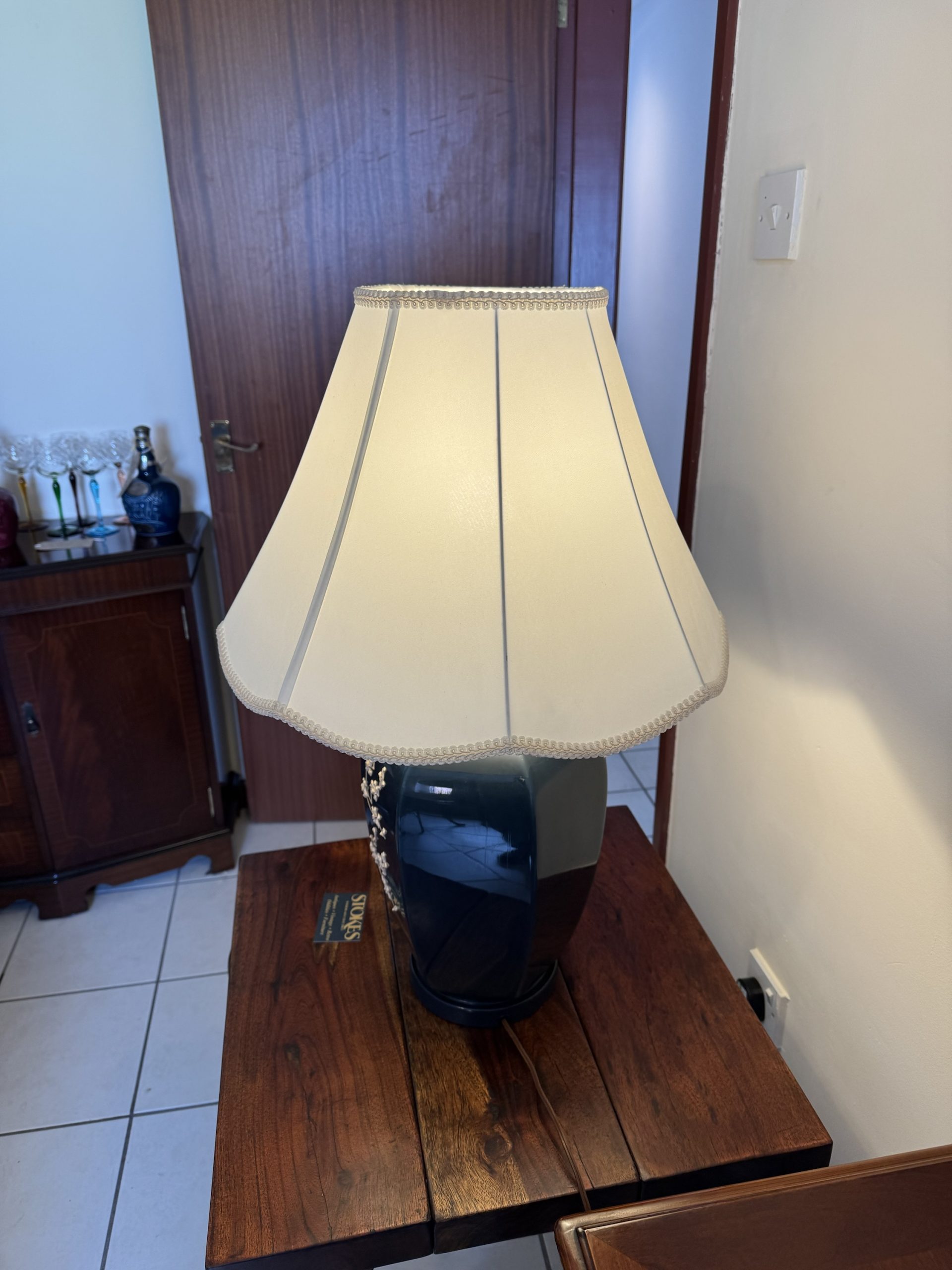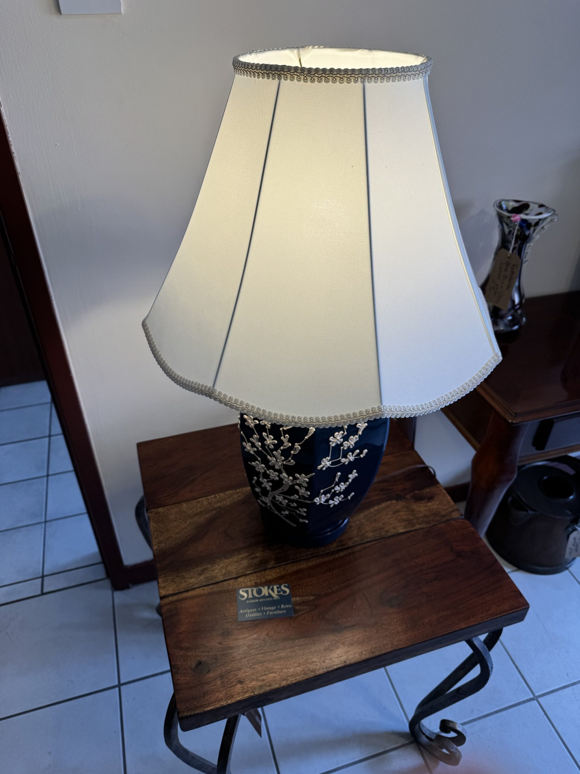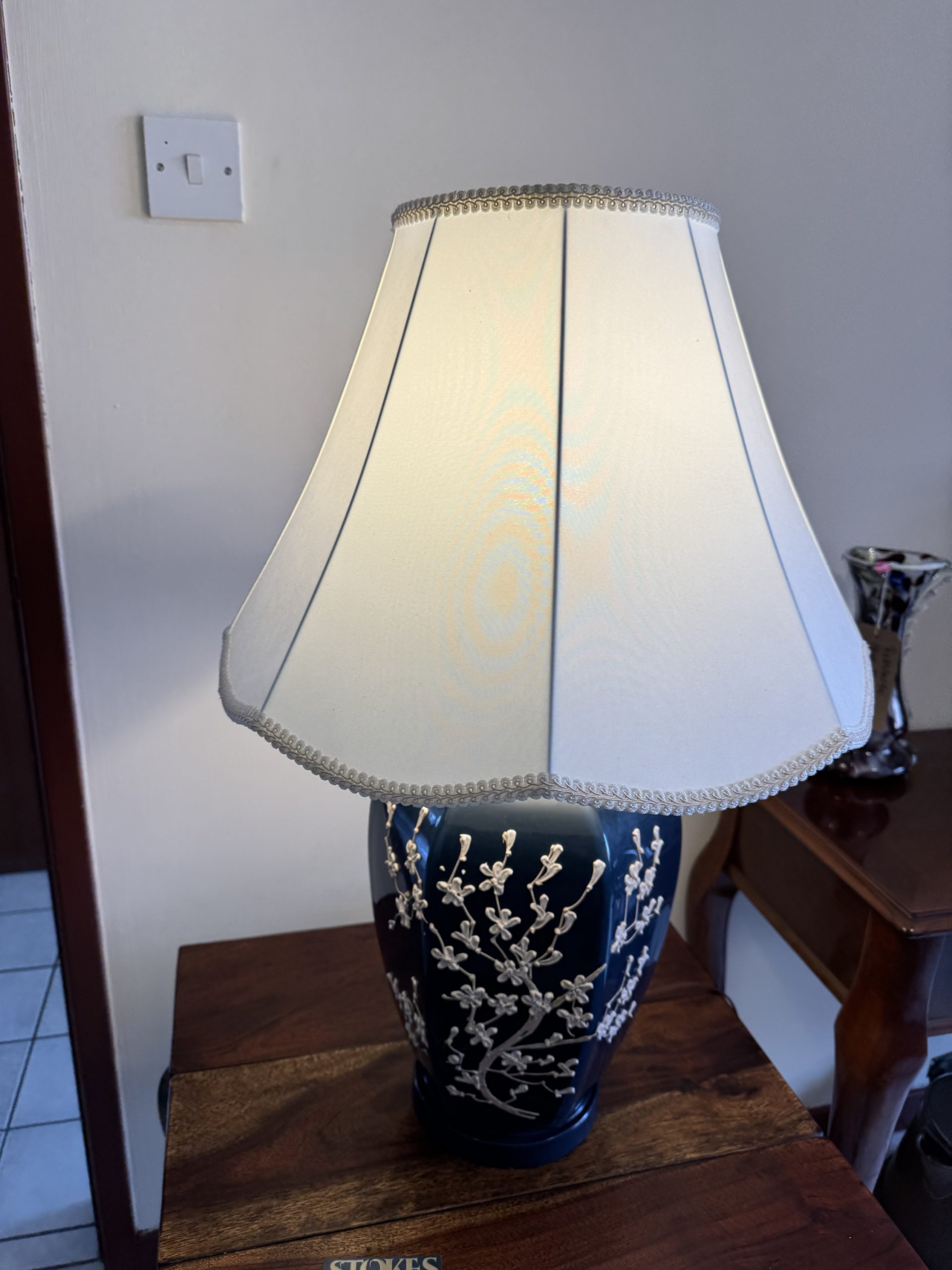 Mid 20th century ceramic dark blue table lamp with raised white blossom cherry floral relief