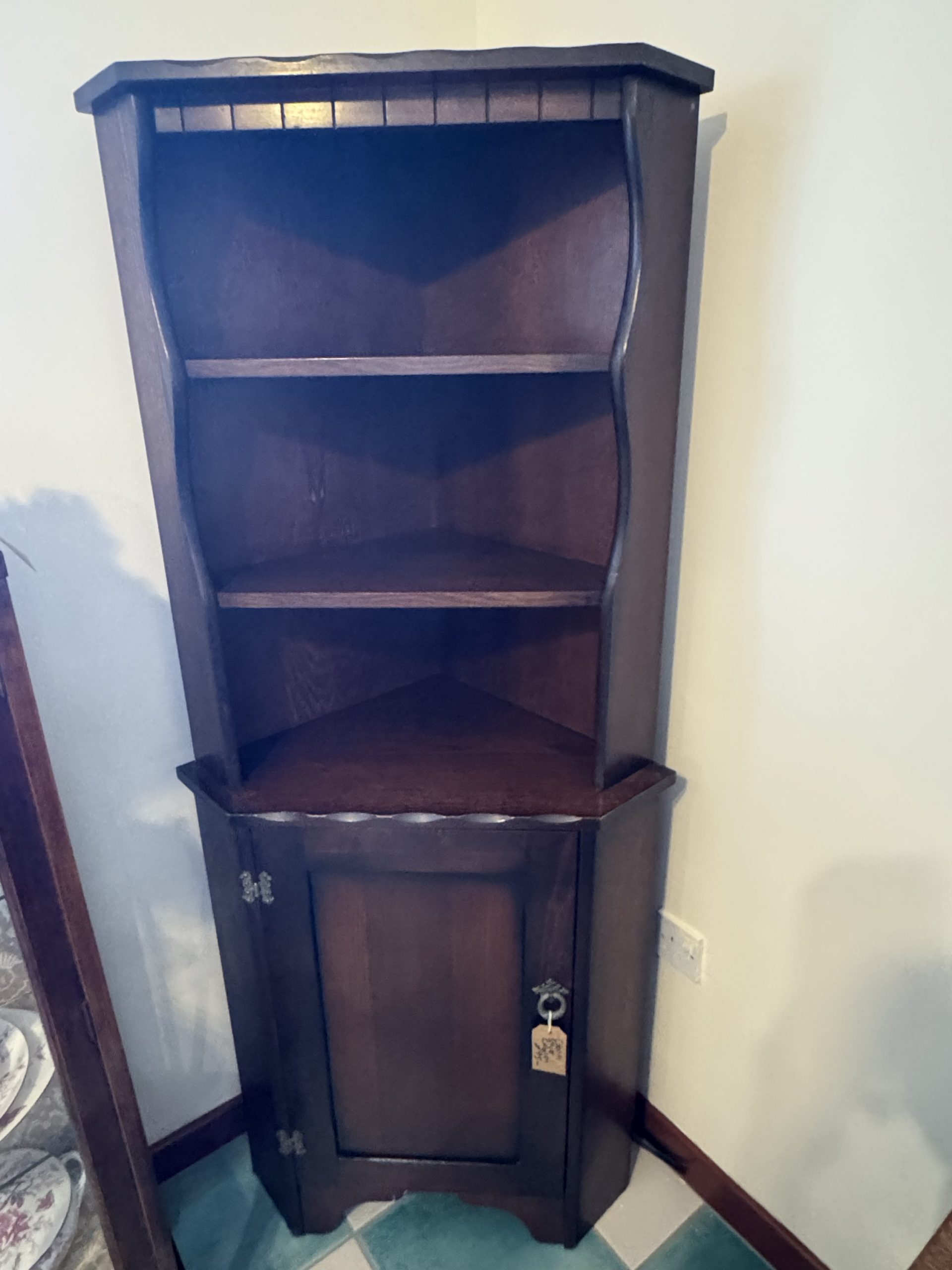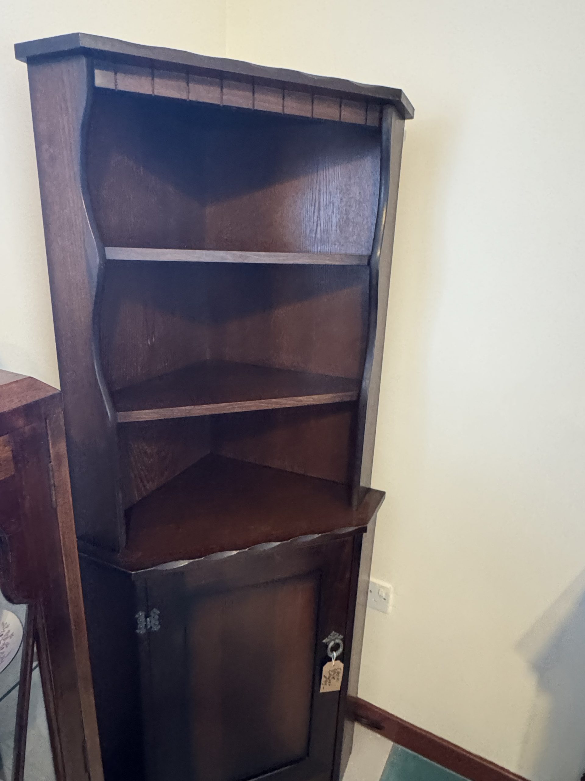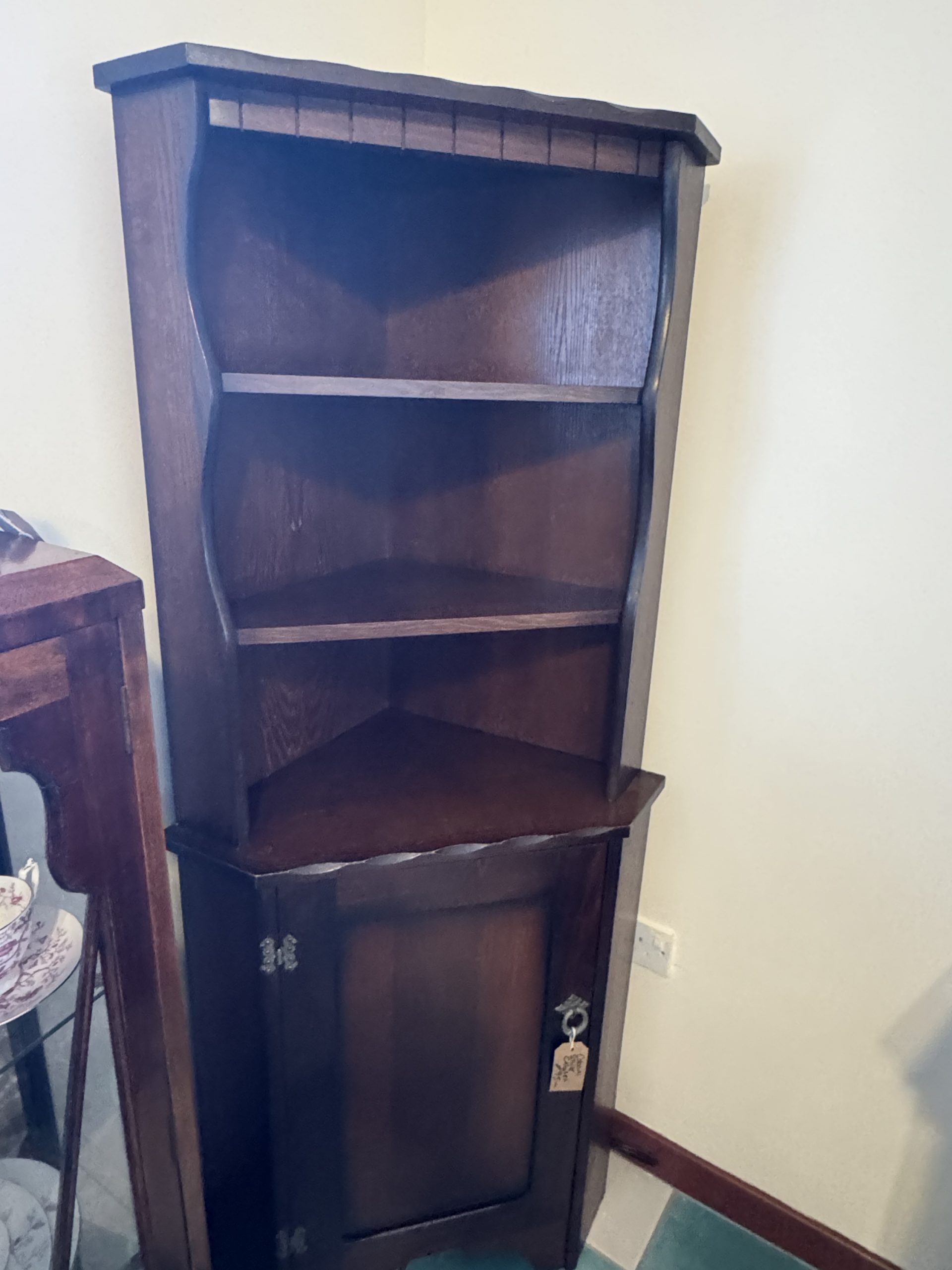 Mid 20th century dark wood corner cabinet consisting of top shelving and base cupboard. Carved decoration and brass detailing.