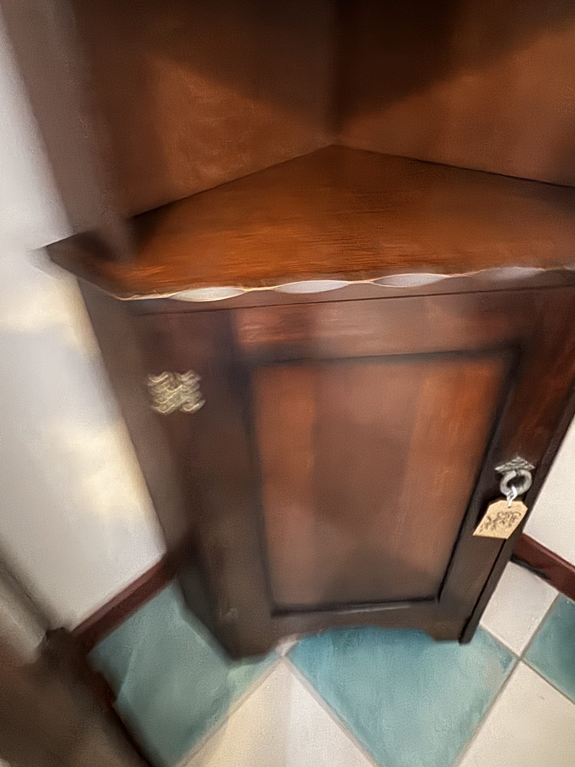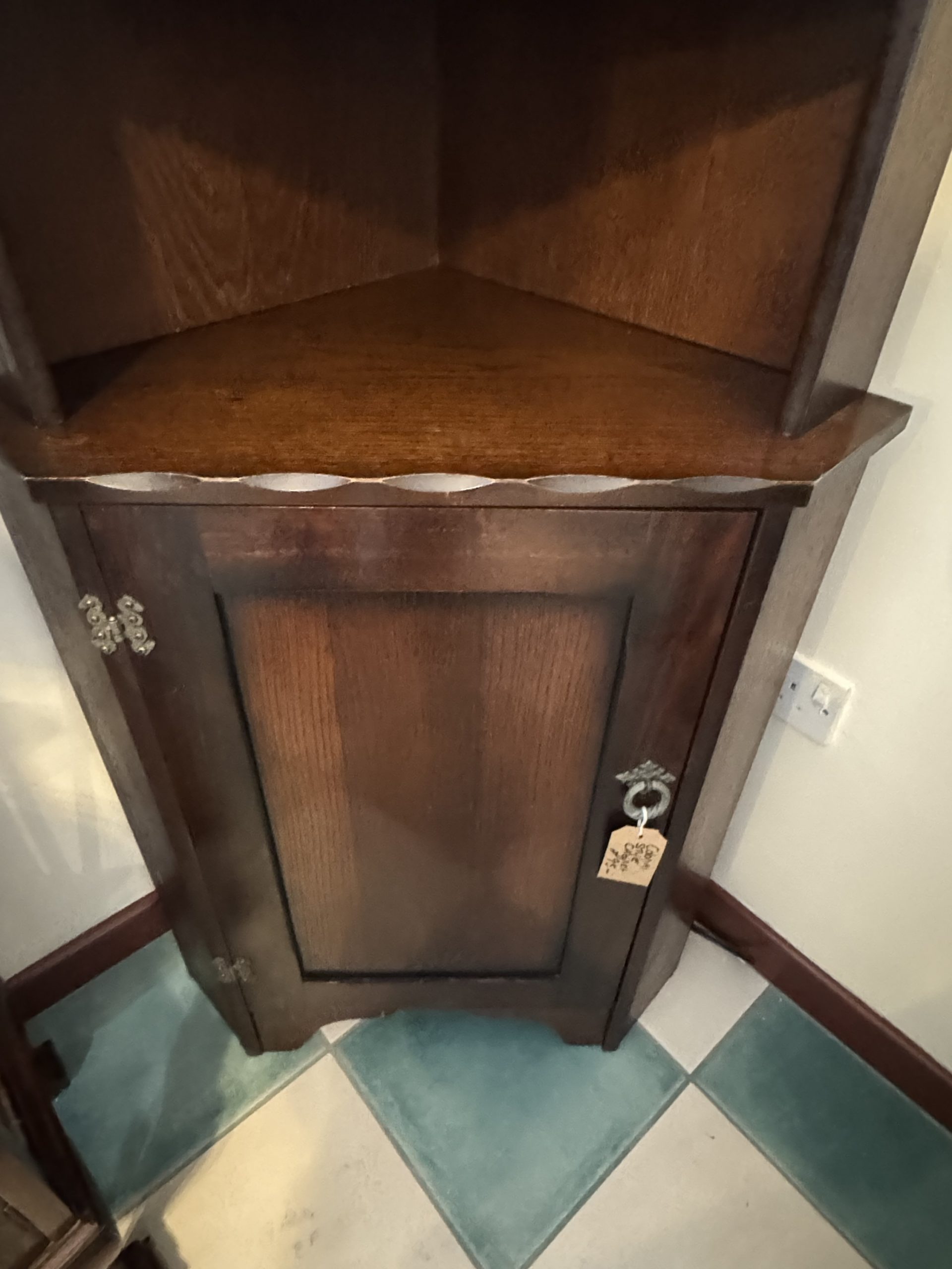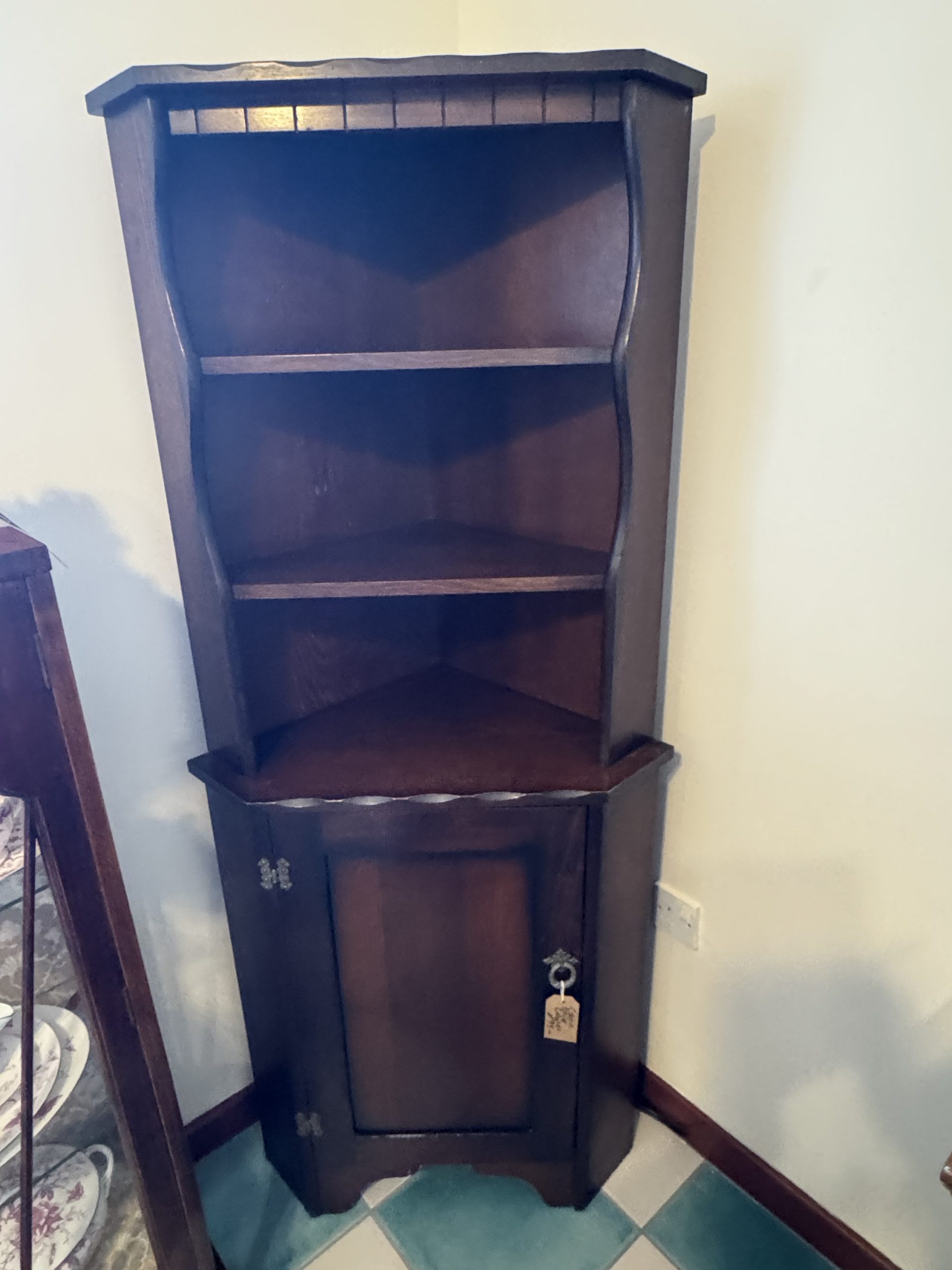 Mid 20th century dark wood corner cabinet consisting of top shelving and base cupboard. Carved decoration and brass detailing.