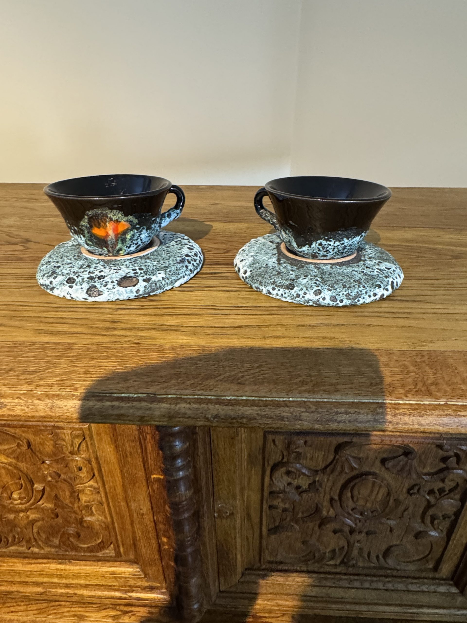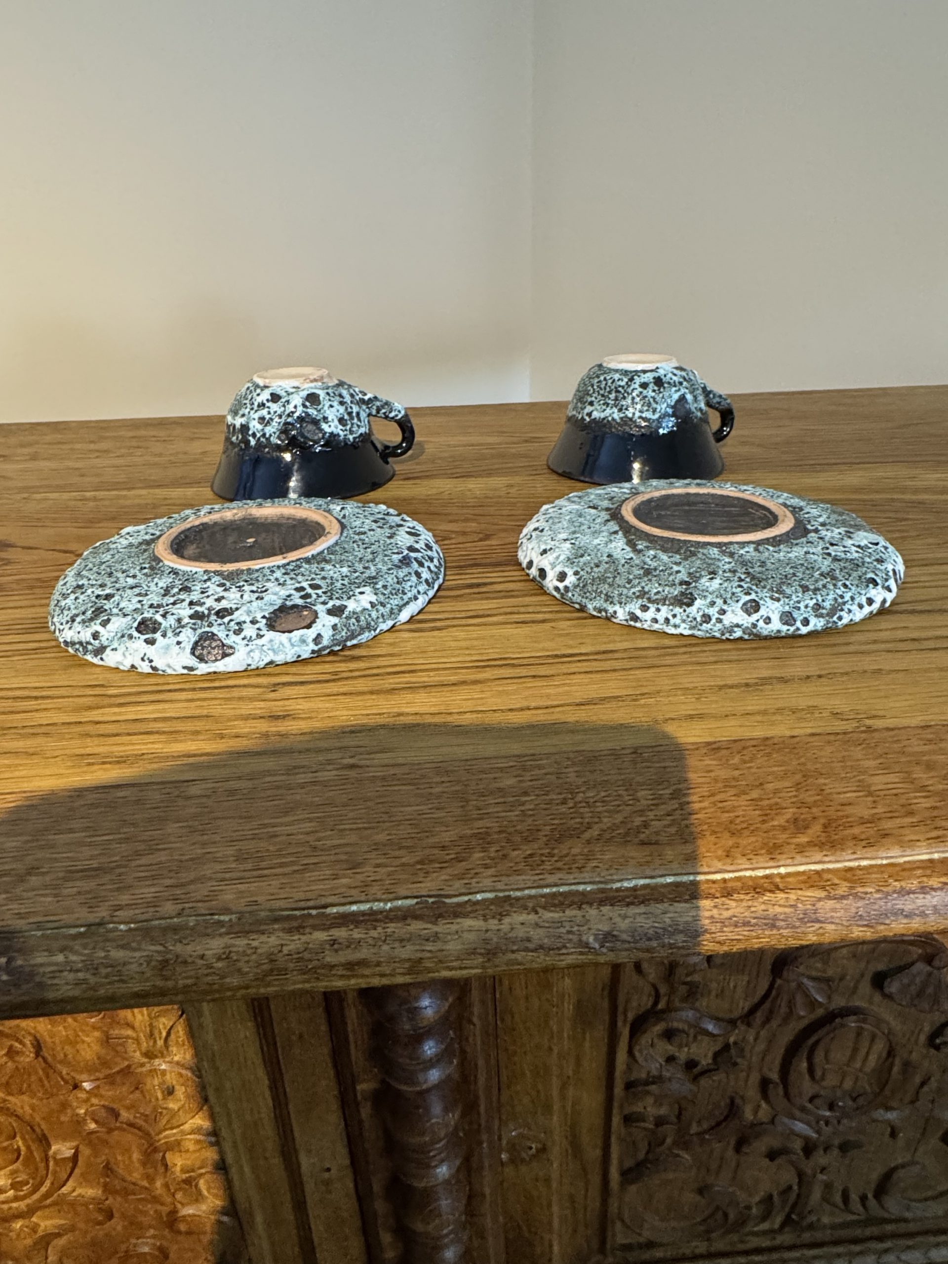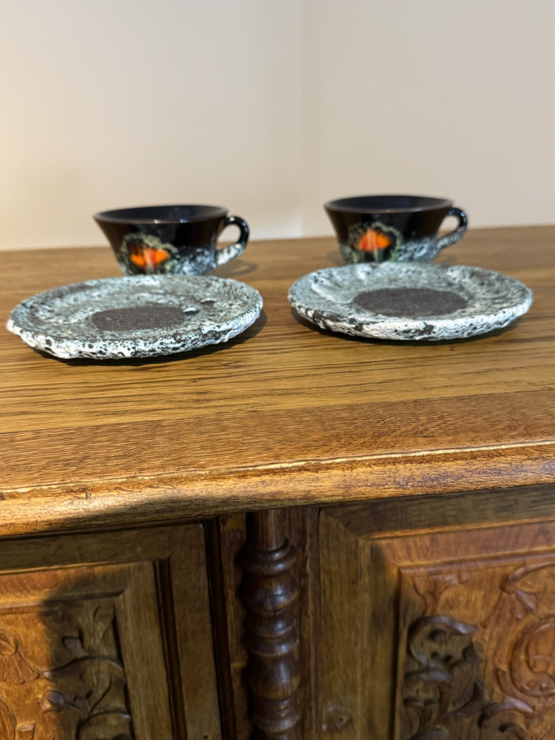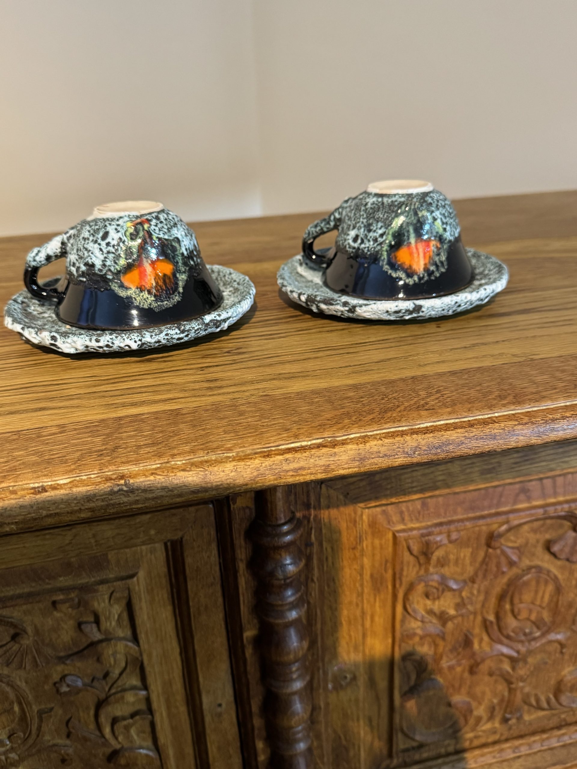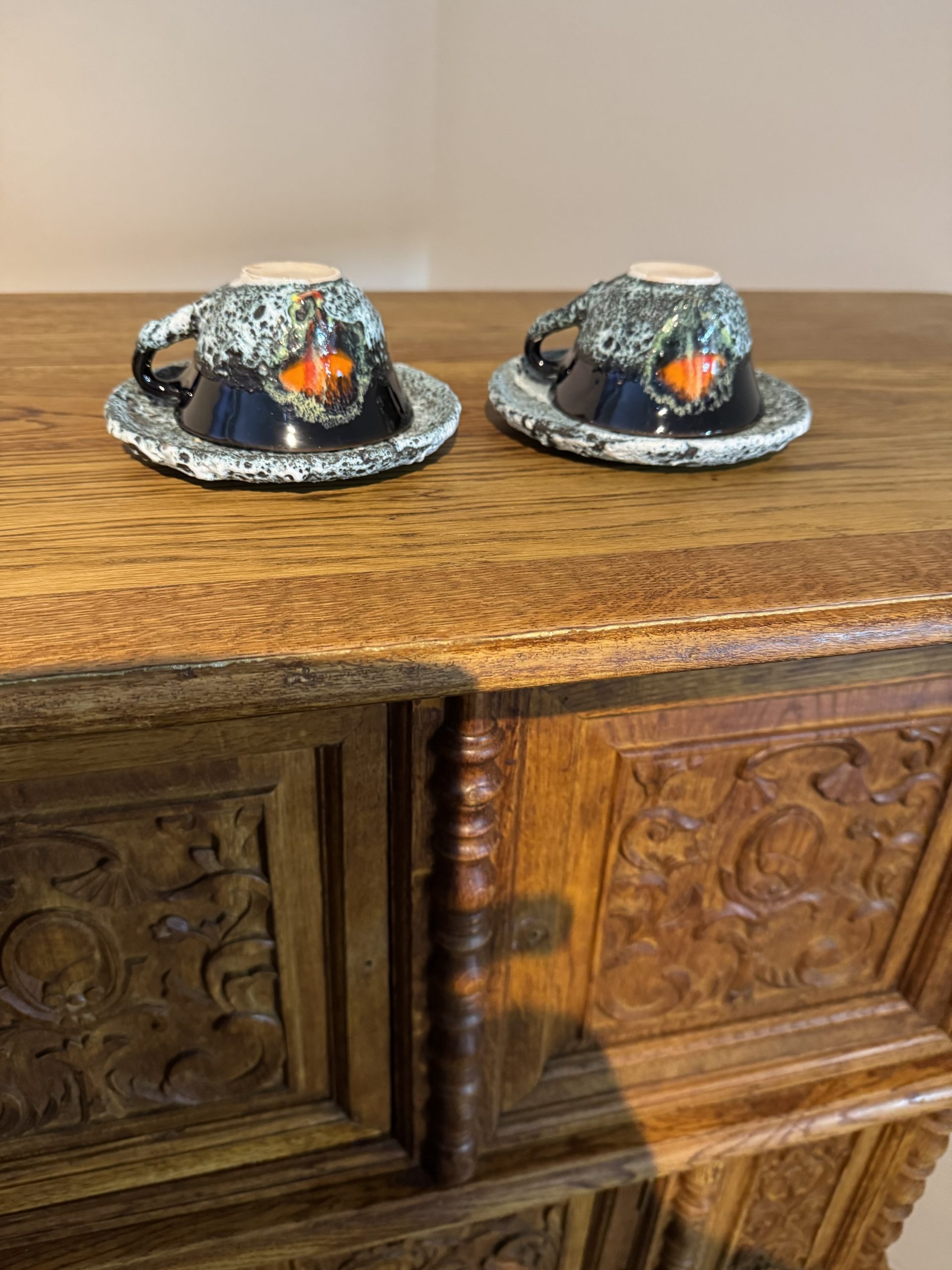 1950’s-1960’s Fat Lava teacups and saucer set consisting of 2 x cup and 2 x saucer. Typical Fat Lava style if Volcanic drip glazed with black and green textured finish with bright orange accents