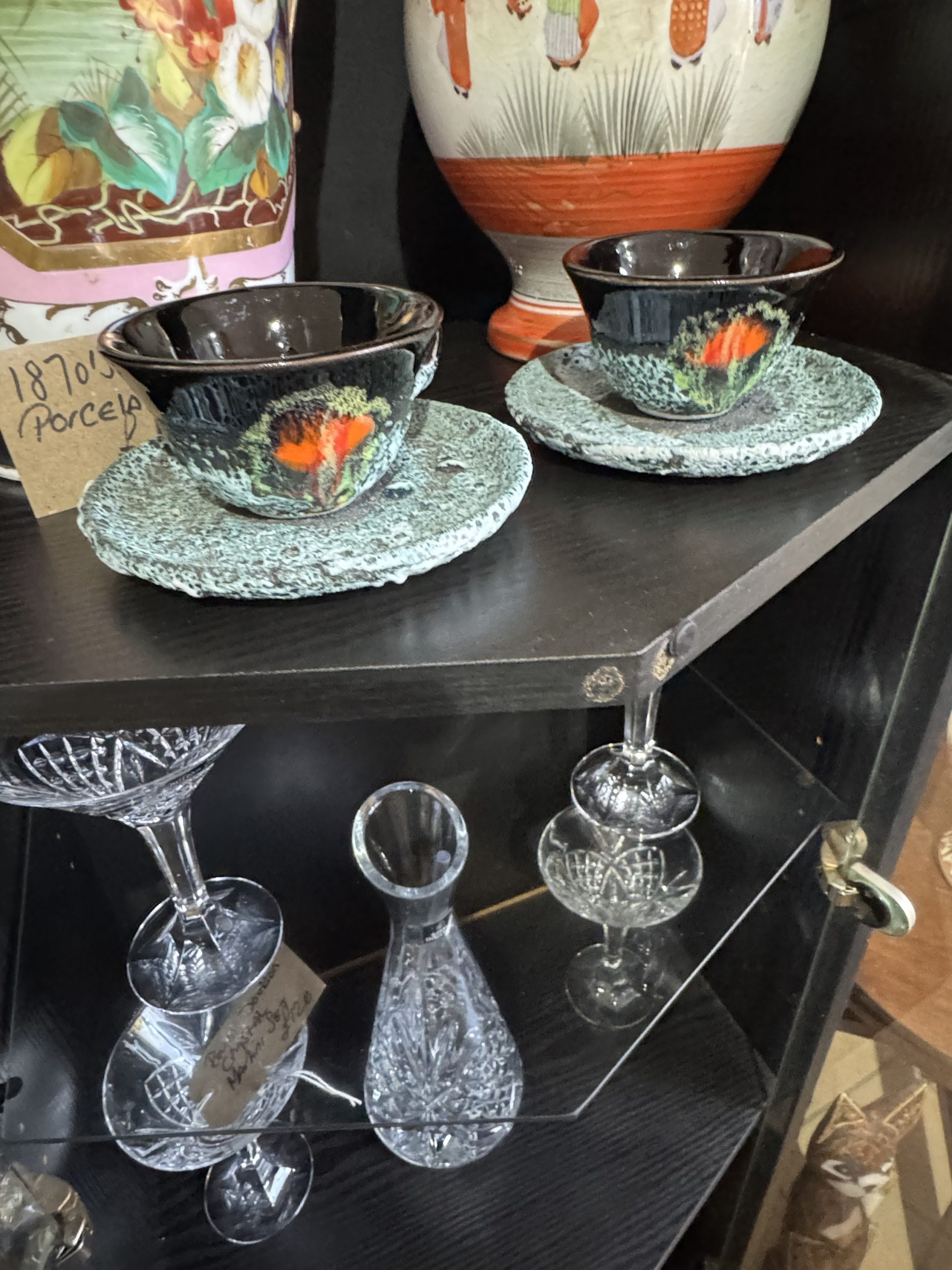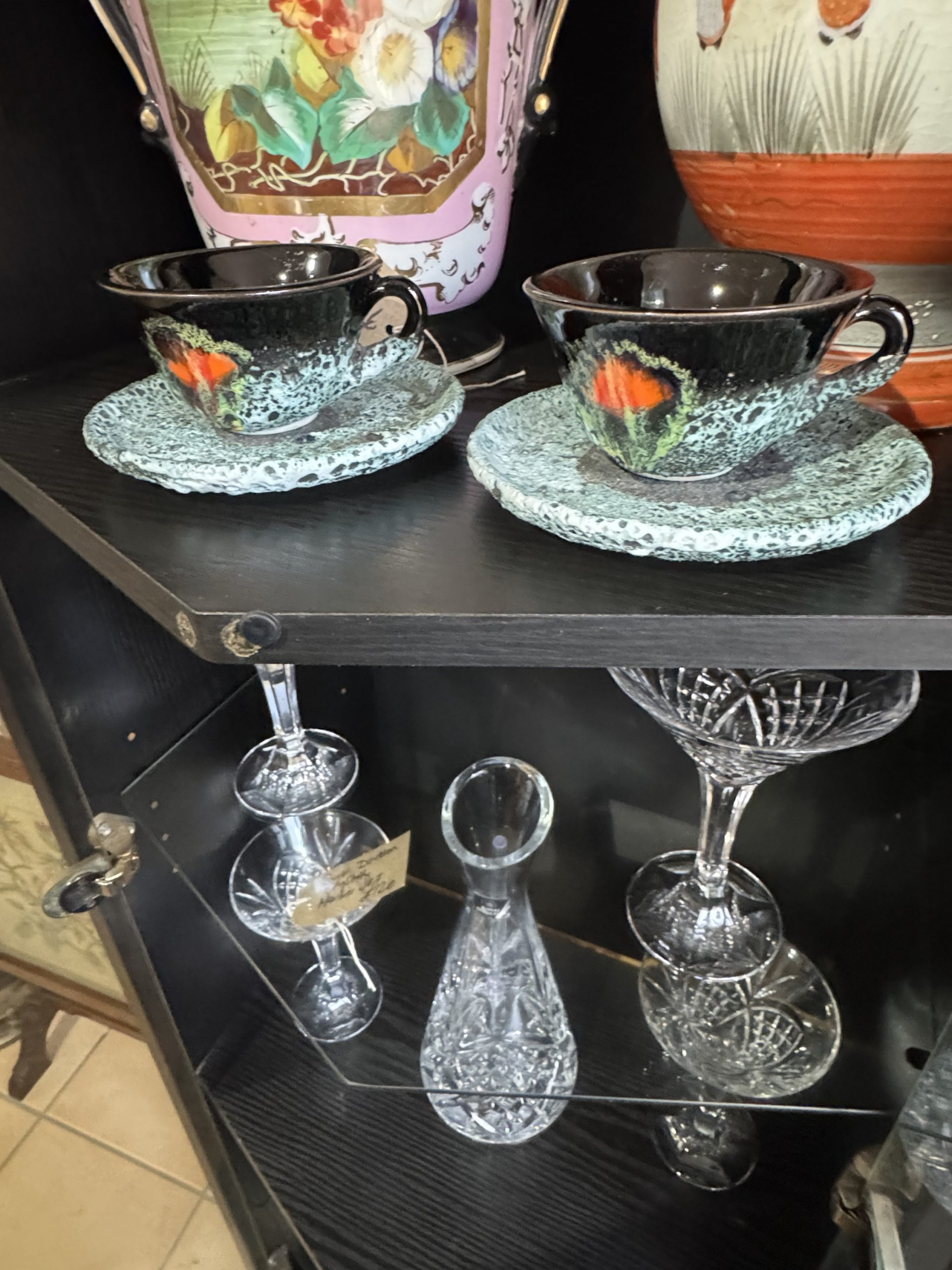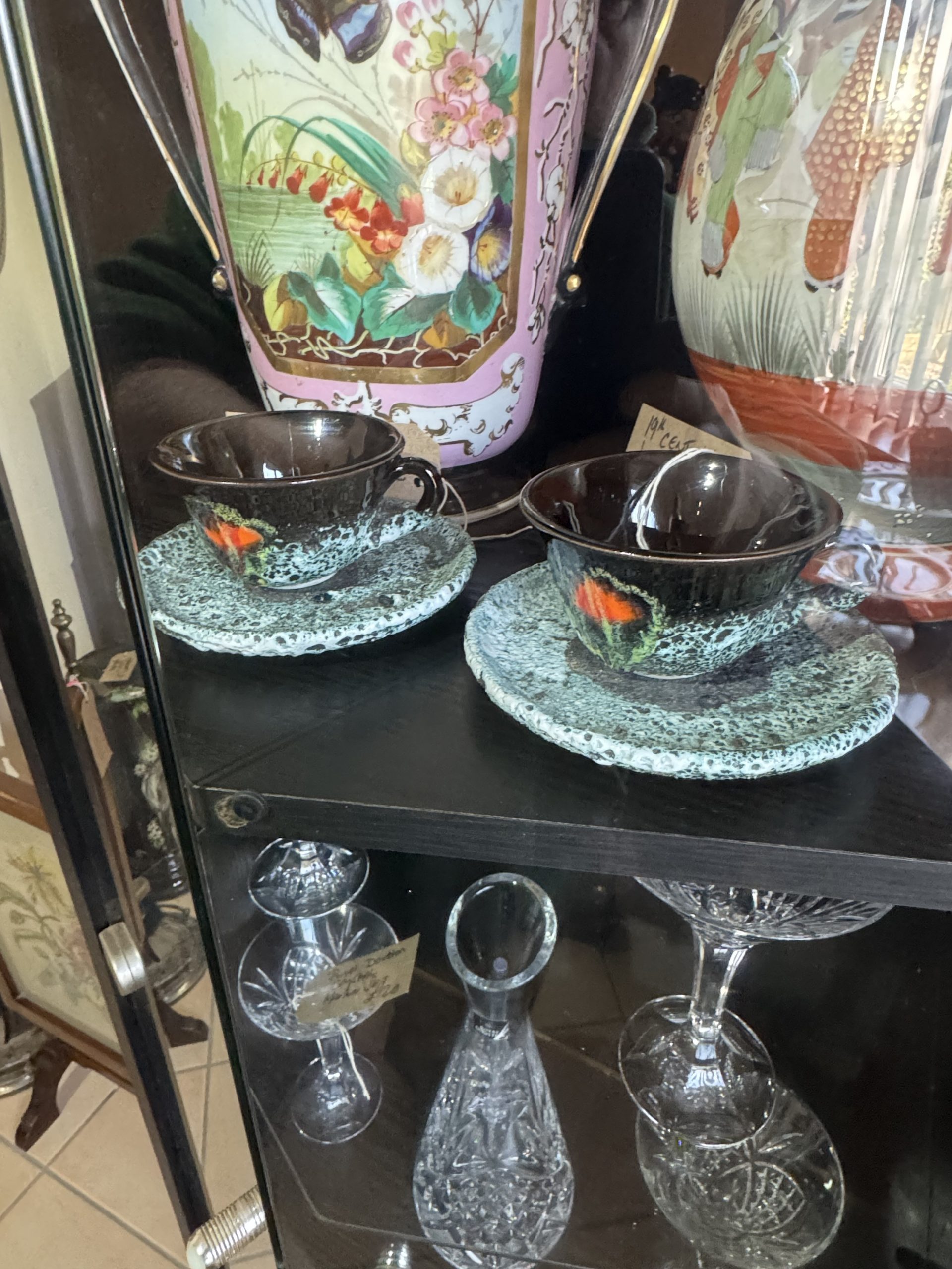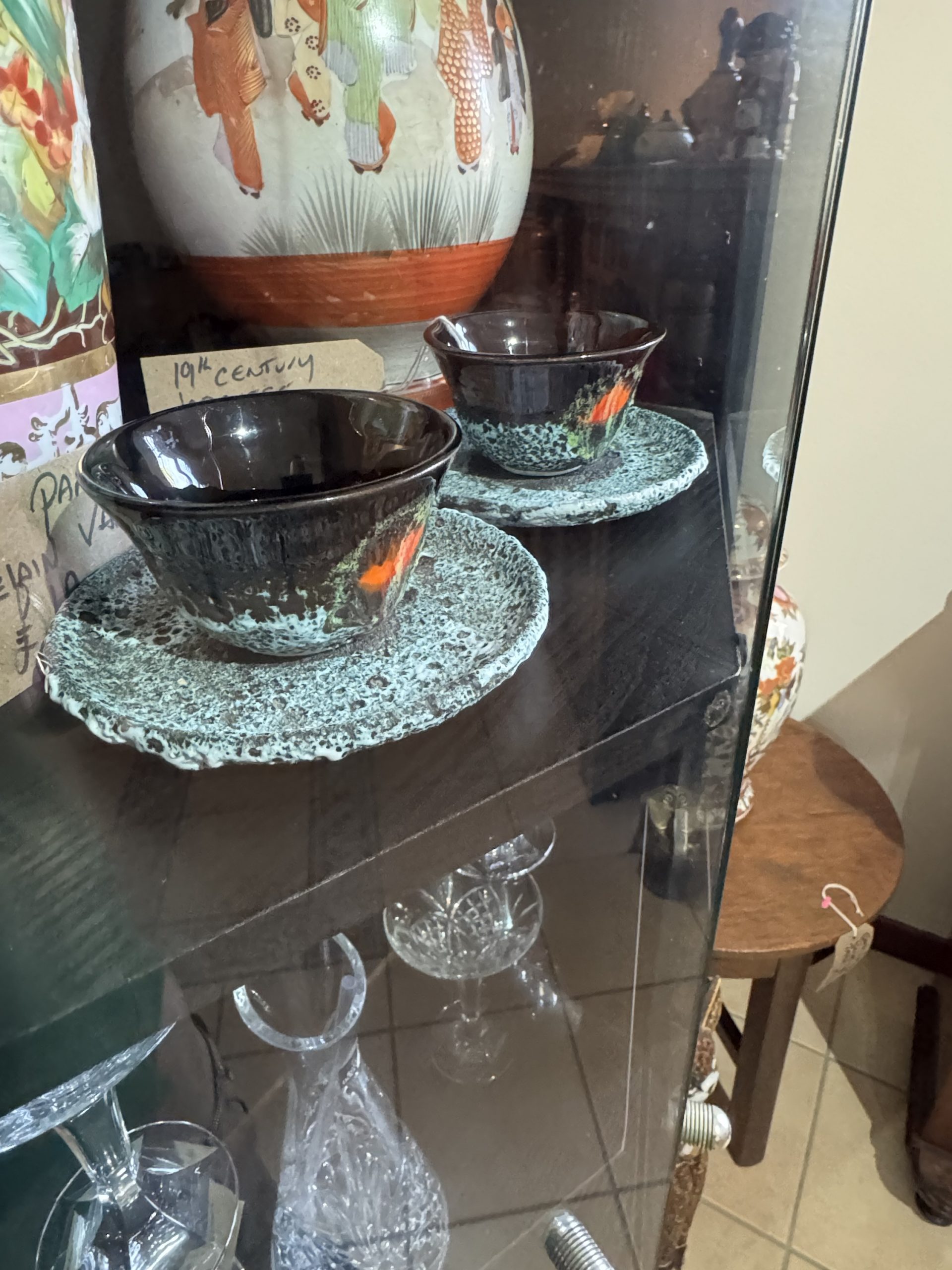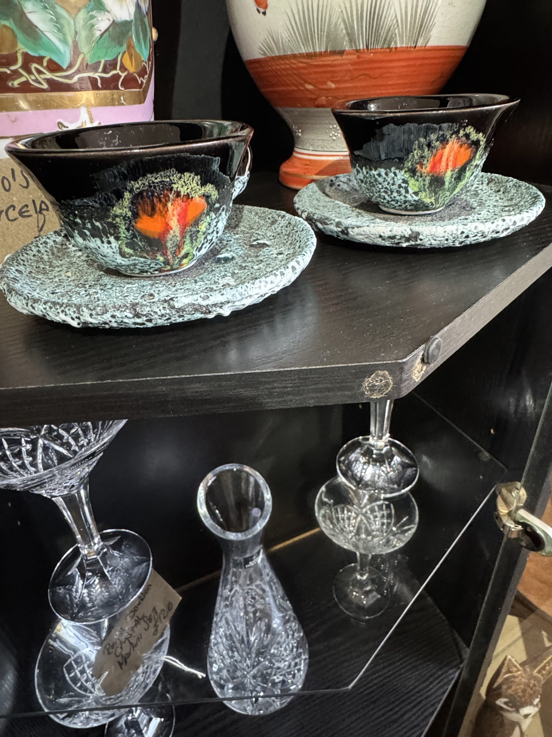 1950’s-1960’s Fat Lava teacups and saucer set consisting of 2 x cup and 2 x saucer. Typical Fat Lava style if Volcanic drip glazed with black and green textured finish with bright orange accents