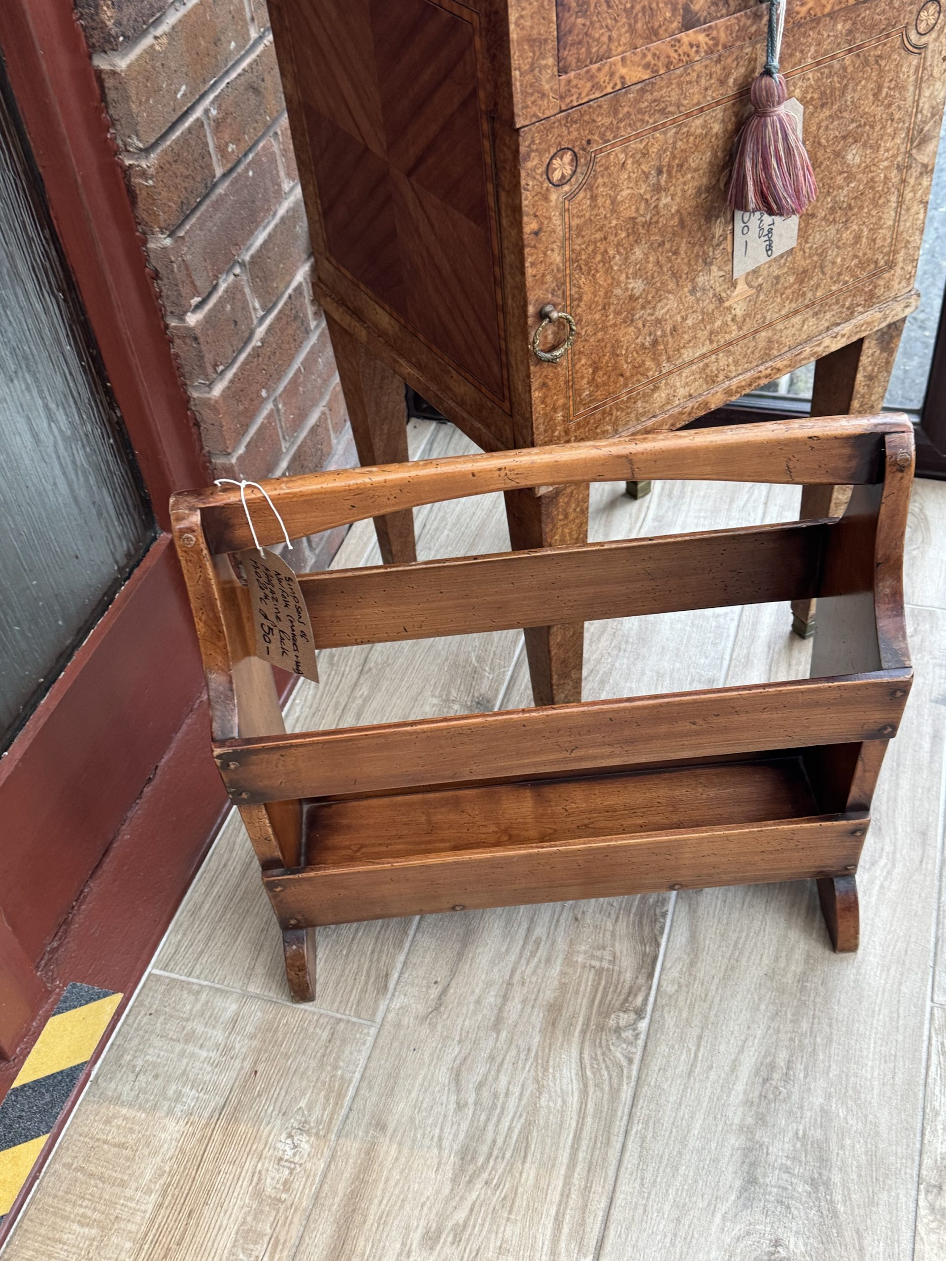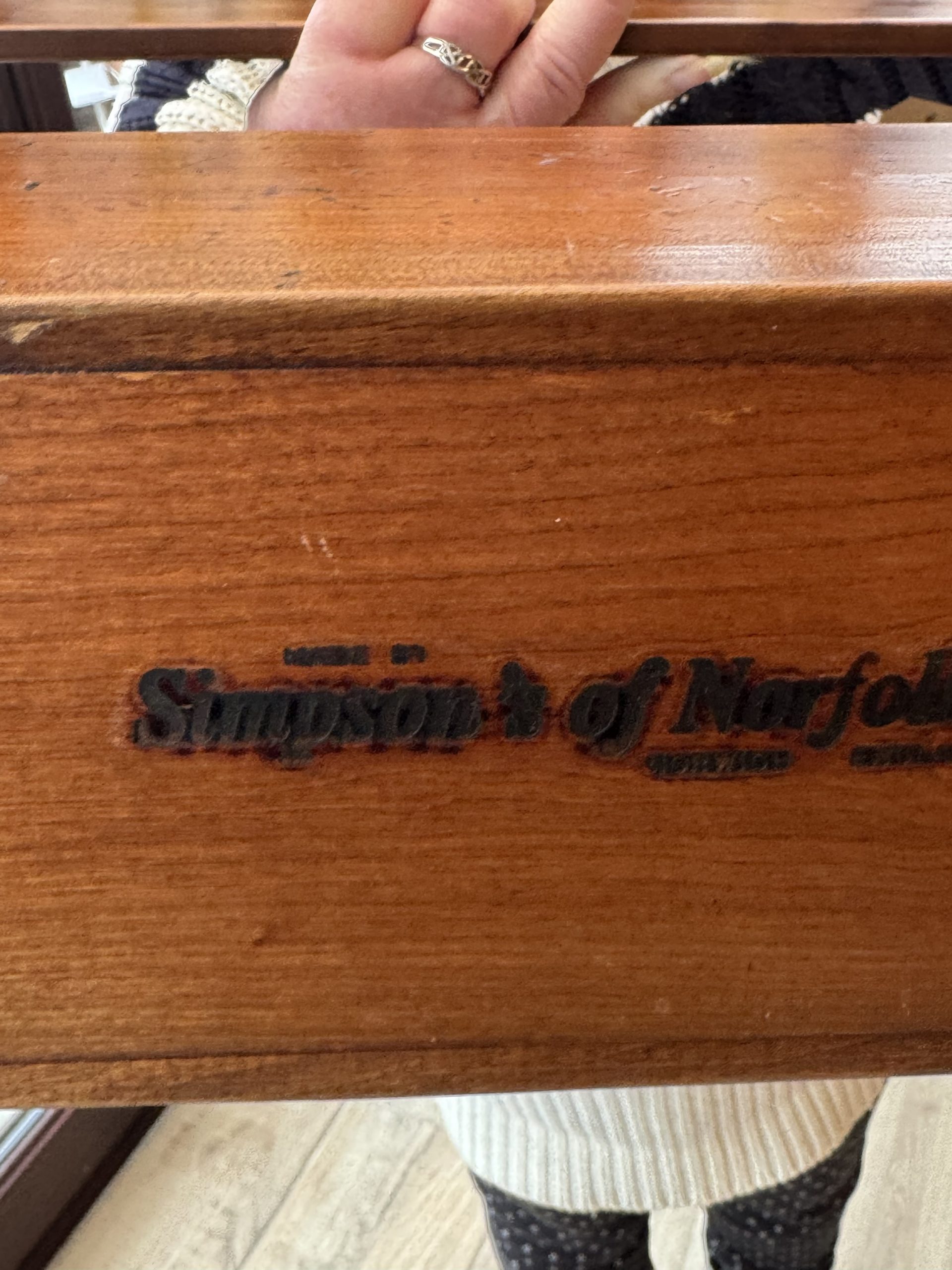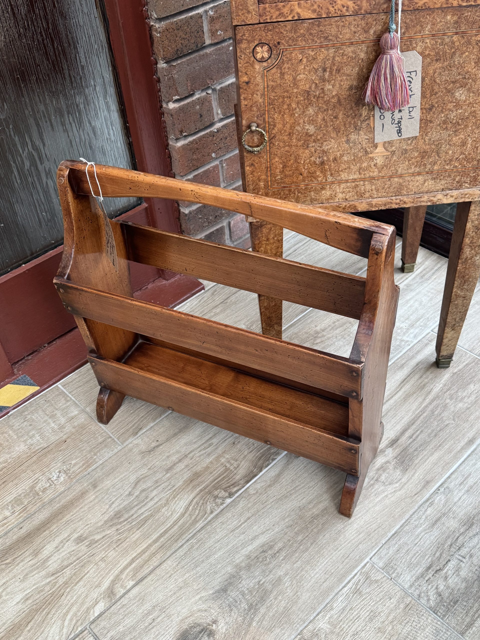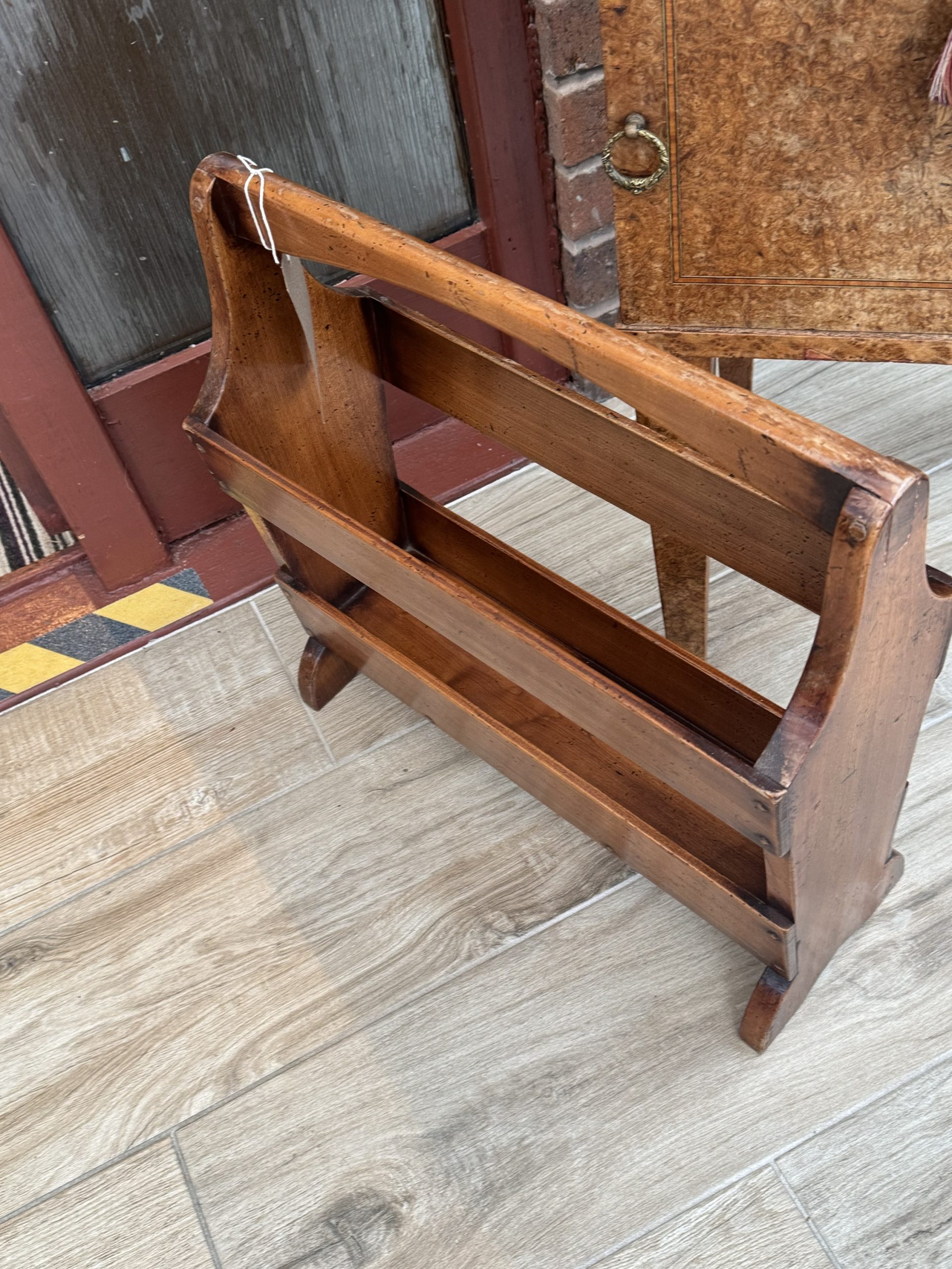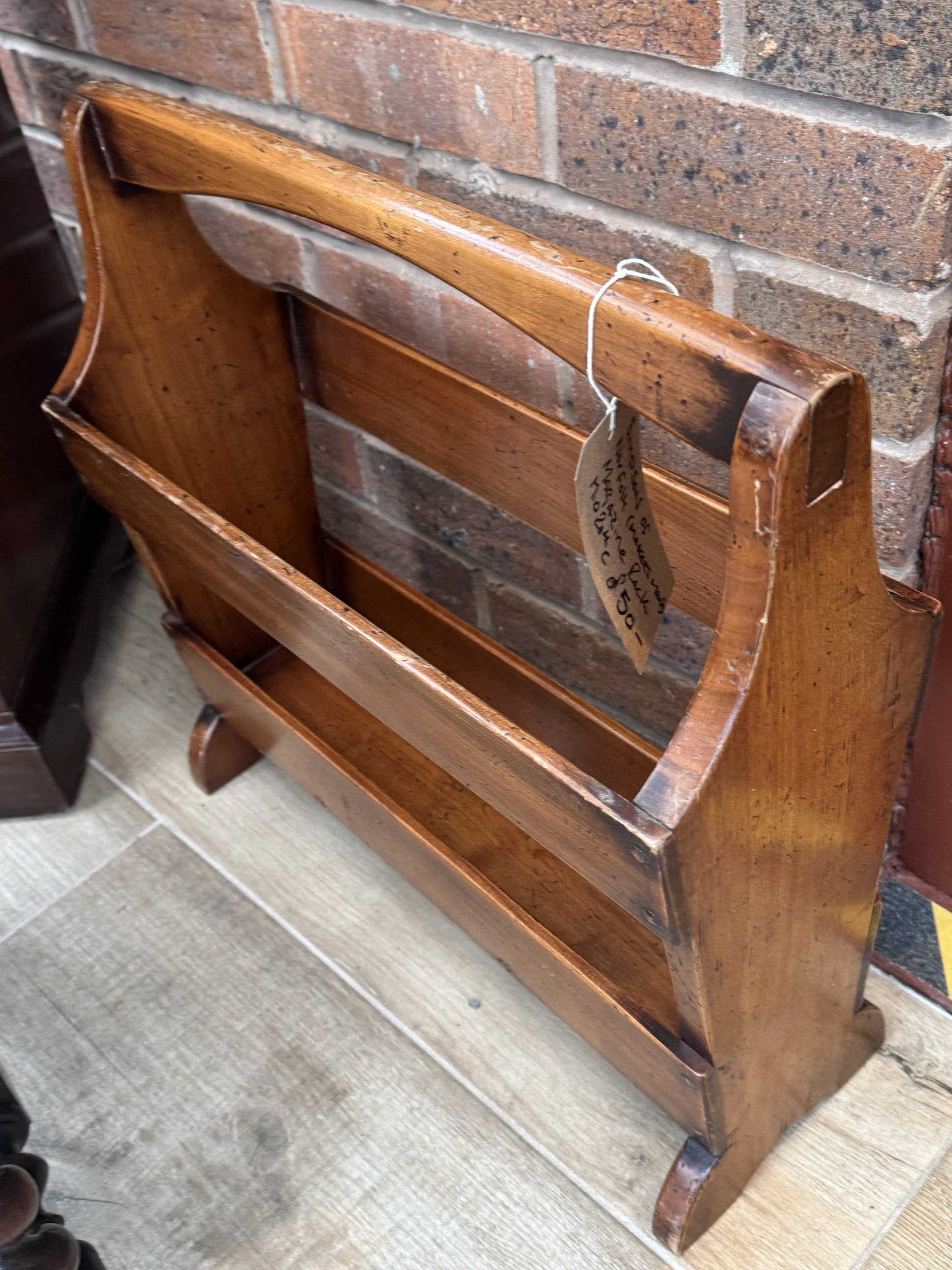 Simpsons of Norfolk wooden magazine with slatted sides and handle. Embossed makers mark on bottom.